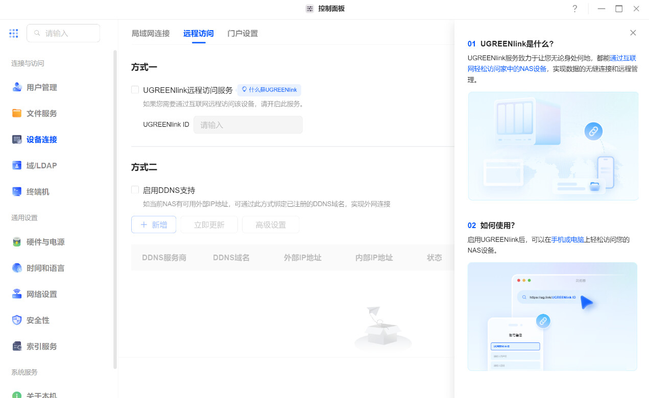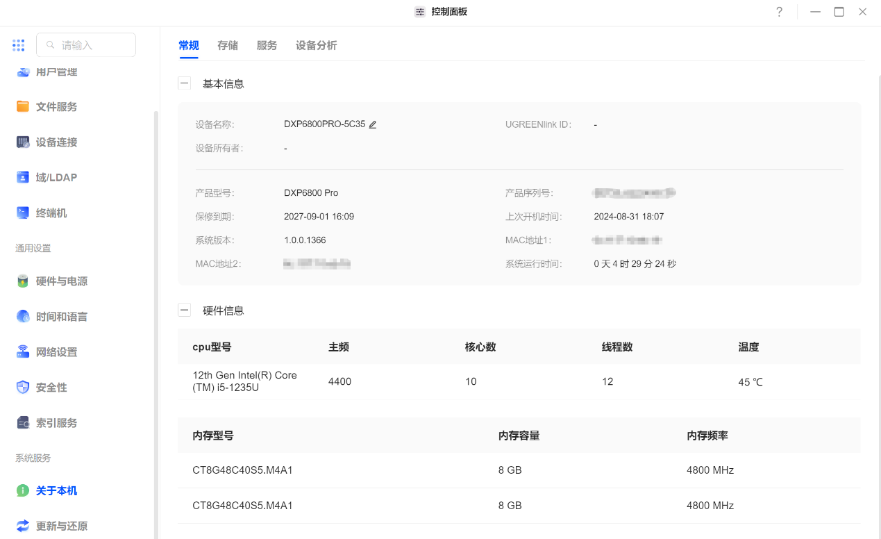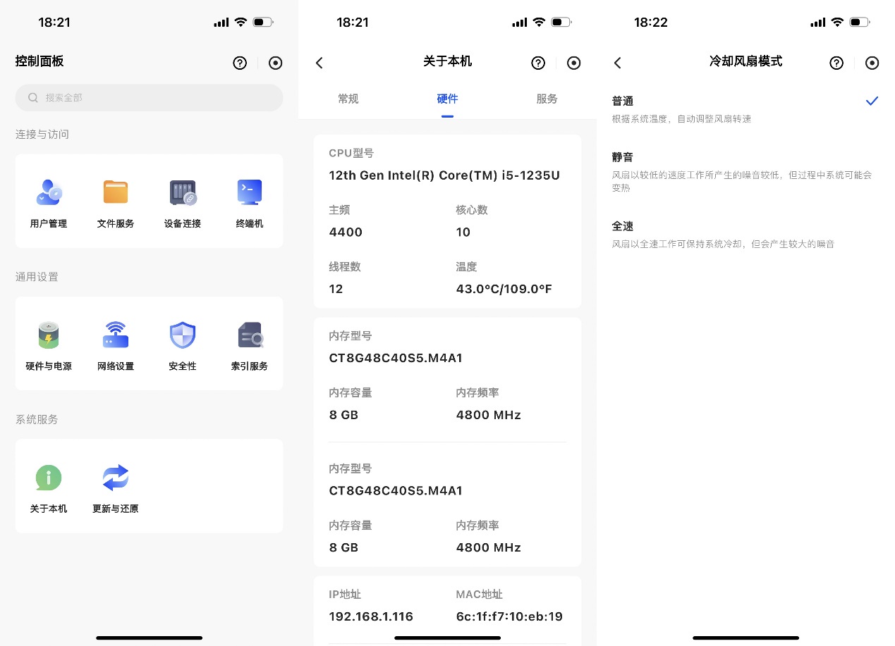 ▲可以直接从网页登录,进入NAS的主页面 ▲存储管理器中可以看到当前所有安装的硬盘状态 ▲有7种存储模式可选,分别是JBOD/Basic/RAID1/RAID5/RAID6/RAID10/RAID0 ▲支持给HDD储存空间创建SSD缓存,读写缓存下只有RAID1一种模式可选,只读缓存条件下可以选择RAID 0和Basic ▲性能选项中可以选择用户读写优先或是RAID同步优先 ▲配置外部USB存储设备的接入许可 ▲控制面板页面 ▲通过外网访问NAS设备可以使用绿联的UGREENlink,或者使用DDNS的方式 ▲支持SMB3多通道功能 ▲风扇模式有三种,普通、静音和全速。默认使用普通即可,风扇会根据系统温度自动调节转速 ▲网卡支持10Gbps速率;双10G网口也支持链路聚合和桥接功能。 ▲本机信息一览;CPU型号是i5-1235U,10核心12线程;自带DDR5 8G 4800MHz内存,这里为了测试为其准备了英睿达2 x DDR5 8G 4800MHz ▲系统更新和还原 ▲应用中心;Docker,NAS,虚拟机等常用的APP都有了移动APP端