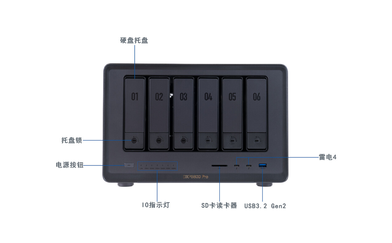 ▲绿联NAS私有云DXP6800 Pro的设计简洁而专业,方正的外观和坚固的铝合金外壳给人留下了深刻的印象。DXP6800 Pro的硬盘托架也设计的非常人性化,每个托架上都标有大数字,并且配备了托架锁,方便用户识别和管理开箱