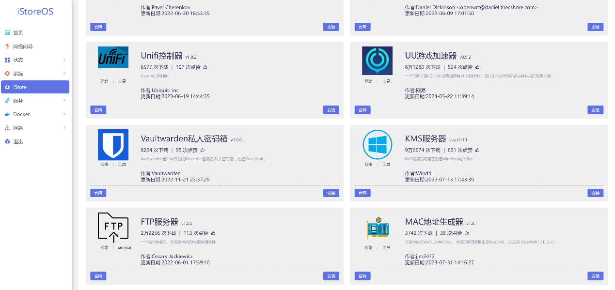 ▲我们可以使用UGOS Pro系统自带的虚拟机来部署一台旁路由来实现自己想要的功能,例如部署一台istore os,由于虚拟机目前只支持ISO和OVA镜像,所以这里我们使用ISO镜像的istore os ▲在koolcenter官网下载ISO镜像的istore os ▲手动上传至NAS ▲从本地电脑上传刚下载的istore os镜像 ▲系统类型选择Linux ▲分配CPU核心数和内存 ▲磁盘选择SATA ▲网络1选择e1000 ▲后面选择vnet-bridge1(即现在nas在用的网口) ▲高级设置中将自动开机打开 ▲以上步骤完成后点击开机 ▲由于NAS和istore os旁路由不互通,所以istore os无法获取IP地址,我们需要手动配置IP,和NAS在同一网段即可 ▲NAS IP是192.168.1.116,我们可以将istore os的IP配置为192.168.1.5 ▲此时网页输入192.168.1.5即可进入istore os ▲点击接口,对LAN进行编辑 ▲填入网关IP和DNS ▲此时istore os就能连接上互联网了 ▲将应用商店更新到最新 ▲此时就可以在应用商店下载自己需要的插件,例如使用Unifi AP的可以使用Unifi控制器来对AP进行管控,需要游戏加速的可以使用UU加速器等等总结