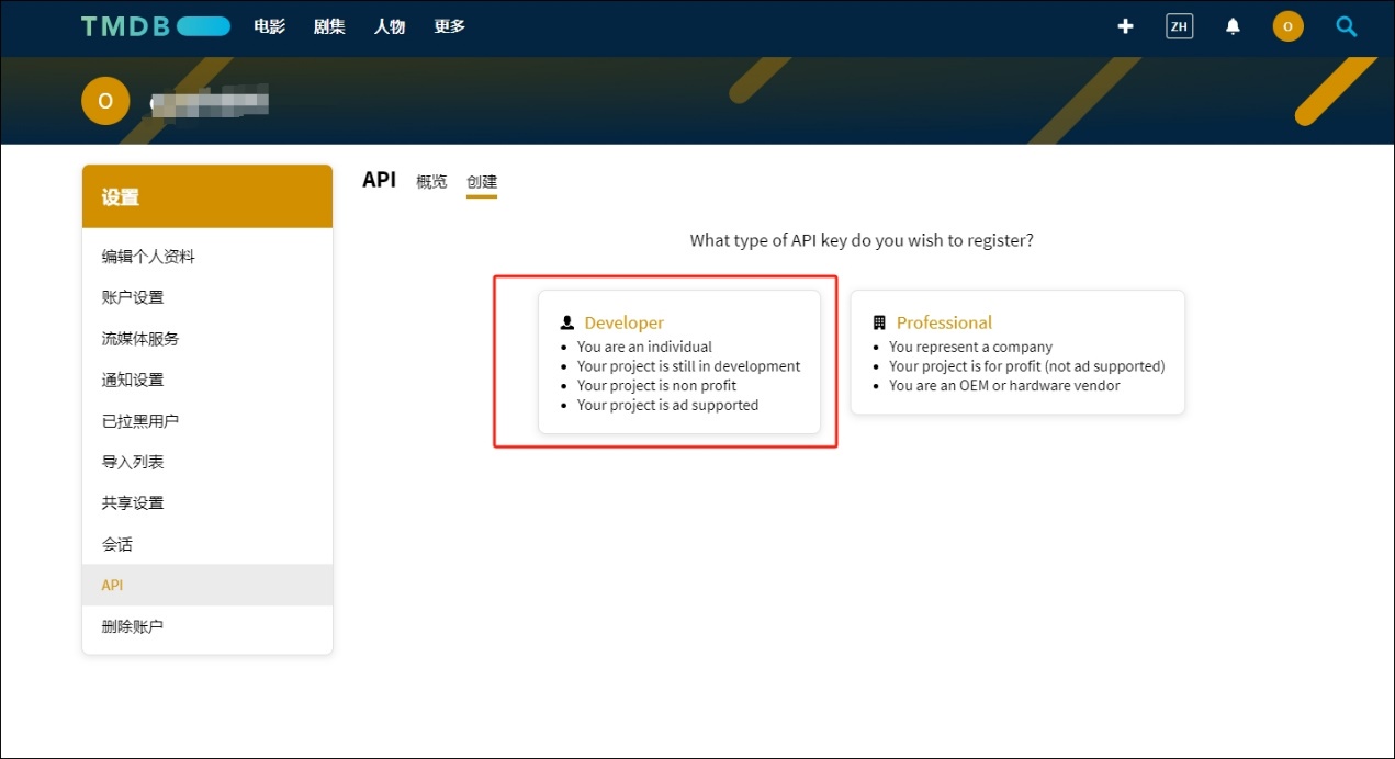 ▲影视中心是一款功能完善易用的媒体应用,能为用户提供优质影音体验。它支持搭建个人影音库,并支持多端播放。你可以通过浏览器或客户端随时随地高清播放影音内容,与家人朋友一起分享高清观影的快乐时光 ▲初次打开影视中心需要创建一个媒体库,选择媒体文件夹。这里有个TMDB API KEY;通过填入API密钥,可以使绿联影视中心信息获取插件能够连通TMDB获取视频信息和图片,组成精美的海报墙和详细的视频内容页 ▲点开首页,没有TMDB数据源支持时,仅通过Ai智能识别,只有少部分影片可以削刮出封面 ▲界面上方为刚才添加好的媒体库,文件夹即是你存放媒体文件的文件夹。点击右上角【头像】-【控制台】即可进入影院详细设置 ▲进入控制台后可以看到影视中心提供了两个刮削源:TMDB和智能识别;这里我们重点介绍TMDB ▲为了获取TMDB API,需要访问TMDB官网(https://www.themoviedb.org/),登录或创建账户,然后点开账户设置 ▲切换到API菜单,选择【请求API密钥】 ▲以Developer 身份创建 ▲同意使用条款并填写所需信息-