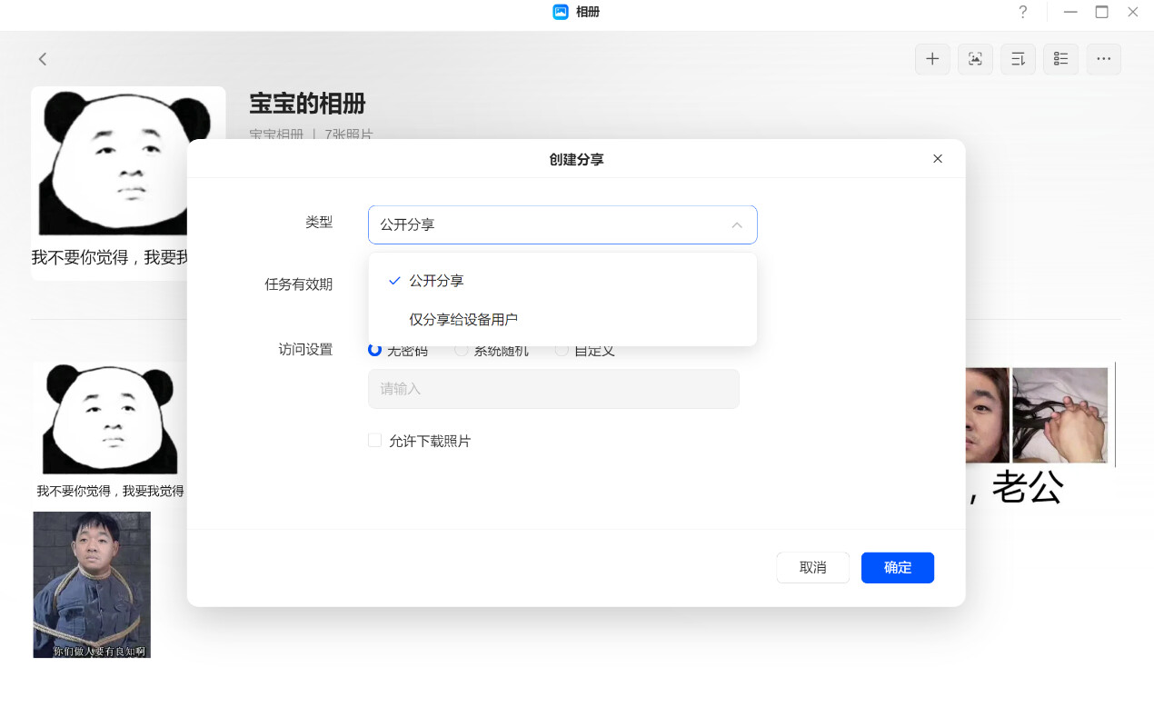▲相册自动备份,可以选择备份手机的相册,将其备份到NAS的存储空间,照片会按照年月日自动分类 ▲点击工具箱-设置-智能设置-下载8个智能模型,使用智能模型可以更快捷的对照片进行分类;所有AI智能模型基于本地运行,不会将数据上传到云端 ▲相册默认按照文件夹视图排列 ▲可以改为按时间流视图排列;图片带定位信息,可以显示文件名和大小 ▲图片会按照智能模型类别分类 ▲创建宝宝相册,和家人分享 ▲填好宝宝信息点击创建相册即可 ▲可以选择公开分享或是分享给其他设备用户Docker