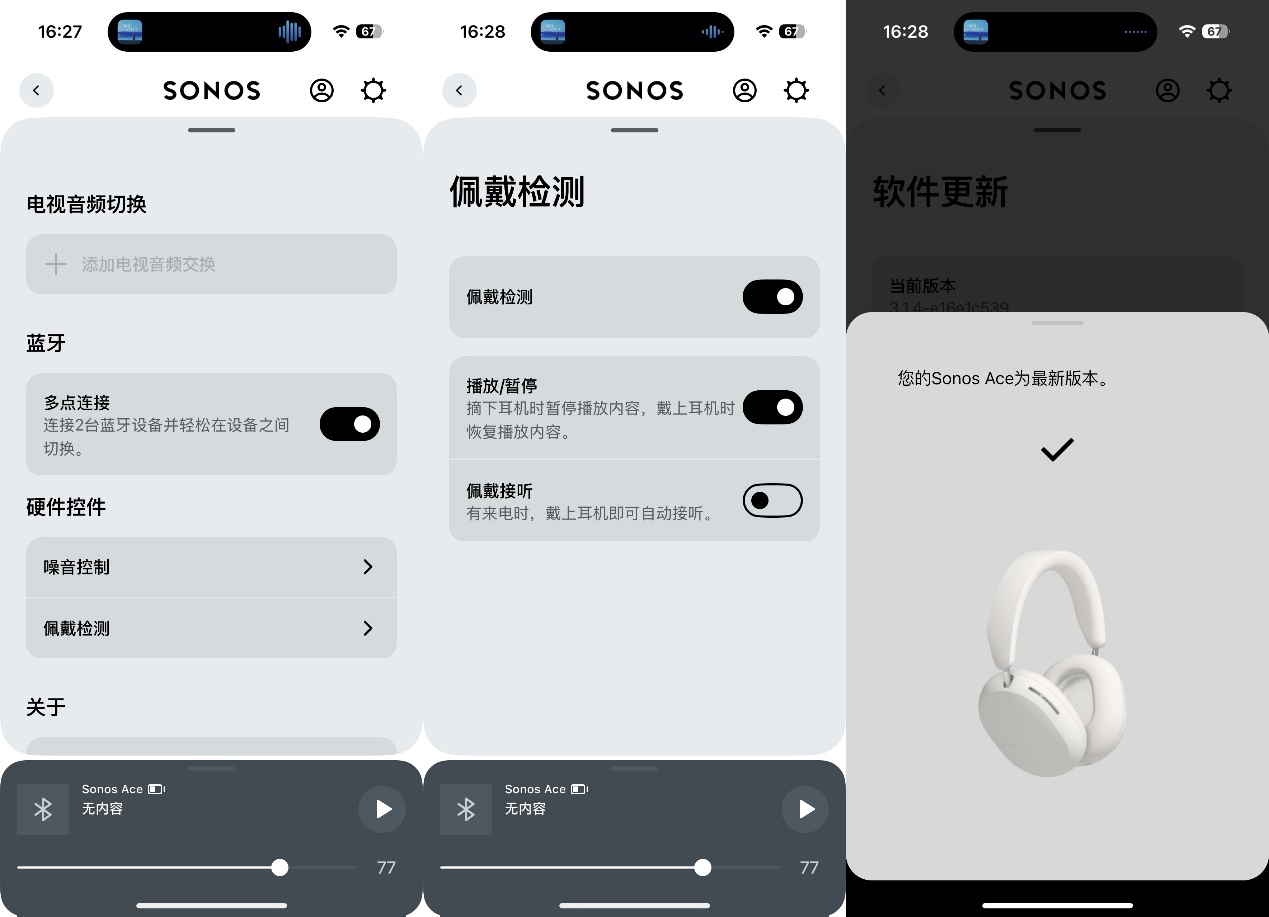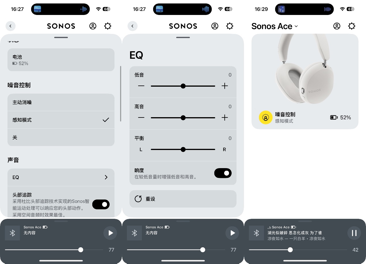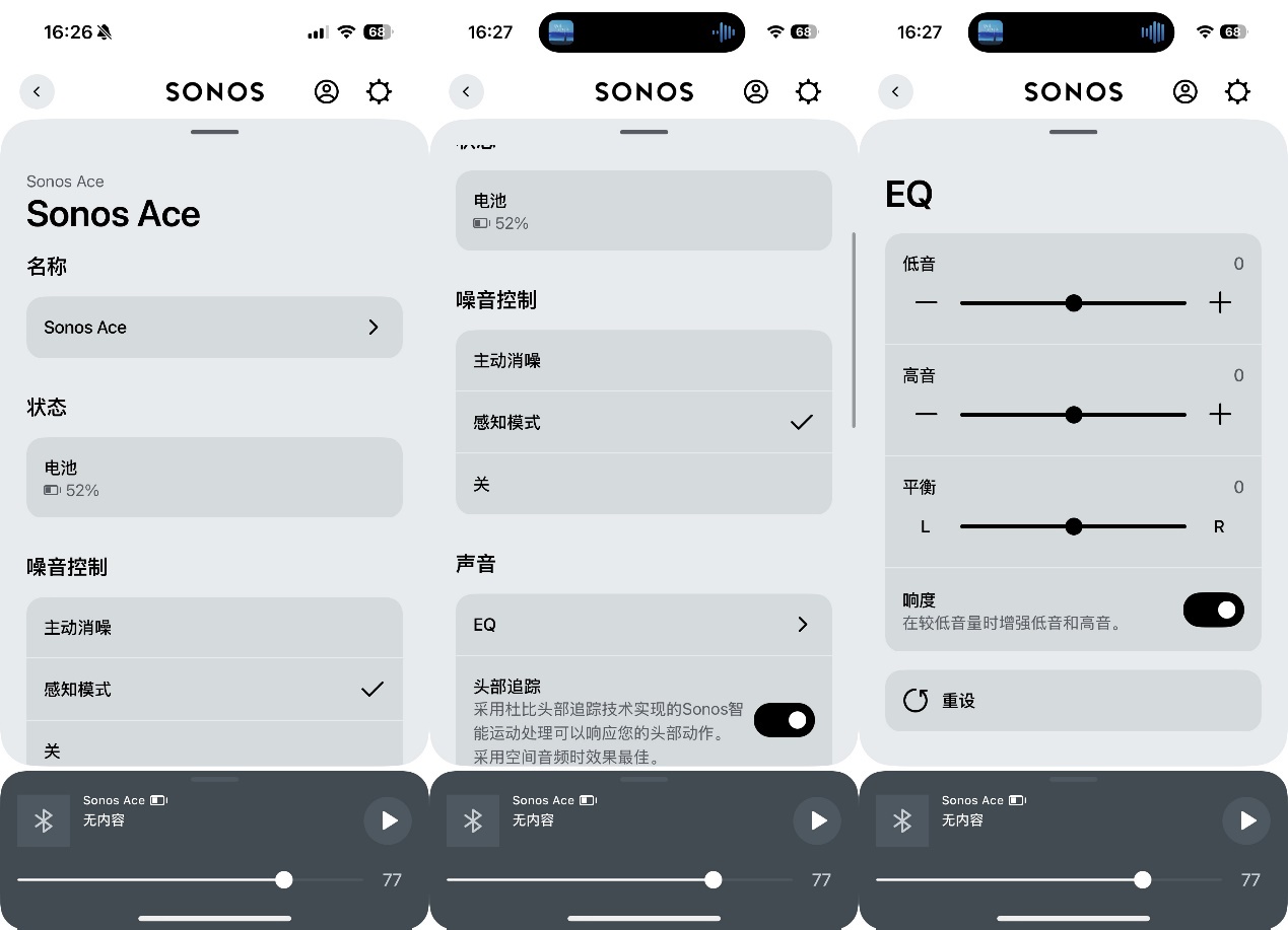 ▲下载Sonos app,打开后选择耳机,进行蓝牙连接,识别后会弹出耳机型号 ▲点击耳机图片,可以看到当前耳机电池剩余电量。Sonos Ace具备超长30小时续航,超过了AirPods Max的20小时和Bose QuietComfort Ultra的24小时;Sonos Ace支持3分钟即可获得3小时的电池续航的快速充电功能,超过了AirPods Max的5分钟1.5小时和Bose QuietComfort Ultra的15分钟2 小时。即便在紧急时刻也能快速充电保证使用 ▲噪音控制功能可以在主动降噪和感知模式之间切换,也可以关闭。可以按照自己喜好调整EQ,头部追逐功能可以在头部动作时及时响应,为用户带来忘记正在佩戴耳机的逼真聆听体验 ▲Sonos Ace还能够播放来自Apple Music、QQ音乐、网易云音乐、Tidal和Deezer的支持杜比全景声和索尼360临场音效的无损音频曲目和空间音频曲目 ▲对比市面上大多数蓝牙耳机只支持一个蓝牙设备,和只可手动播放暂定的现状,Sonos Ace内置佩戴检测功能,可自动暂定和播放,可同时连接两个设备无缝切换,在操作体验上无限接近苹果生态产品,是多苹果设备用户的好选择功能