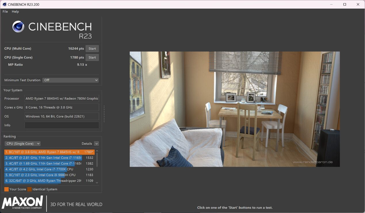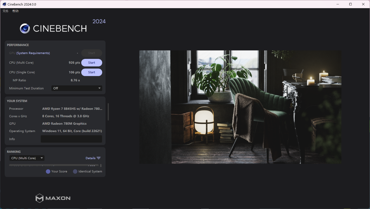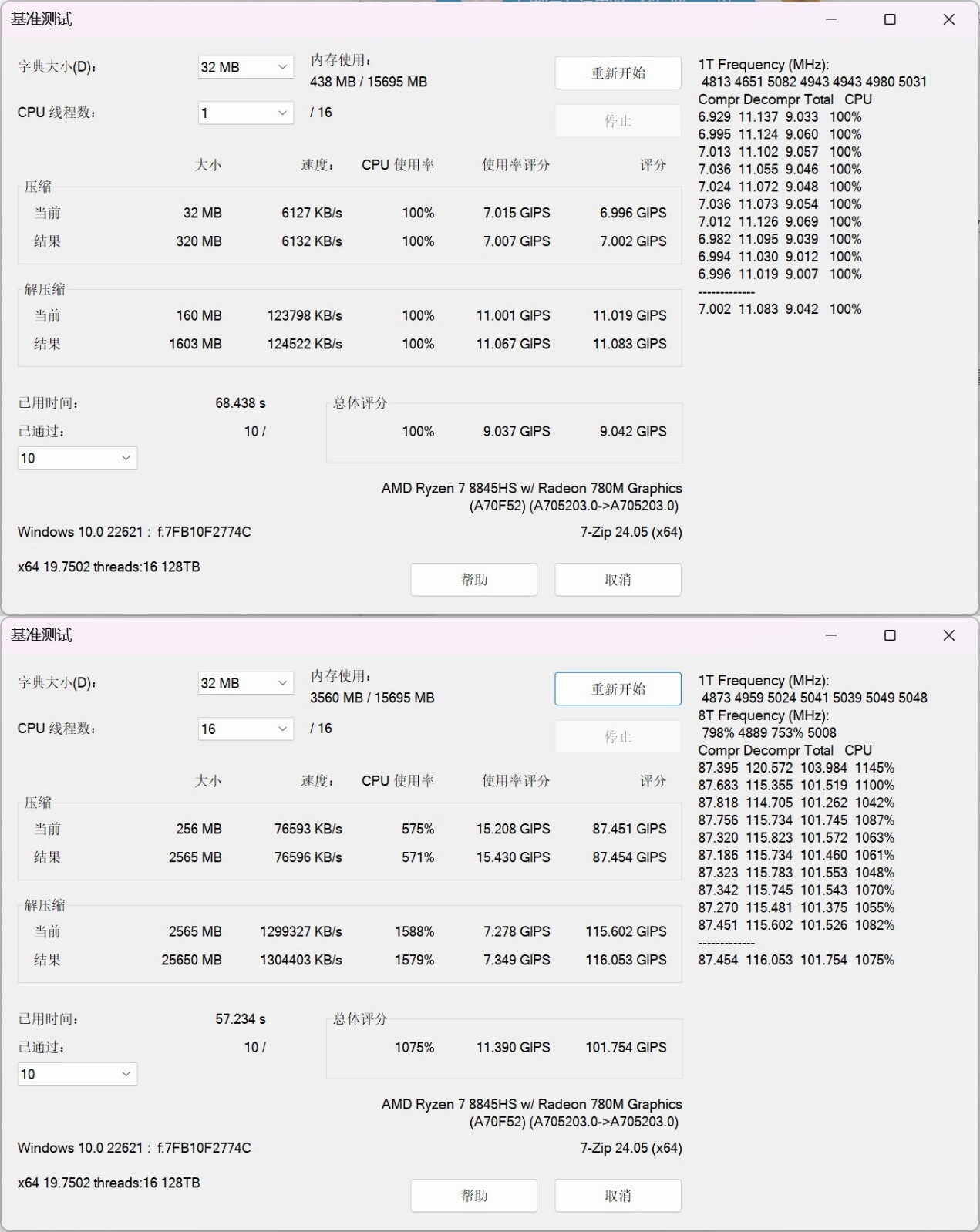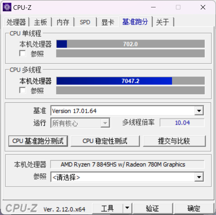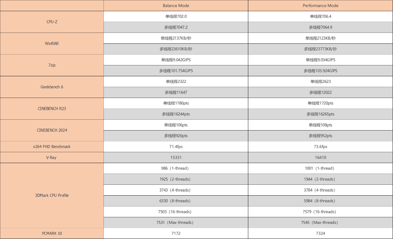 ▲CPU-Z测试分数;单线程702.0,多线程7047.2 ▲WINRAR 7.00单线程和多线程测试 ▲7-Zip 24.05单线程和多线程测试 ▲Geekbench 6测试,单核心分数为2322,多核心分数为11647 ▲CINEBENCH R23测试,单核心分数为1780pts,多核心分数为16244pts ▲CINEBENCH 2024测试,单核心分数为106pts,多核心分数为926pts ▲V-Ray Benchmark得分15331 ▲x264 FHD Benchmark,x264视频编码测试程序。AMD Ryzen 7 8845HS每秒可渲染71.4帧 ▲3DMark CPU Profile测试,可以测试CPU在不同线程下的性能表现 ▲PCMARK 10分数7172;常用基本功能得分10218,生产力得分10116,数位内容创作得分9685Performance Mode