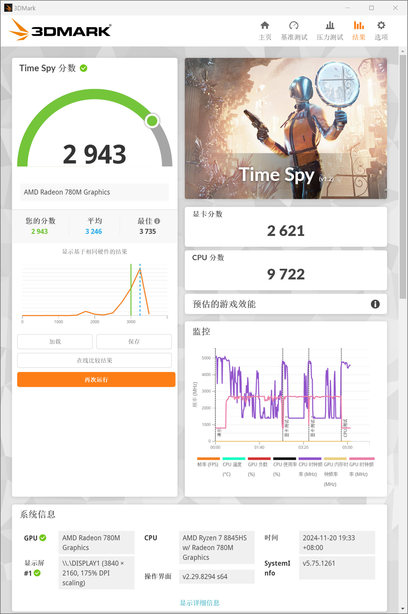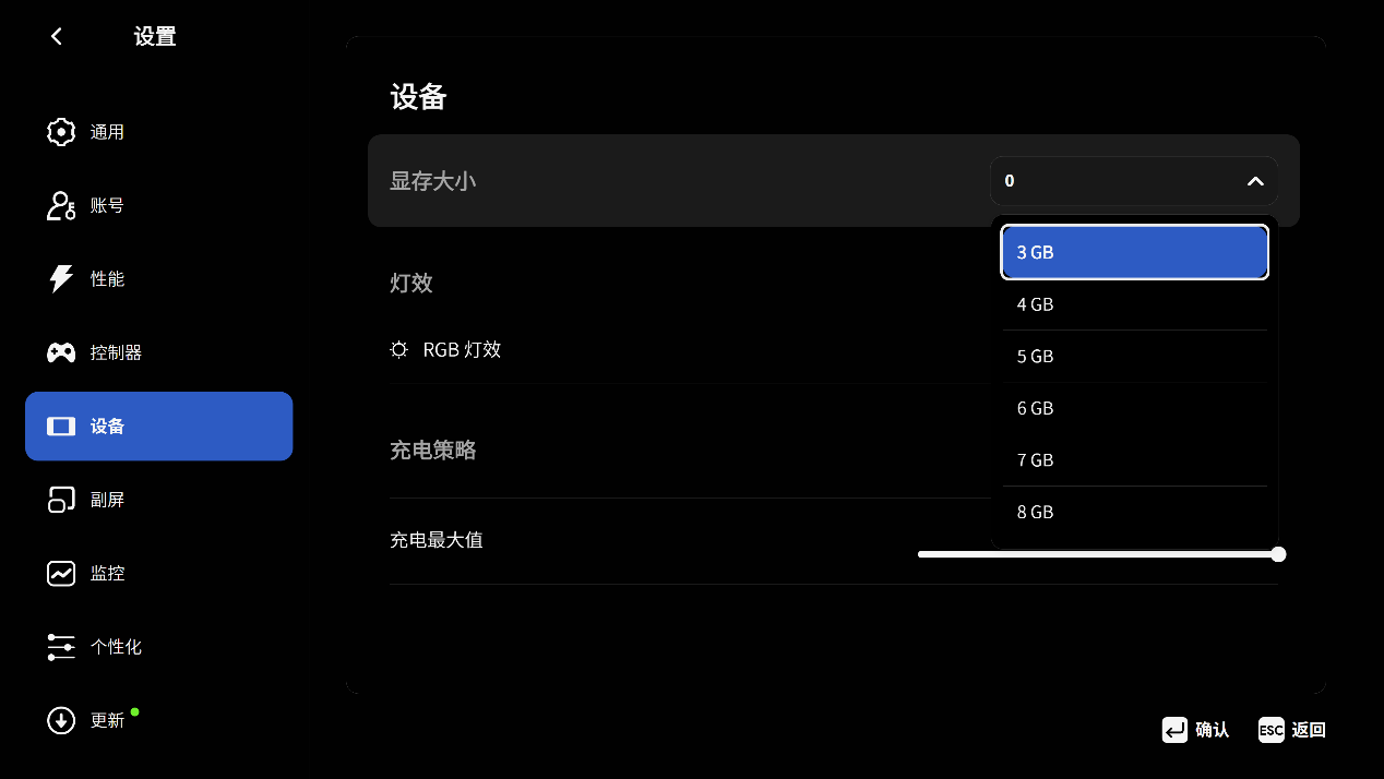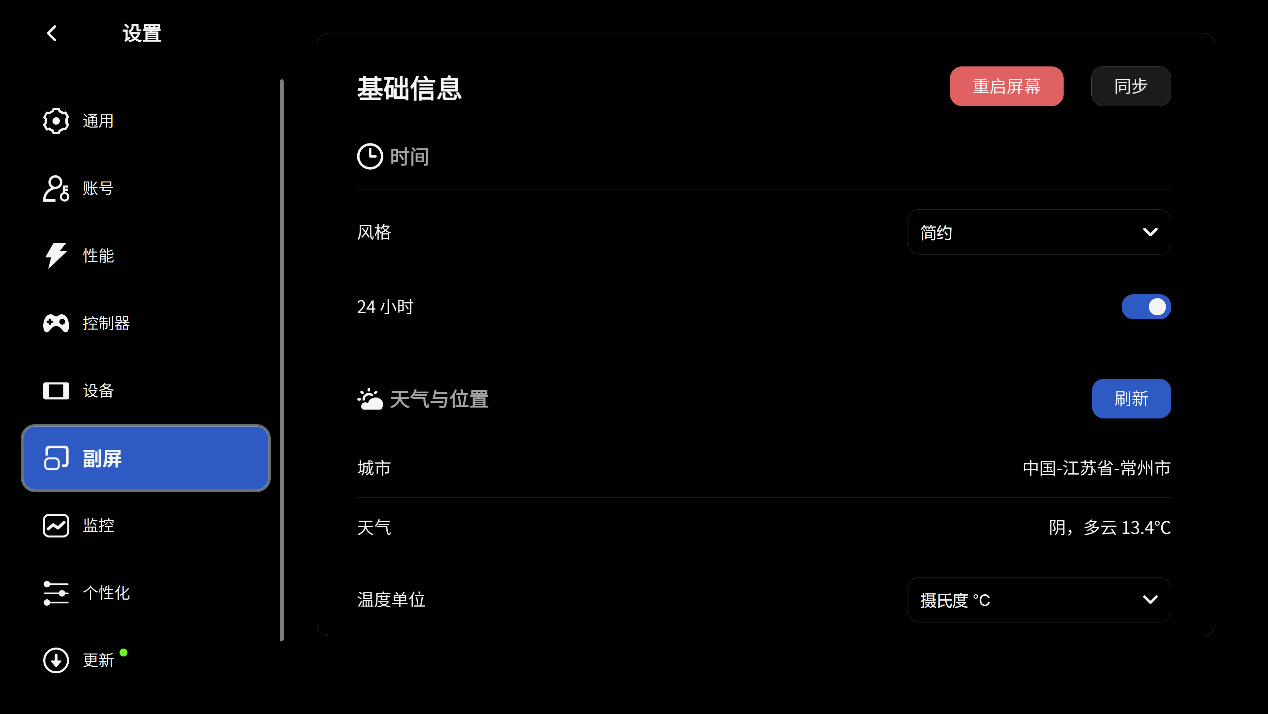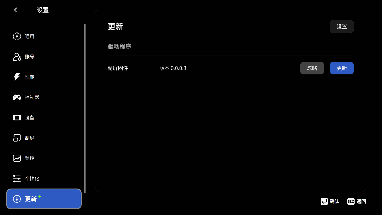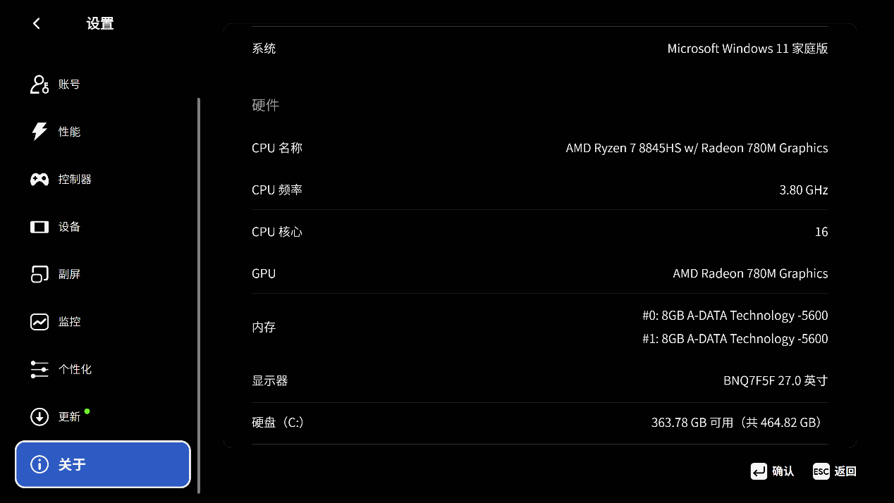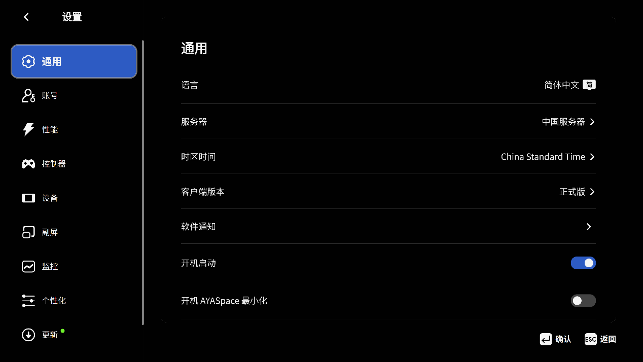 ▲AYASpace2.0新增了首页选项,打开过的游戏会显示在首页。对于Ayaneo掌机而言,AYASpace2.0可以方便快速找到进入游戏 ▲进入设置页面;通用选项中可以设置语言、时区、开启启动等 ▲创建属于自己的AYAID,以便后期游戏数据同步 ▲性能选项中分别有不同的TDP策略,也可以自己新建预设,根据自己的需求设定 ▲AYASpace还提供了键鼠模式和控制器模式,分别对应Mini PC和掌机 ▲对设备的显存进行设置,也可以对支持RGB灯效的设备进行灯光设置 ▲在副屏选项中可以设置在副屏上显示的日期,天气与位置等信息 ▲监控打开性能覆层,此时所有数据都会在左上角浮动显示,可以选择不同的数据风格 ▲显示当前设备的系统信息,包括CPU型号、Windows版本、内存型号、硬盘容量等 ▲副屏的固件支持更新 ▲更新时会在副屏上显示进度条 ▲最后点击AYASpace右上角的电源按钮,可以对设备进行休眠、重启、关机,也可以选择最小化或者退出AYASpace软件性能测试
