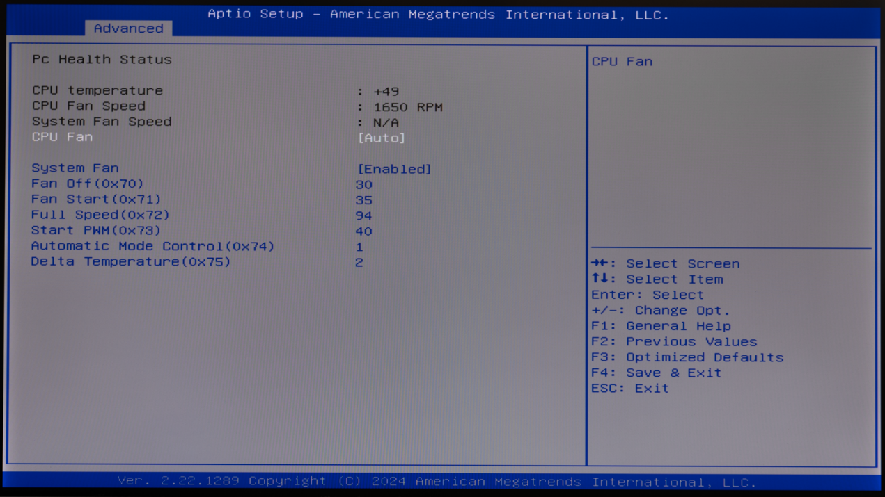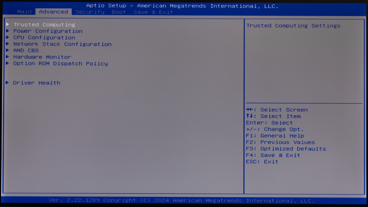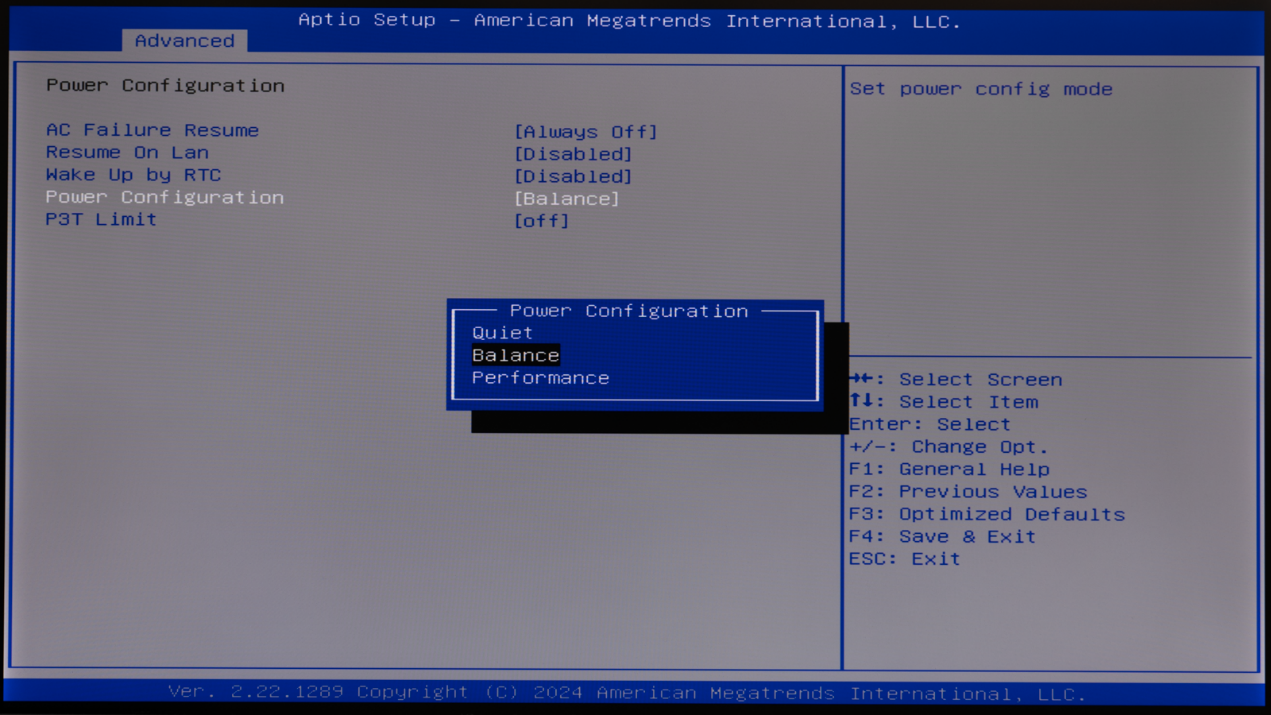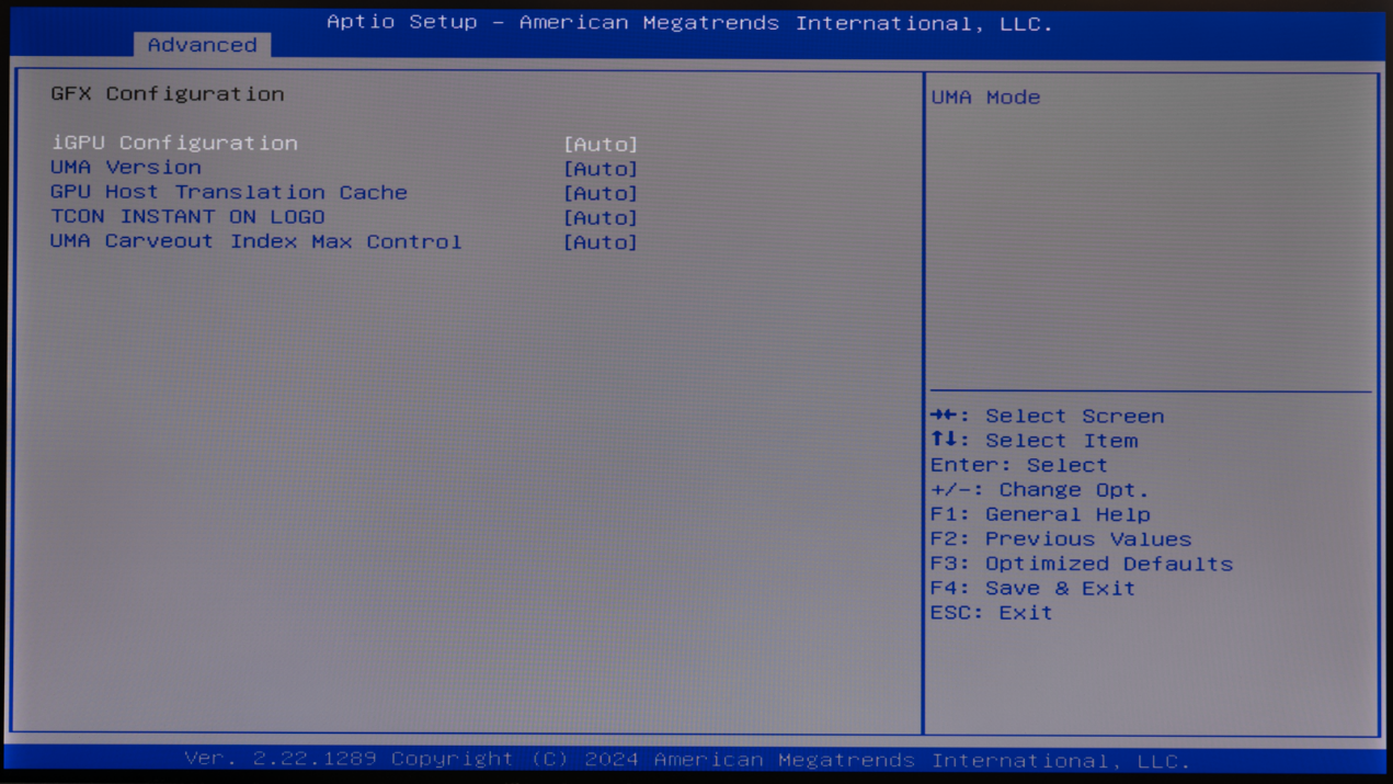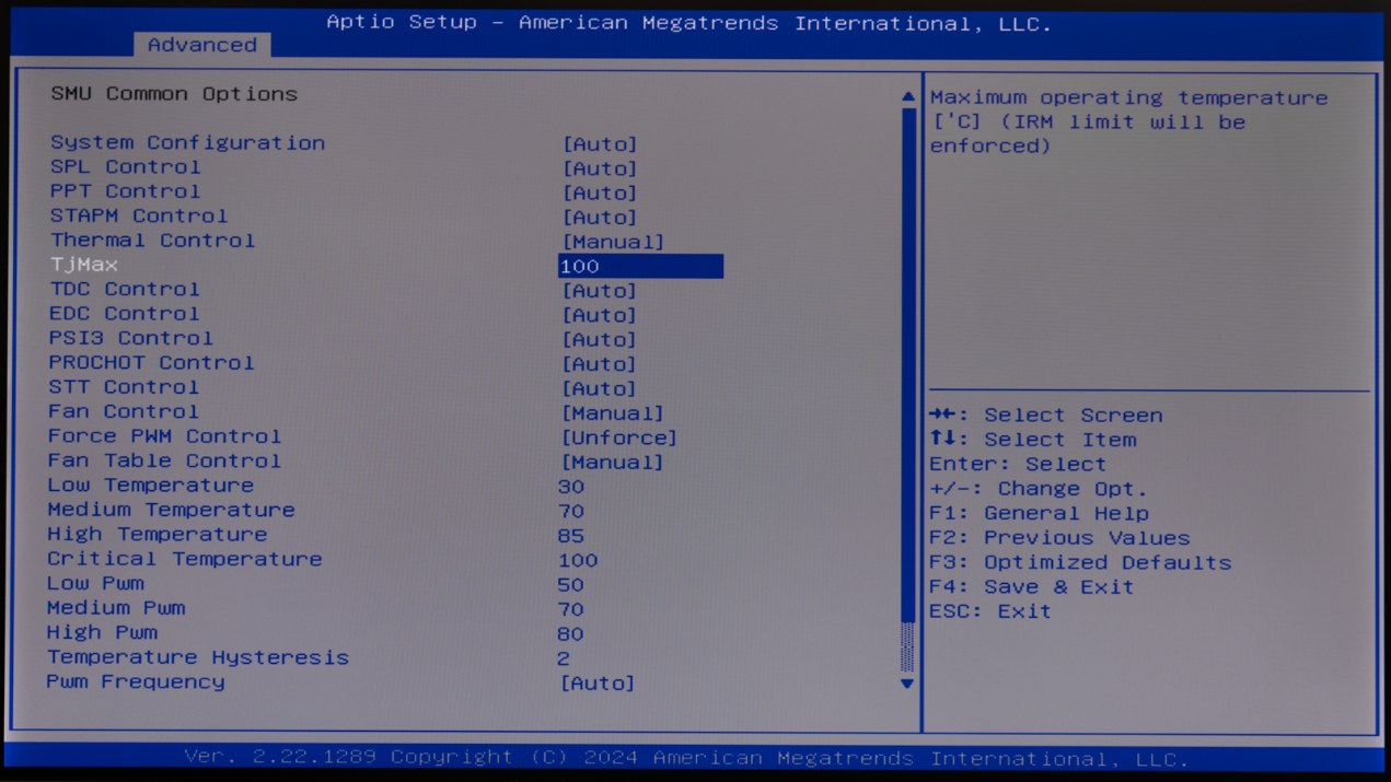 ▲BIOS主页面,这里可以看到Mini PC的型号AM02,CPU是AMD Ryzen 7 8845HS,GPU是Radeon 780M;内存是DDR5 5600MHz 16GB ▲Advanced页面 ▲TPM2.0支持 ▲AM02提供了三种功耗模式,默认为Balance模式,静音更好的Quiet模式以及性能更强的Performance模式 ▲PSS Support,打开后可以降低AMD CPU空载时的功耗 ▲NBIO Common Options → GFX Configuration中可以对GPU显存进行设定,默认条件下UMA Frame Buffer Size默认为512MB ▲Thermal Control 设置为 Manual,这个时候就可以对CPU最大结温进行设定。例如可以TjMax 设置为 100,此时CPU最大结温就是100℃。默认条件下,CPU最大结温为89℃ ▲CPU Fan策略,CPU温度30℃以下风扇停转,35℃下风扇开始转动,94℃下风扇全速运行系统信息