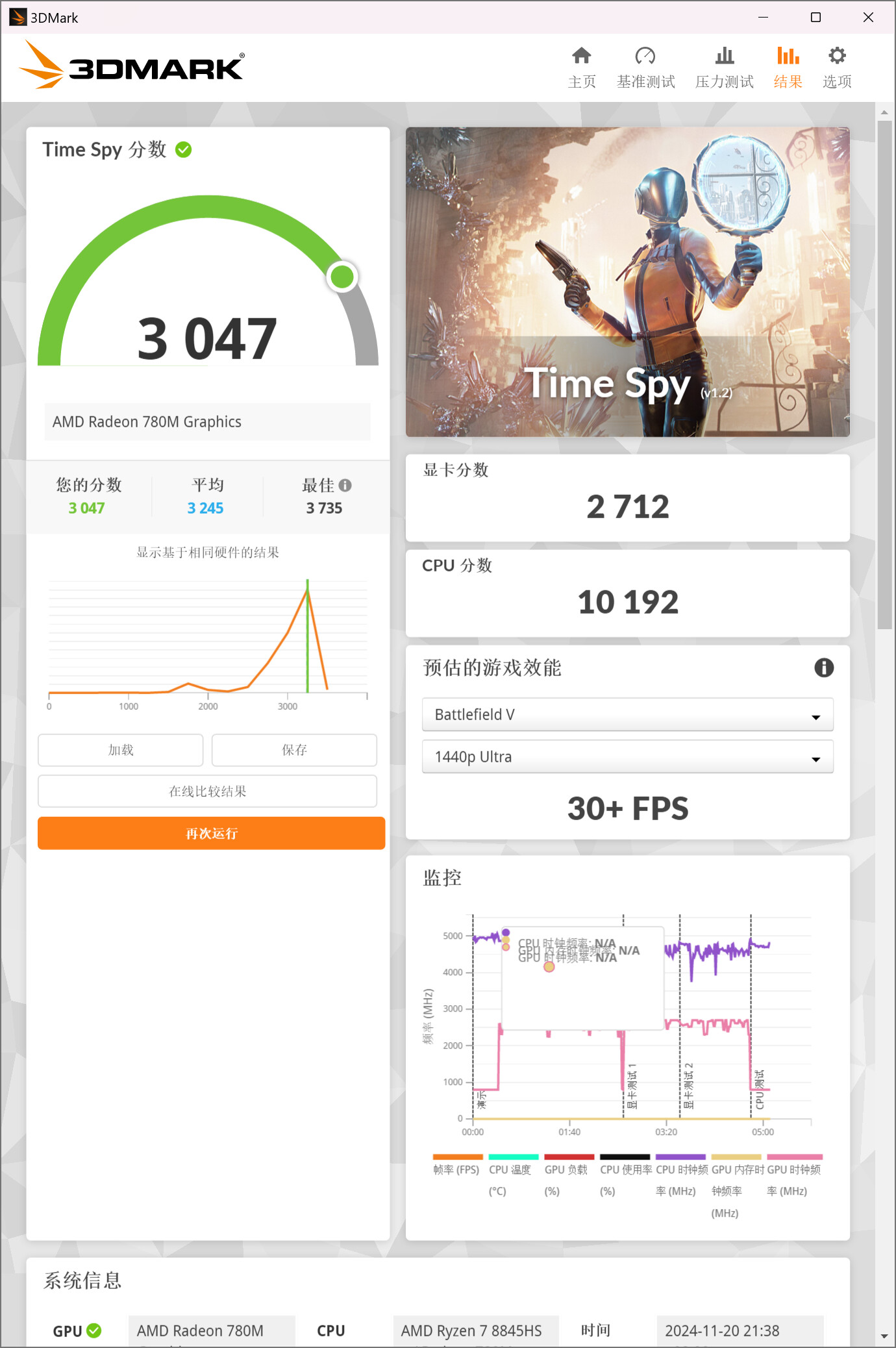 AYANEO AM02搭载了锐龙R7 8845 HS系列处理器,8大核心16线程,性能非常强大,无论是处理日常办公还是游戏娱乐,都游刃有余。DDR5 5600MHz加上高速PCle4.0 SSD,满足了大多数用户对速度和容量的需求。在PCMark 10测试中,AYANEO AM02的综合得分达到7324分,3DMark TimeSpy里跑分达到3047分,与独立GTX1650显卡的成绩相当