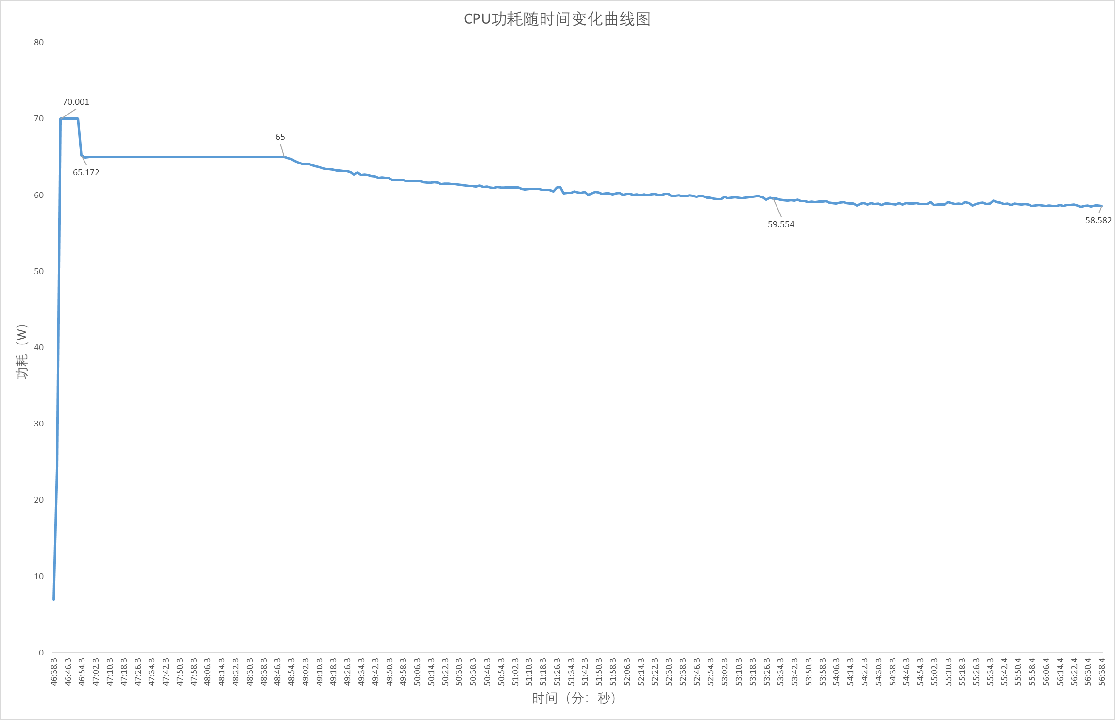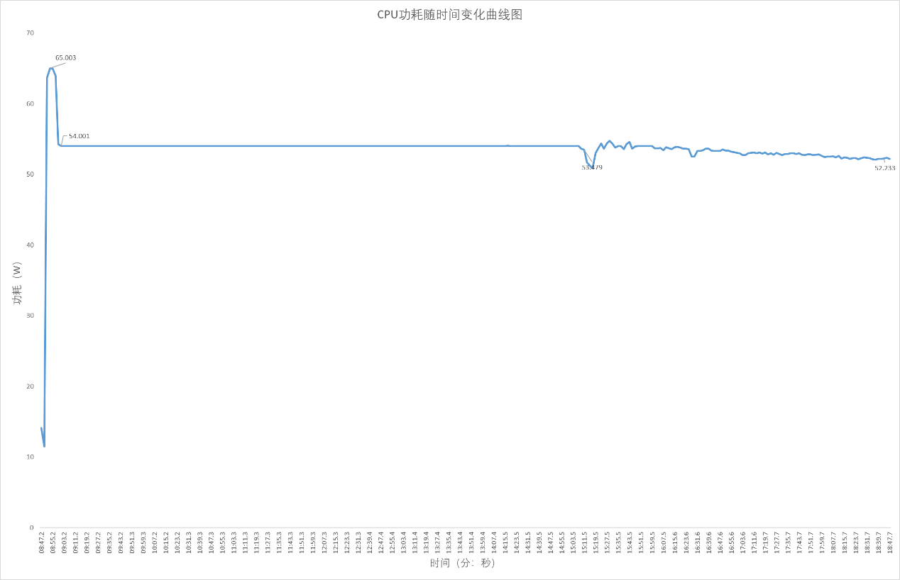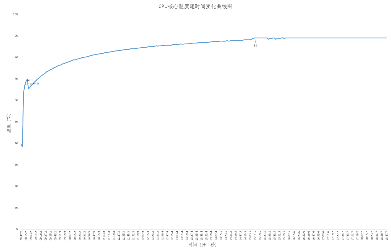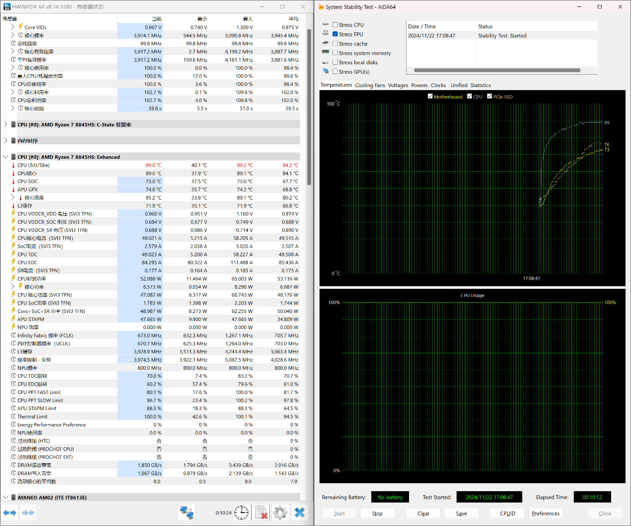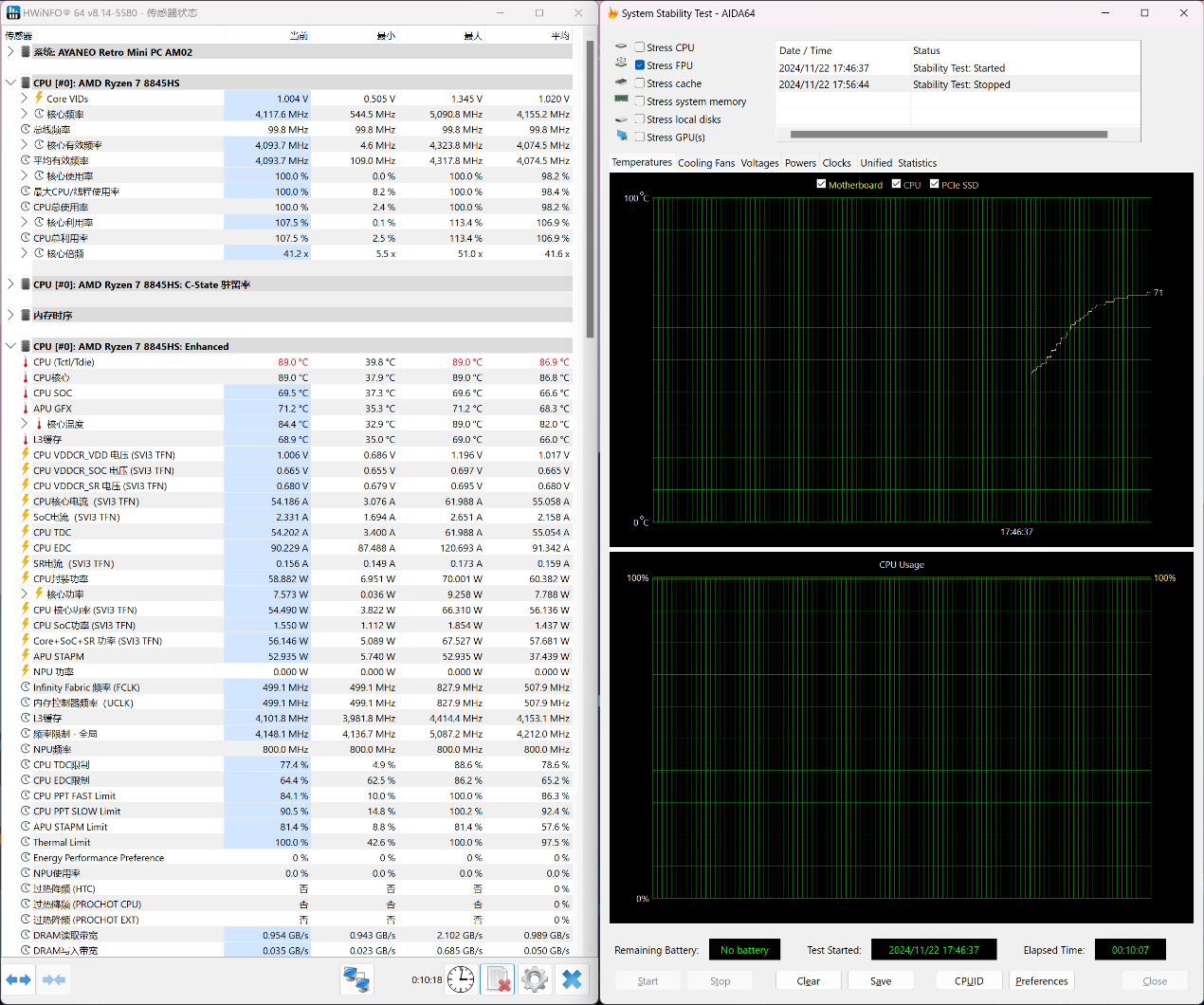 ▲Stress FPU 10分钟;使用HWiNFO来记录CPU温度,核心频率以及CPU功耗;整个过程持续10分钟,AMD Ryzen 7 8845HS有触发功耗墙,达到CPU限制温度,但没有过热降频(触发温度墙) ▲CPU在Stress FPU 5秒进入PPT FAST Limit阶段,此时CPU核心频率在4.34GHz左右;17秒后进入PPT SLOW Limit阶段,此时CPU核心频率在4.24GHz左右;133秒后进入Thermal Limit阶段,此时CPU核心频率在4.23GHz左右;整个Stress FPU阶段CPU核心频率在3.68-4.34GHz波动 ▲由于CPU温度被限制在89℃,所以整个Stress FPU阶段CPU温度没有超过89℃ ▲CPU在PPT FAST Limit阶段,CPU功耗在70W左右;进入PPT SLOW Limit阶段, CPU功耗在65W左右;133秒后进入Thermal Limit阶段,此时CPU核心功耗在65W左右并持续下降至58.5W附近解开CPU最大结温