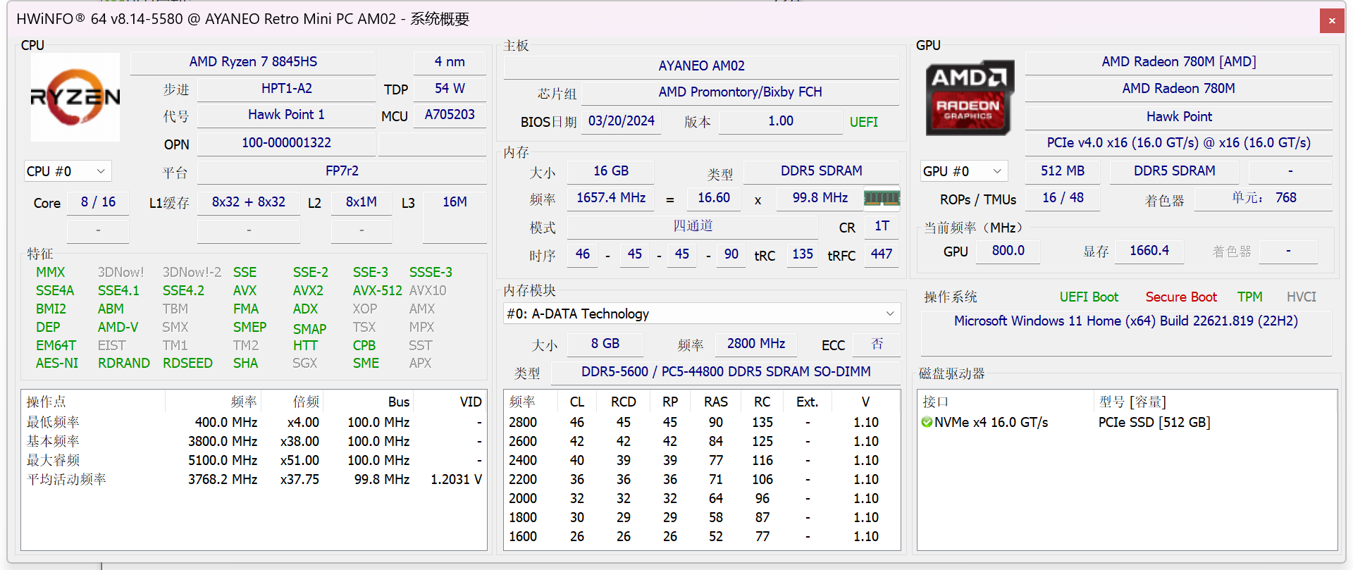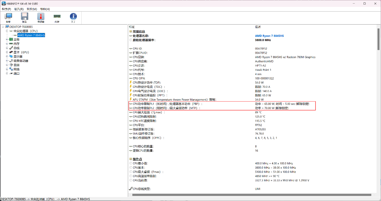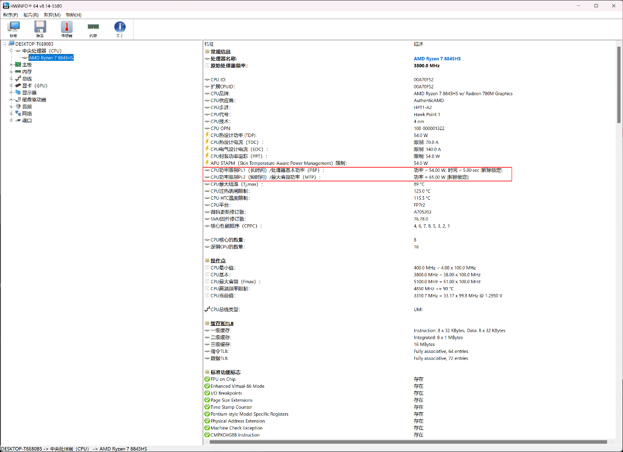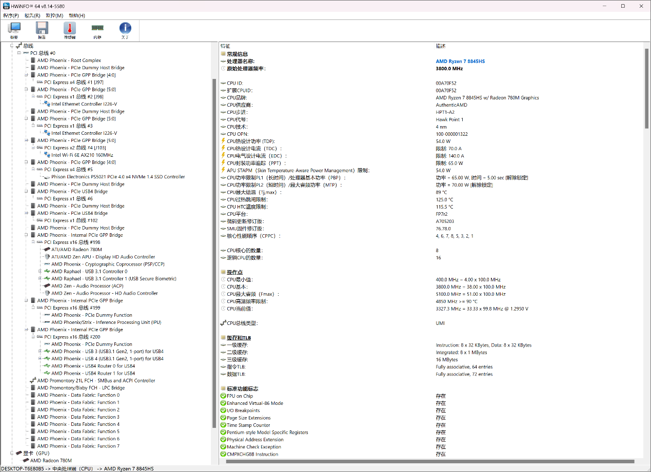 ▲AM02搭载了AMD Ryzen 7 8845HS CPU和16G内存,预装Windows 11家庭版22H2 ▲设备管理器信息。对比AM02 7840HS版本,AM02 8845HS版本网卡部分已经全部升级至2.5G I226 ▲CPU-Z信息;AMD Ryzen 7 8845HS具备8核心16线程,内存为2 x 8GB DDR5 5600MHz;显卡型号为AMD Radeon 780M ▲Balance Mode下,CPU的PL1=54W,PL2=65W;CPU最大结温(温度限制)89℃,温度墙为115.5℃ ▲Performance Mode下,CPU的PL1=65W,PL2=70W;CPU最大结温(温度限制)89℃,温度墙为115.5℃ ▲CPU ID ▲HWiNFO CPU和GPU信息 ▲PCIe通道分布信息AYASpace