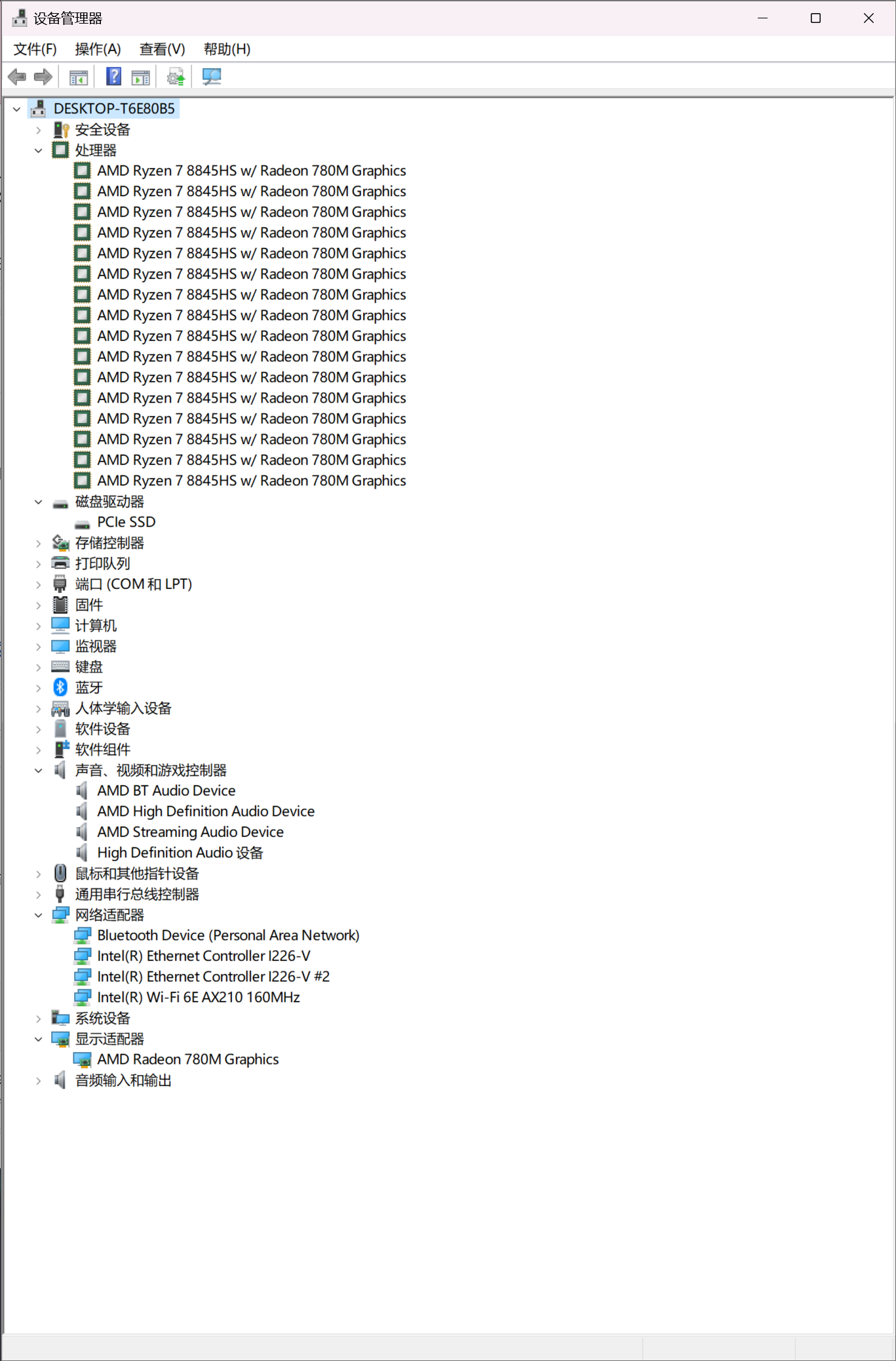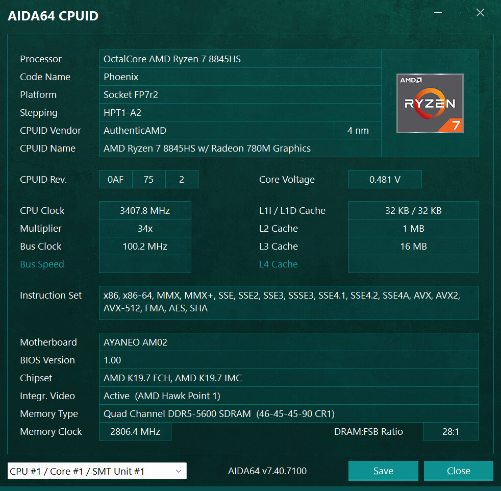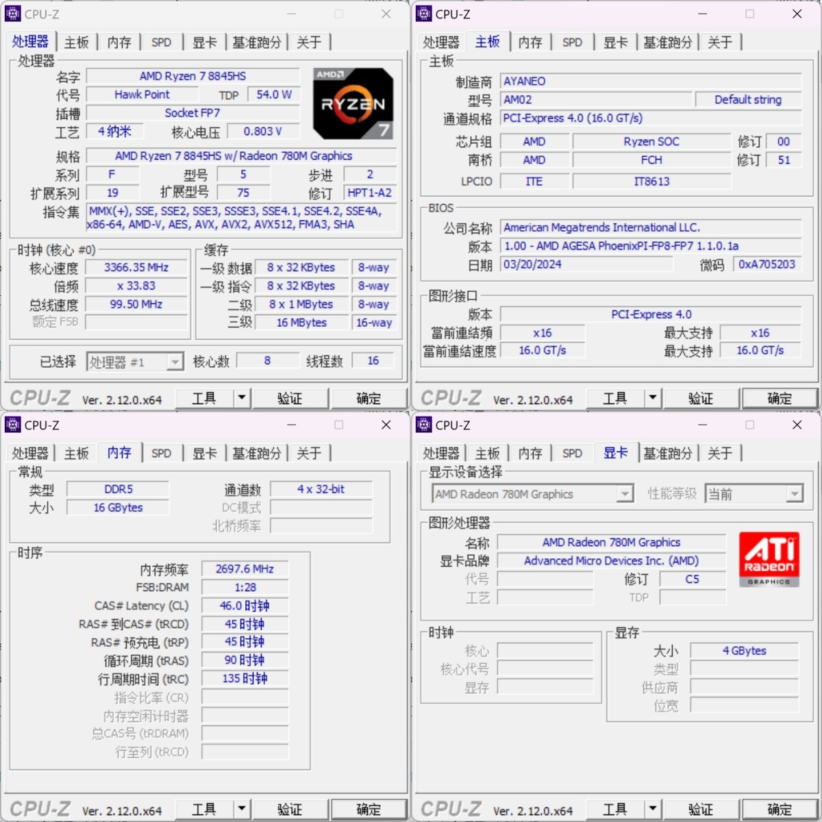 ▲AM02搭载了AMD Ryzen 7 8845HS CPU和16G内存,预装Windows 11家庭版22H2 ▲设备管理器信息。对比AM02 7840HS版本,AM02 8845HS版本网卡部分已经全部升级至2.5G I226 ▲CPU-Z信息;AMD Ryzen 7 8845HS具备8核心16线程,内存为2 x 8GB DDR5 5600MHz;显卡型号为AMD Radeon 780M ▲Balance Mode下,CPU的PL1=54W,PL2=65W;CPU最大结温(温度限制)89℃,温度墙为115.5℃ ▲Performance Mode下,CPU的PL1=65W,PL2=70W;CPU最大结温(温度限制)89℃,温度墙为115.5℃ ▲CPU ID ▲HWiNFO CPU和GPU信息 ▲PCIe通道分布信息AYASpace