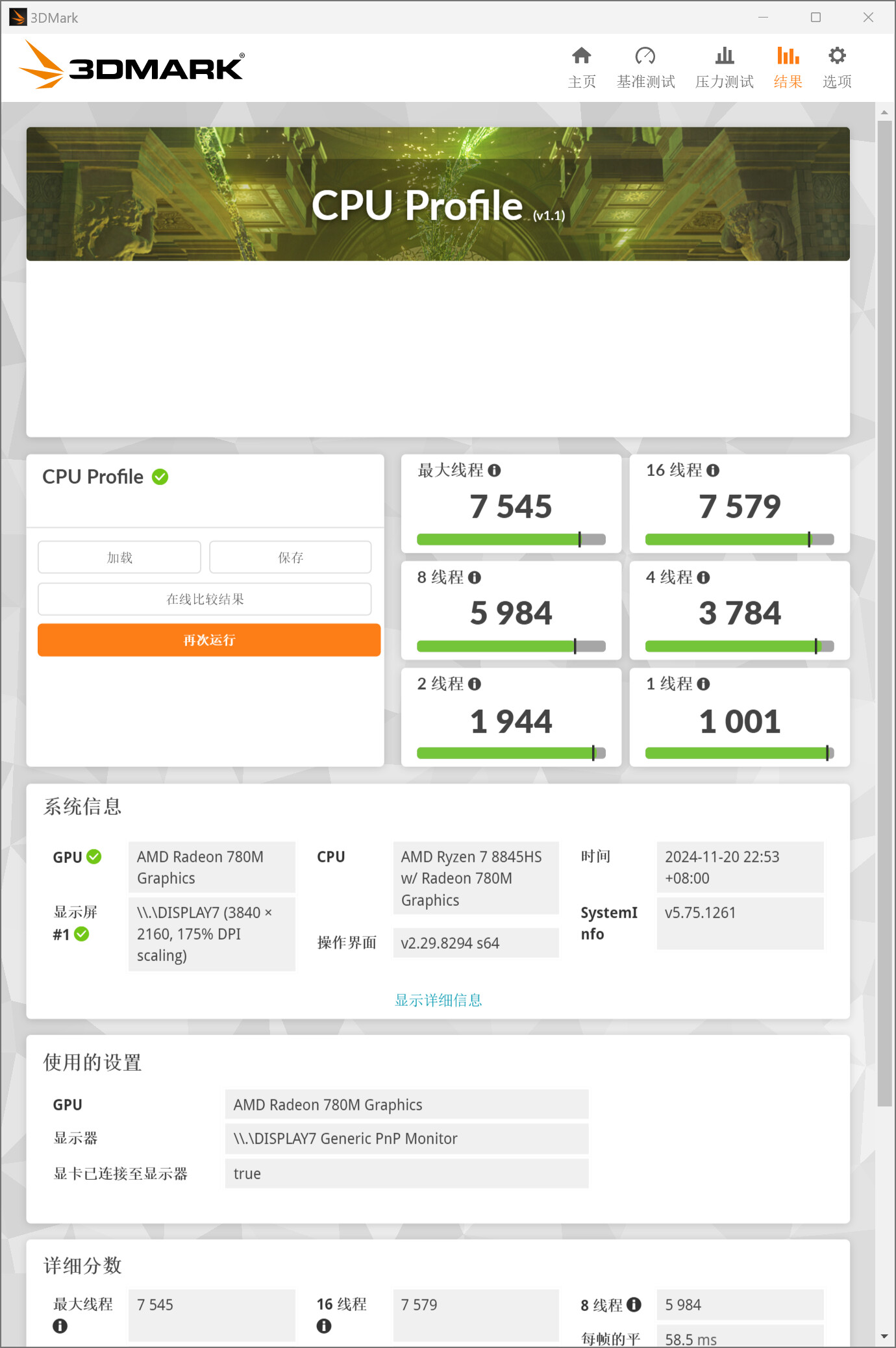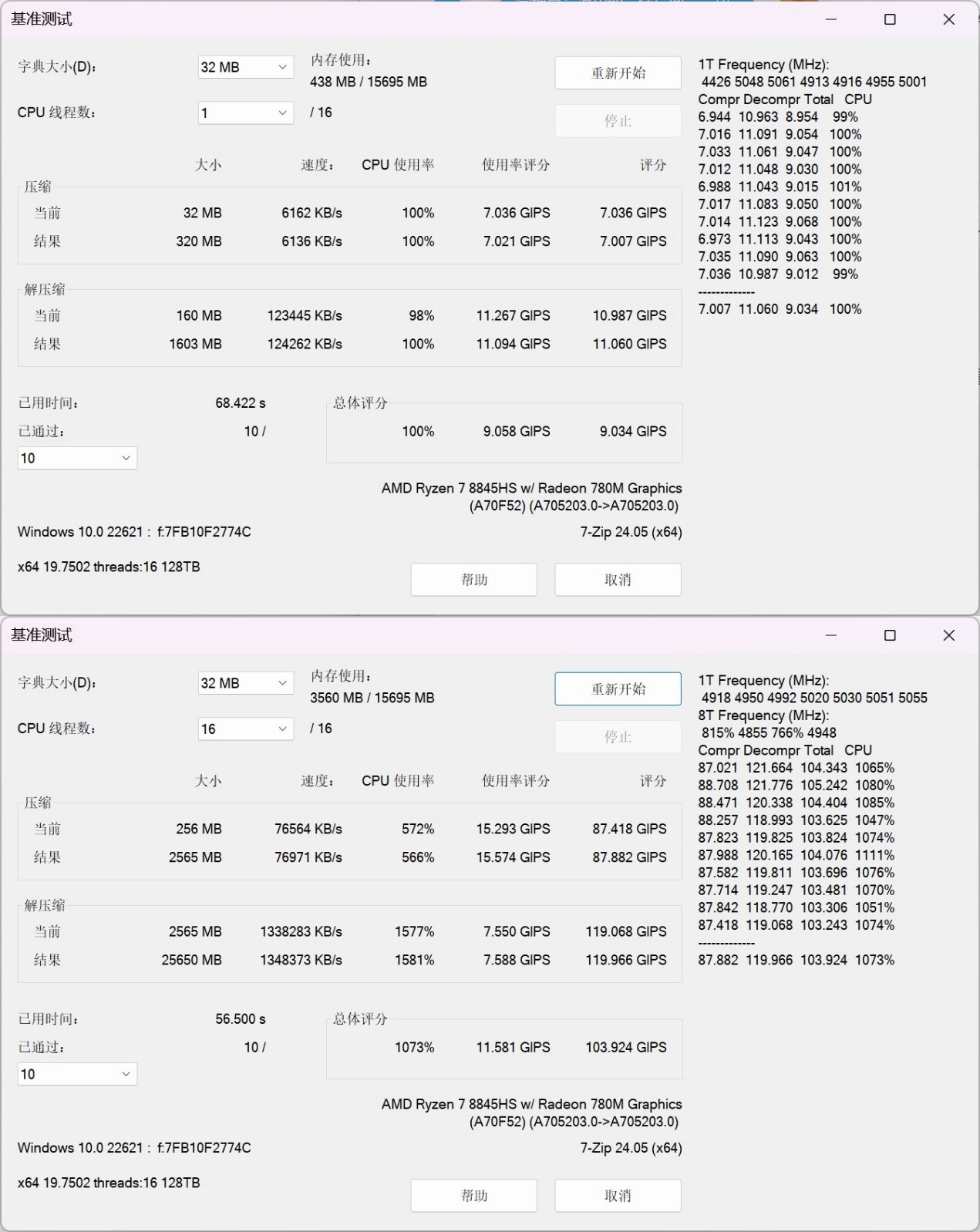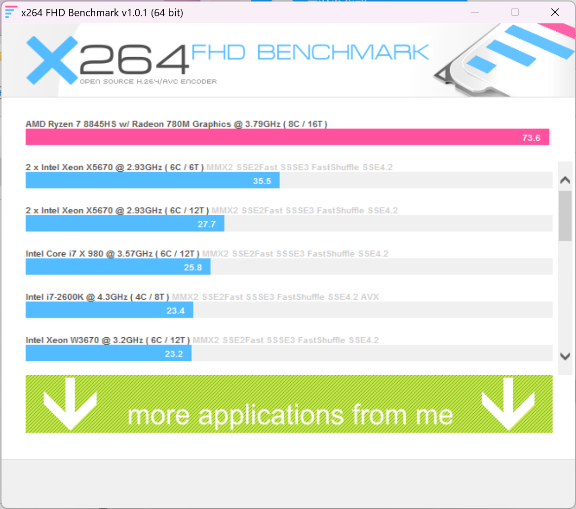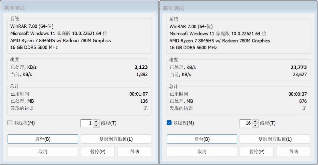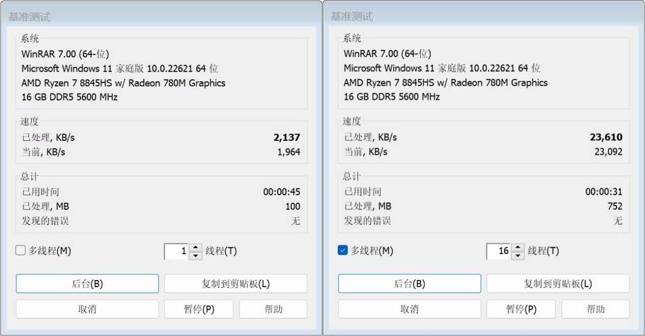 ▲CPU-Z测试分数;单线程706.4,多线程7064.9 ▲WINRAR 7.00单线程和多线程测试 ▲7-Zip 24.05单线程和多线程测试 ▲Geekbench 6测试,单核心分数为2623,多核心分数为12022 ▲CINEBENCH R23测试,单核心分数为1720pts,多核心分数为16265pts ▲CINEBENCH 2024测试,单核心分数为108pts,多核心分数为952pts ▲V-Ray Benchmark得分16410 ▲x264 FHD Benchmark,x264视频编码测试程序。AMD Ryzen 7 8845HS每秒可渲染73.6帧 ▲3DMark CPU Profile测试,可以测试CPU在不同线程下的性能表现 ▲PCMARK 10分数7324;常用基本功能得分10451,生产力得分10310,数位内容创作得分9893 ▲数据汇总温度和功耗