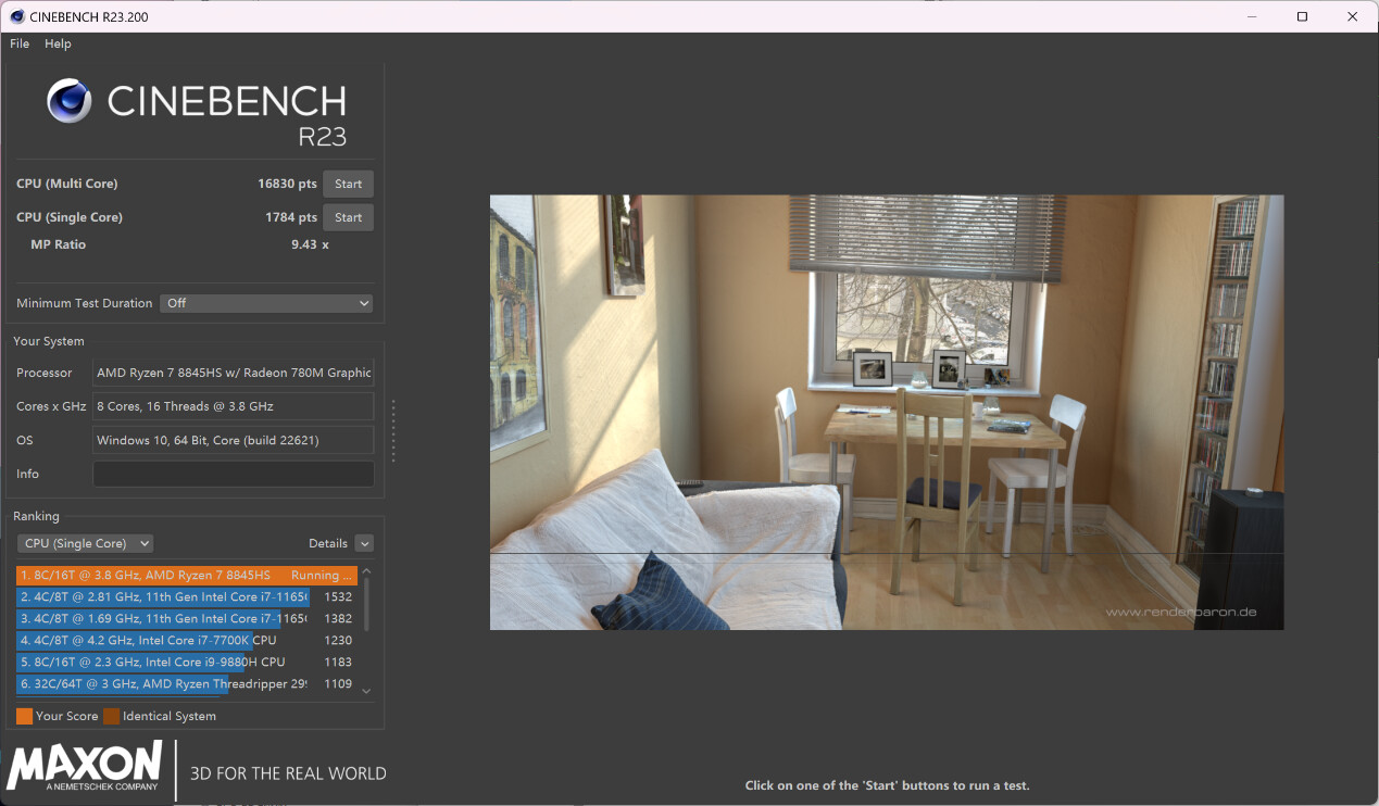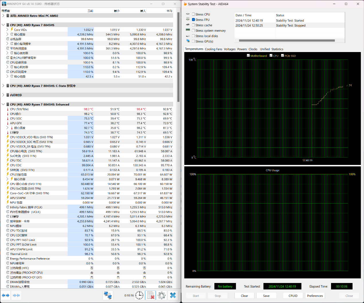 ▲Thermal Limit中将TjMAX设为100 ▲Performance Mode下将CPU最大结温(温度限制)放开至100℃,CPU温度墙为115.5℃ ▲Stress FPU 10分钟;使用HWiNFO来记录CPU温度,核心频率以及CPU功耗;整个过程持续10分钟,AMD Ryzen 7 8845HS有触发功耗墙,但未达到CPU限制温度,也没有过热降频(触发温度墙) ▲CPU在Stress FPU 4秒进入PPT FAST Limit阶段,此时CPU核心频率在4.33GHz左右;14秒后进入PPT SLOW Limit阶段,此时CPU核心频率在4.22GHz左右;整个Stress FPU阶段CPU核心频率在3.77-4.24GHz波动,大部分时间CPU核心频率在4.24GHz附近 ▲整个Stress FPU阶段CPU温度只有98℃,未达到CPU最大结温100℃ ▲CPU在PPT FAST Limit阶段,CPU功耗在70W左右;进入PPT SLOW Limit阶段, CPU功耗在65W左右 ▲CINEBENCH R23测试,单核心分数为1784pts,多核心分数为16830pts。放开CPU最大结温后,CPU的性能得到了不小的提升风扇噪音
