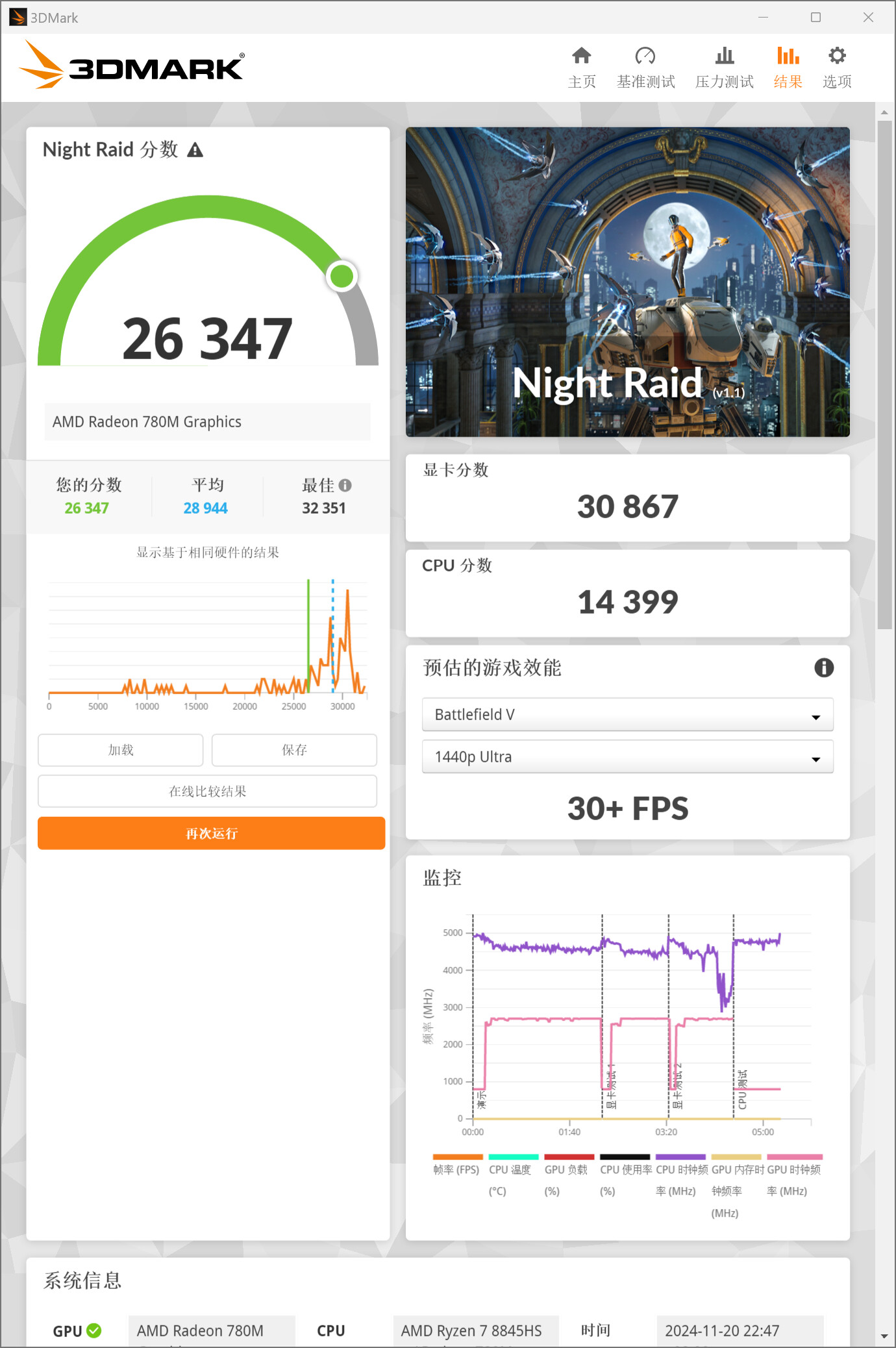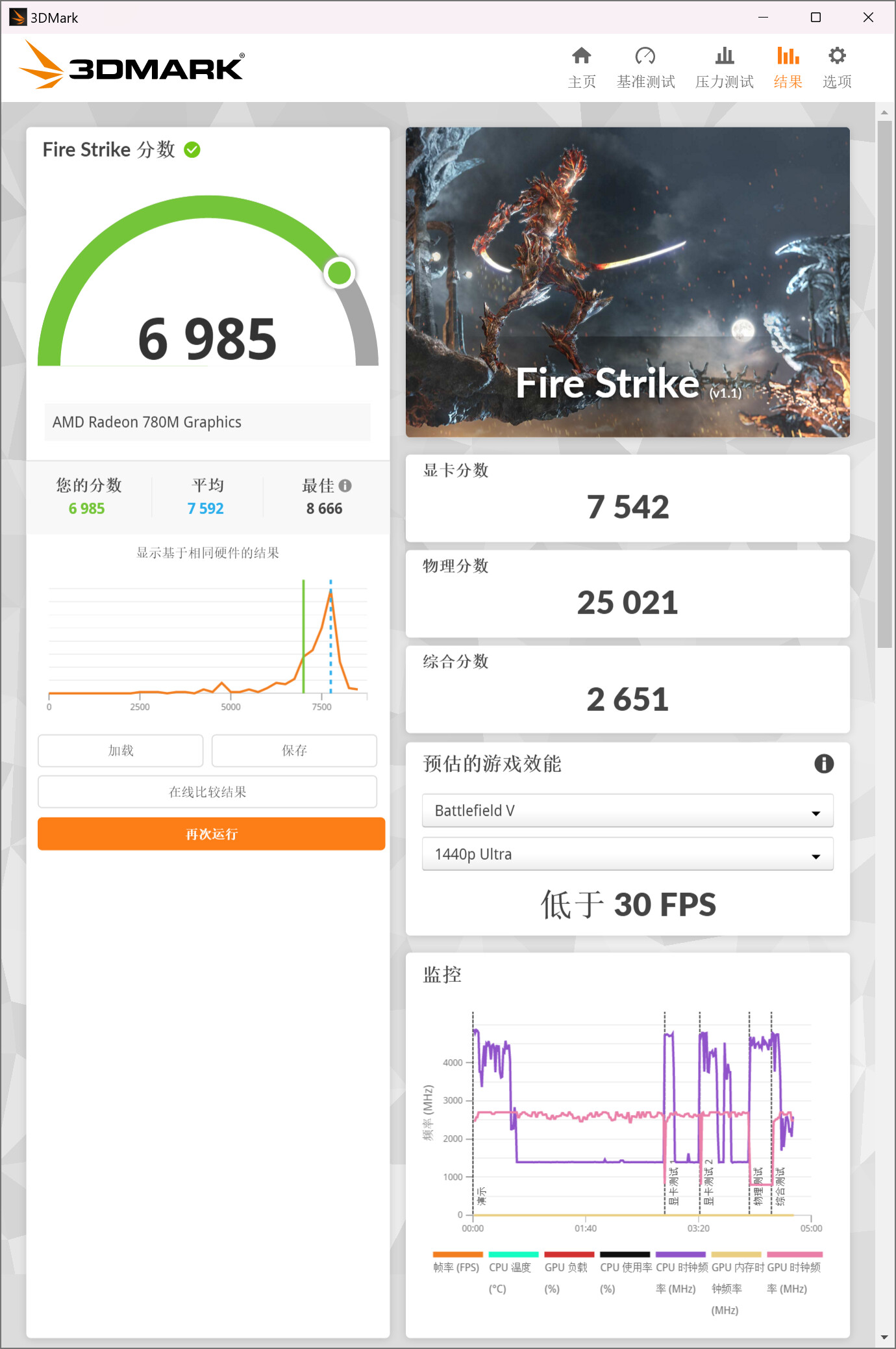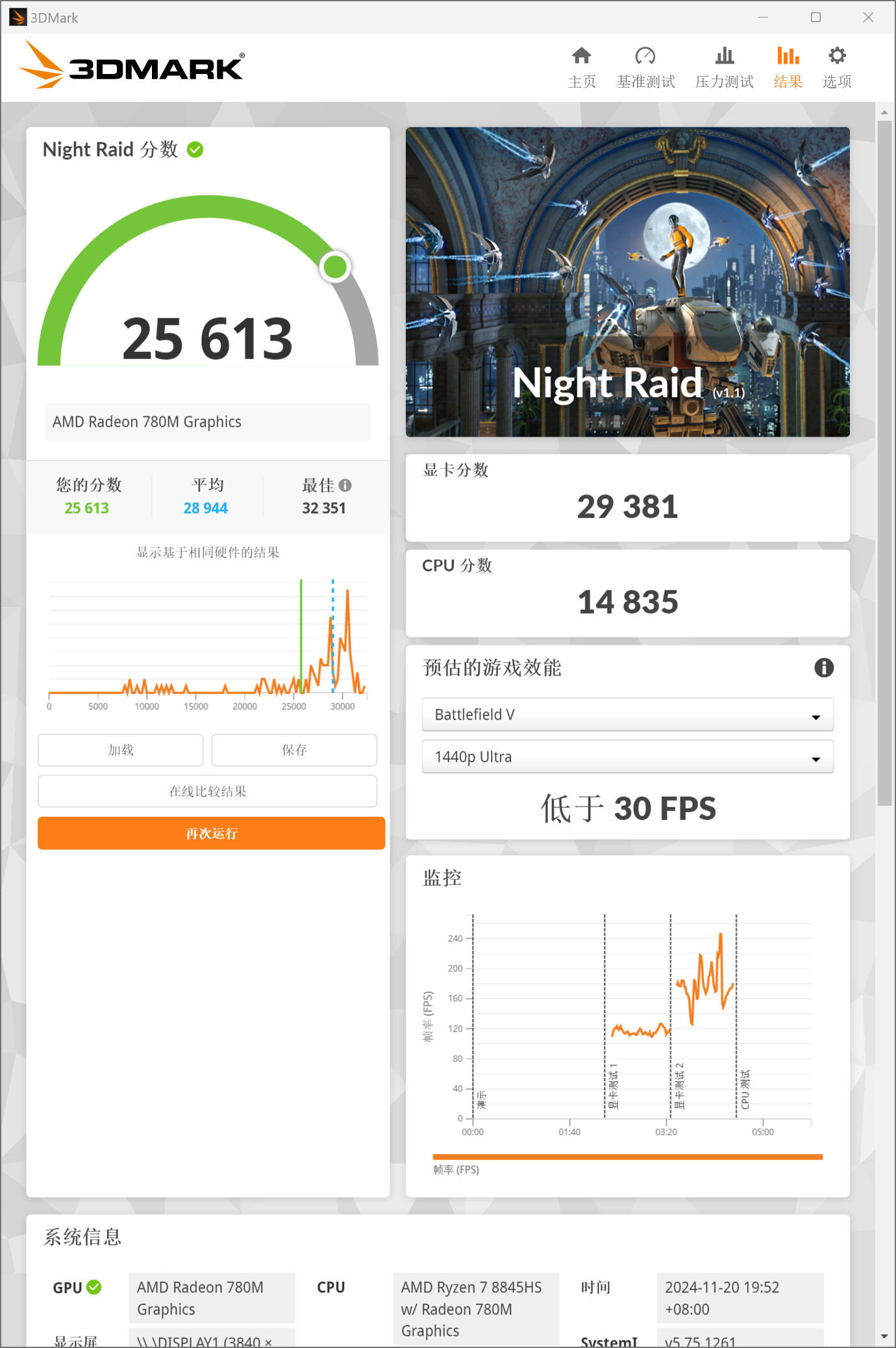 ▲Geekbench 6 GPU测试,OpenCL分数为30941 ▲3DMark Time Spy分数2943,显卡分数2621,CPU分数9722 ▲3DMark Fire Strike分数6985,显卡分数7542,物理分数25021,综合分数2651 ▲3D Mark Night Raid分数25613,显卡分数29381,CPU分数14835Performance Mode