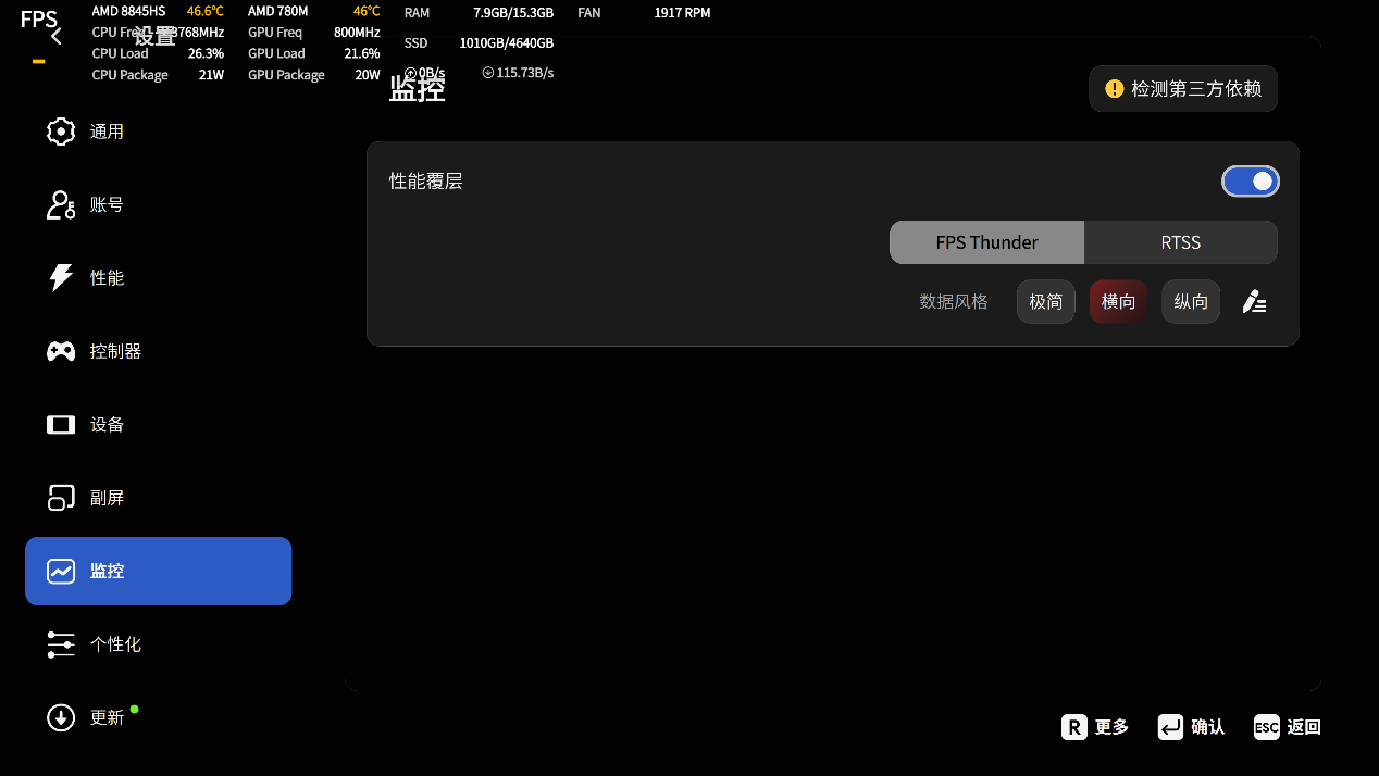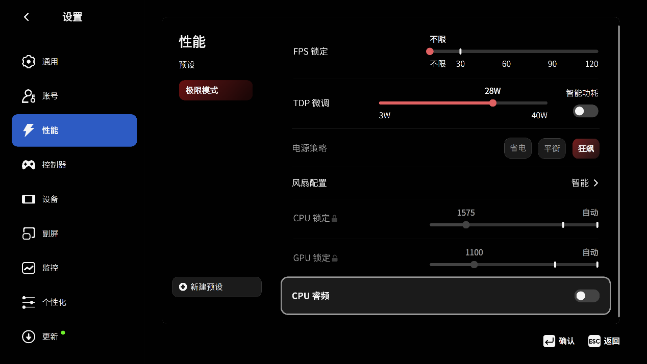 AYANEO AM02预装了AYASpace管理软件,可以快捷调整TDP功耗和风扇转速等参数,提升了综合体验