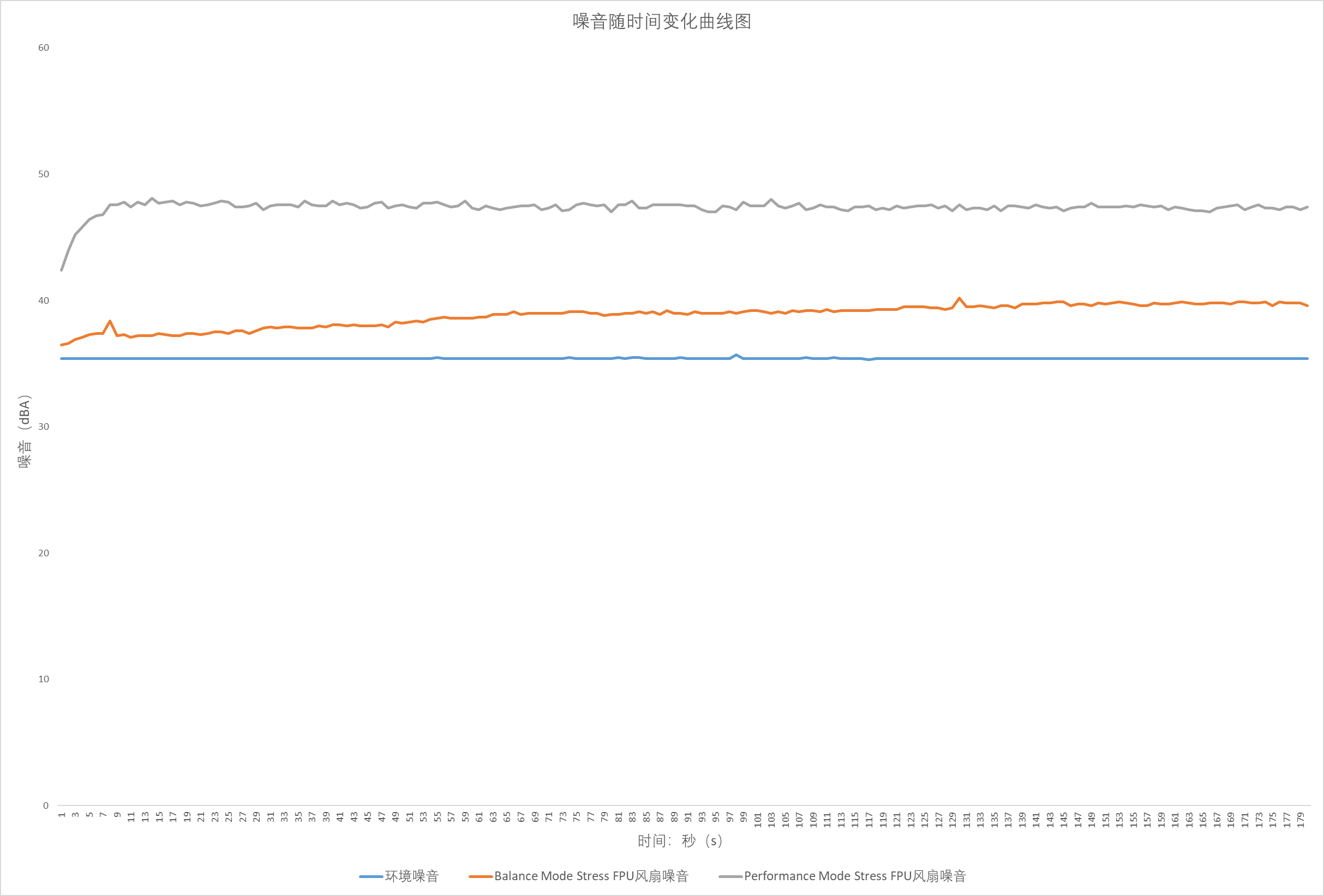▲环境噪音180秒内噪音最大为35.7dB,噪音最低为35.3dB,噪音平均值在35.4dB ▲Balance Mode下Stress FPU 180秒内噪音最大为40.2dB,噪音最低为36.5dB,噪音平均值在38.8dB ▲Performance Mode下Stress FPU 180秒内噪音最大为48.1dB,噪音最低为42.4dB,噪音平均值在47.4dB ▲图表汇总总结