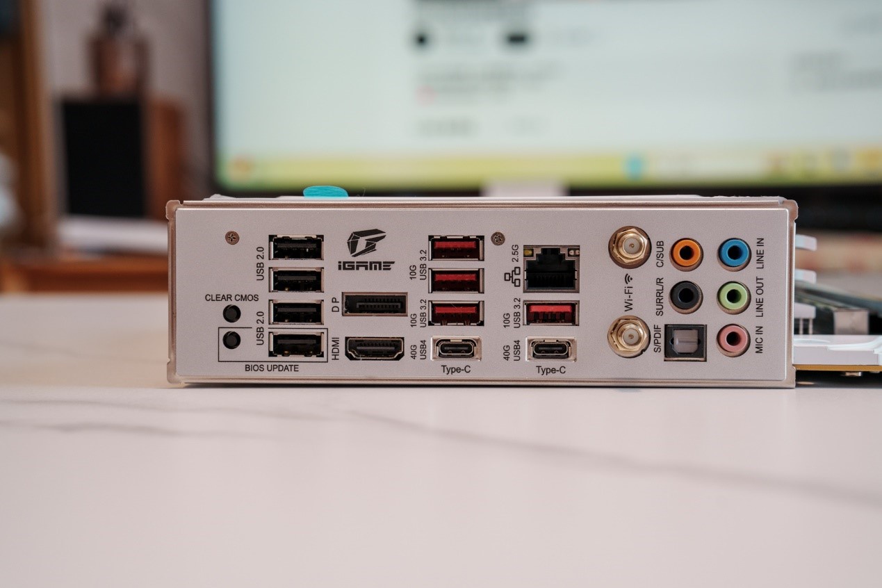 背部I/O接口方面可见WiFi 7、2.5G网卡、一键清空BIOS设置按钮、BIOS盲刷按钮。除此之外,虽然七彩虹iGame Z890 Flow没有配备雷电接口,但是却有两个40GB的超高带宽USB4接口提供相似功能