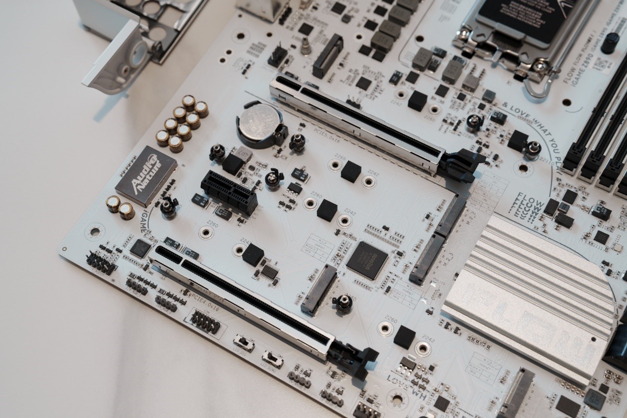 两条全尺寸PCI-E接口,上面那条支持5.0 X16,下面那条支持4.0 X4,比较遗憾的是七彩虹iGame Z890 Flow的PCI-E 5.0 X16接口没有得到拆分,不过那本身就是旗舰板的待遇,Flow这种定位没有也很正常。