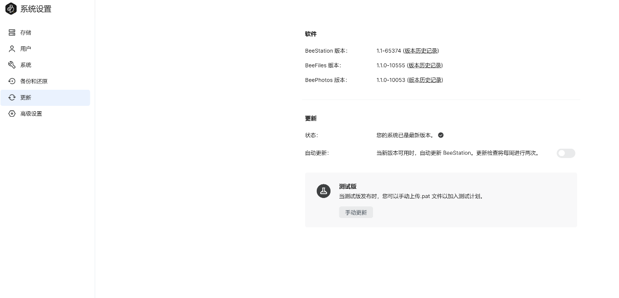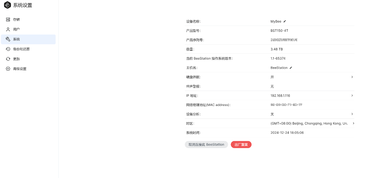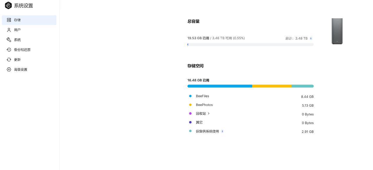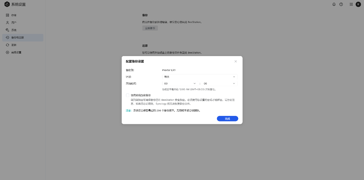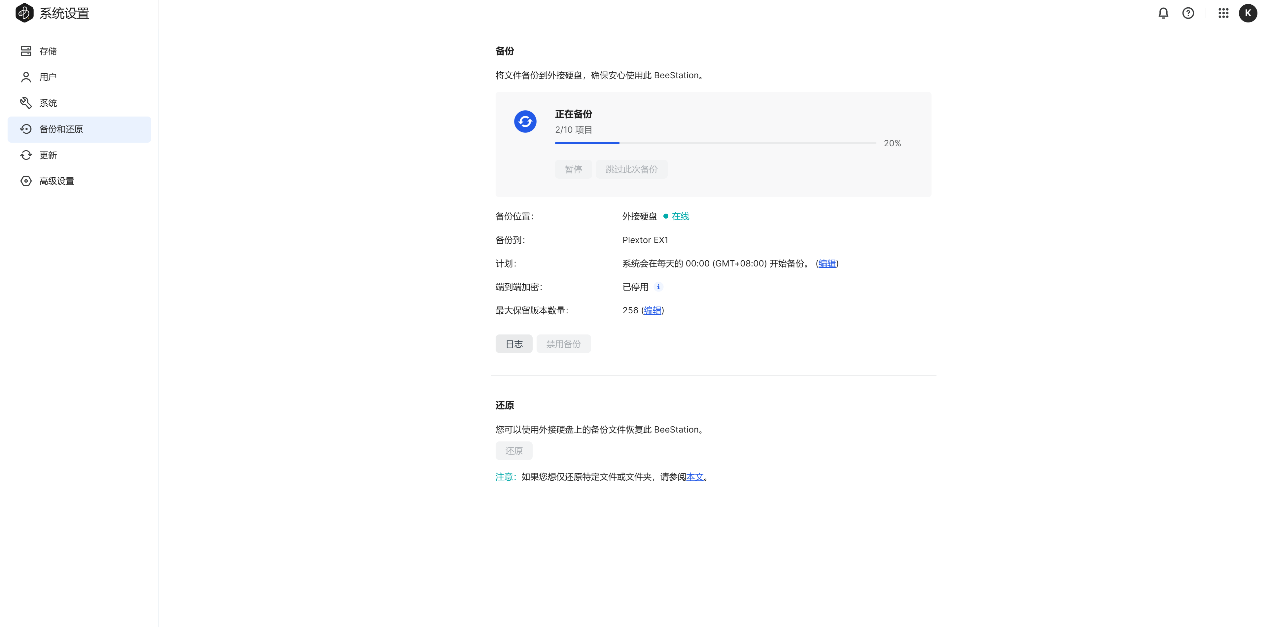 ▲【系统设置】-【储存】,这里可以查看当前硬盘使用量;硬盘容量为4TB,系统显示3.48TB ▲【用户】中可以展示当前的拥有者(使用群晖账户的管理员账号) ▲【系统设置】-【系统】,这里可以查看当前的设备名称、产品型号、产品序列号、IP地址等信息;可以在此页面对BeeStation进行出厂重置 ▲【系统设置】-【备份和还原】,可以将BeeStation文件备份到外接硬盘,或者将外接硬盘上备份的文件恢复到BeeStation ▲将移动硬盘连接上BeeStation,点击立即备份,可以看到备份设置,可以选择计划,是否使用密码加密等等 ▲开始备份,可以看到备份位置是外接硬盘,外接硬盘型号是Plextor EX1,最大可以备份256个版本 ▲当BeeStation上资料丢失后,可以选择将之前备份到移动硬盘上的文件恢复至BeeStation ▲【系统设置】-【更新】,查看当前的固件版本,检查更新固件 ▲【系统设置】-【高级设置】,可以设置本体账户,开启SMB服务BeePhotos