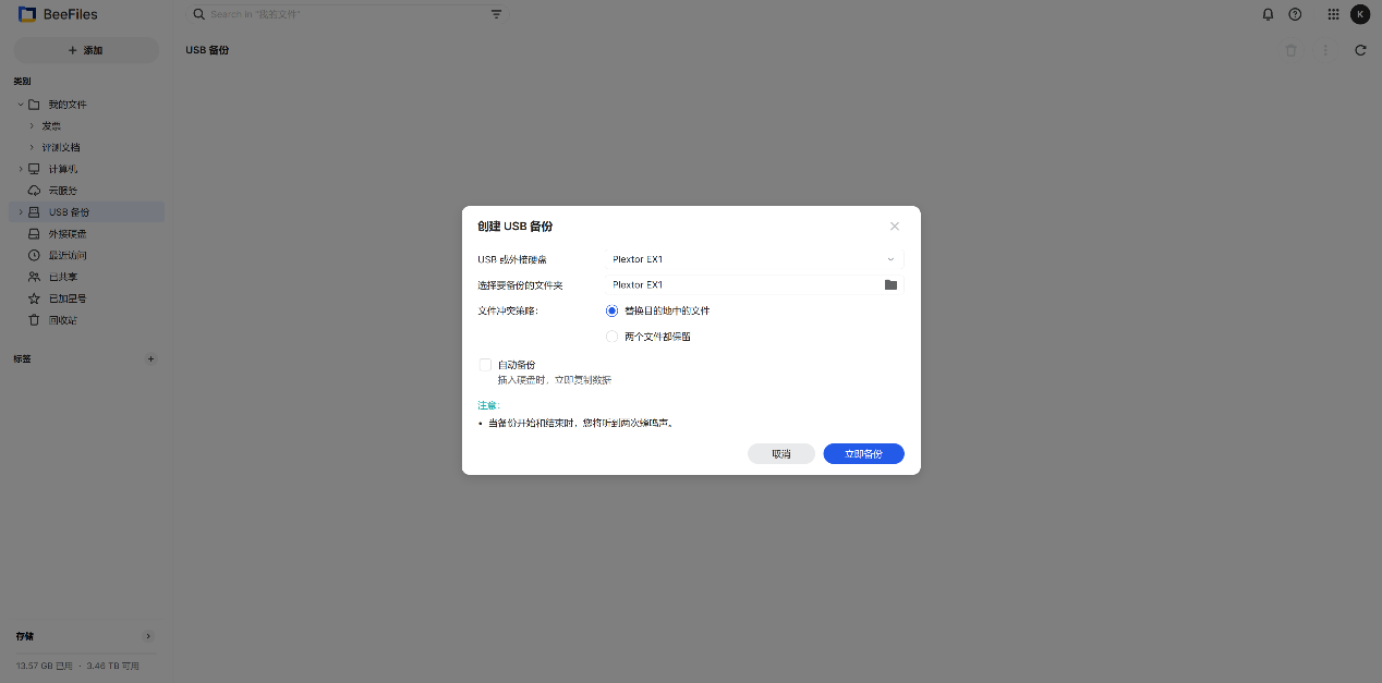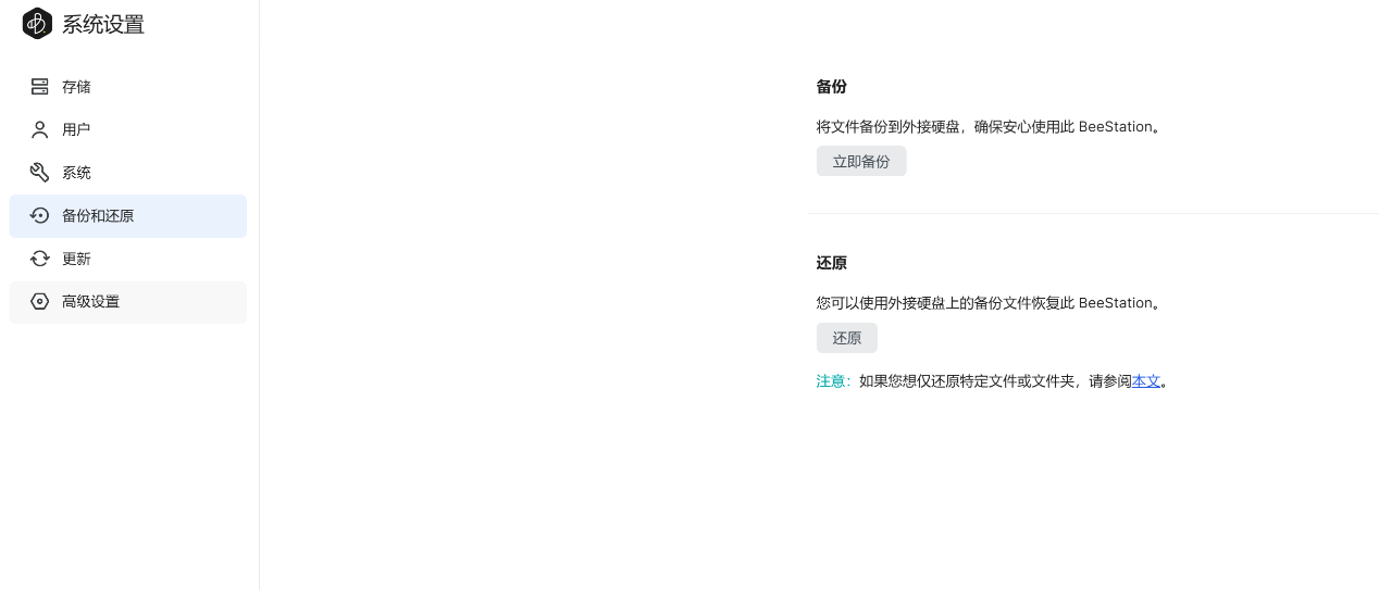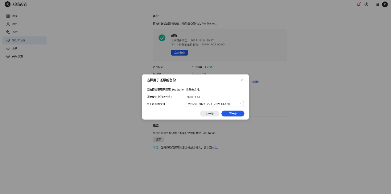BeeStation支持数据备份和还原选项,可以备份到外部硬盘,并在数据损失后从移动硬盘恢复,确保用户数据的安全