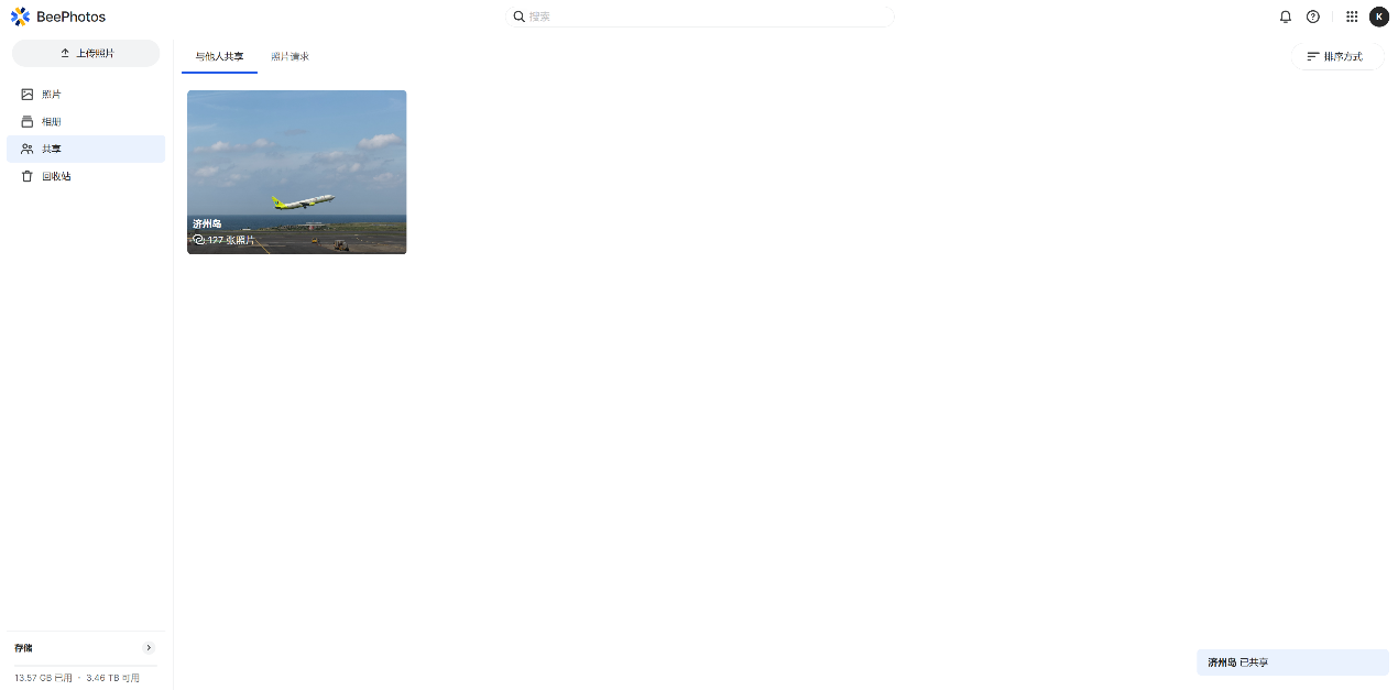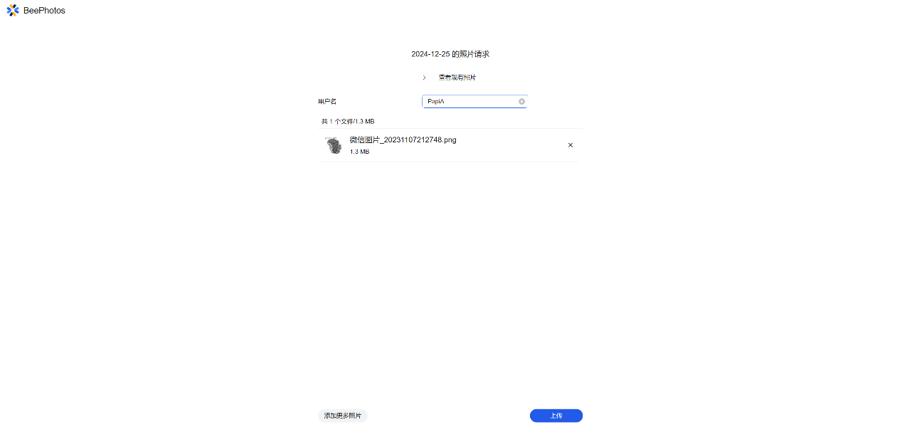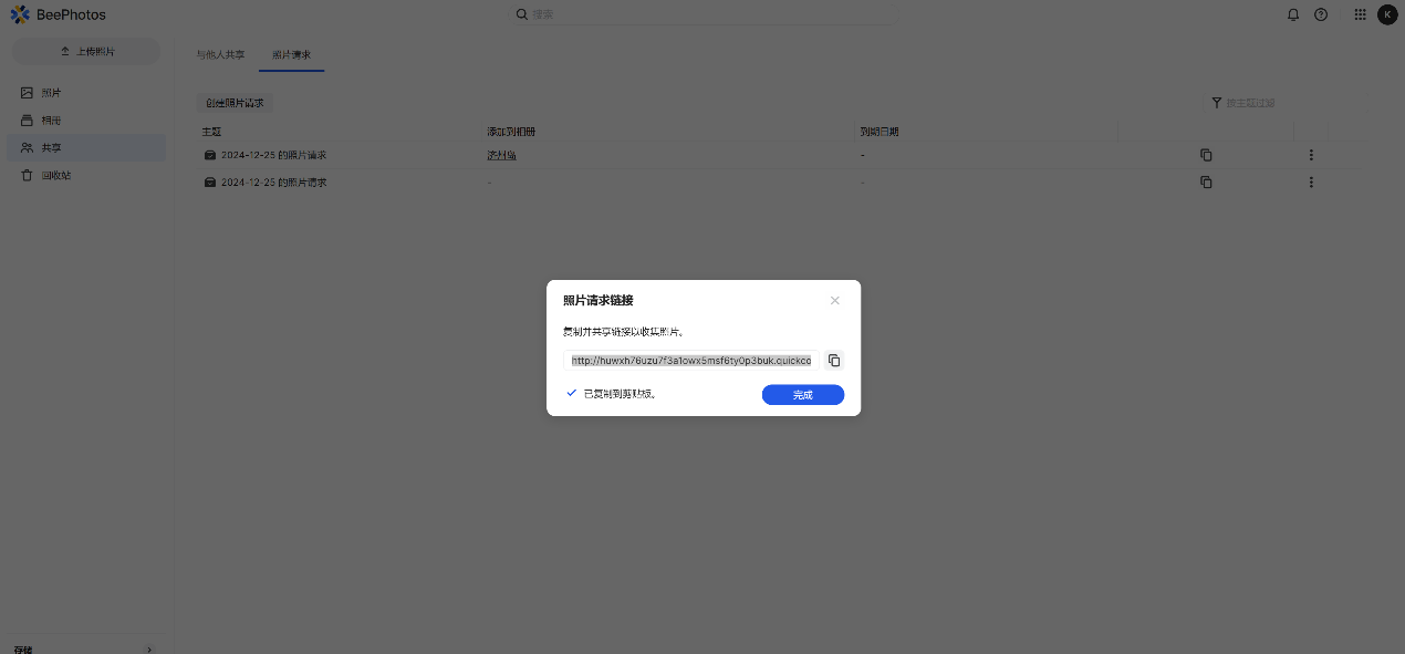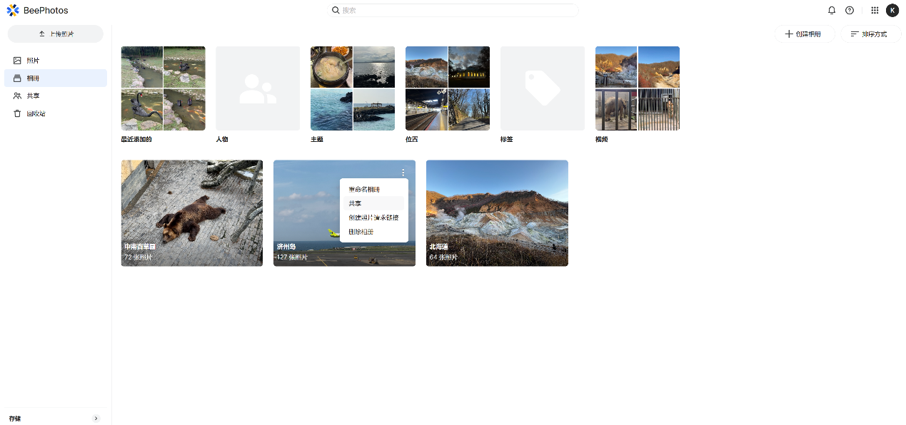 ▲进入BeePhotos主页面,点击左侧【照片】,右侧会按照时间线排序所有照片 ▲在搜索栏搜索地点信息,可以将所有该地点的照片筛选出来 ▲点击右侧【快速筛选】,可以按照文件类型【照片】或者【视频】来展示,图中勾选【视频】后,左侧会按照时间先后展现所有视频 ▲图中勾选【照片】后,左侧会按照时间先后展现所有照片;除此之外,还可以按照【拍摄日期】,或者【地理位置】来划分照片 ▲点击【相册】,可以按照【人物】、【主题】、【位置】、【标签】来分类;家中有宝宝的也可以使用BeePhotos直接筛选出所有宝宝照片来创建宝宝相册 ▲对相册进行重命名,共享,以及创建照片请求链接 ▲共享相册后会产生共享链接,将其分享给家人或者朋友,可以设置共享相册的密码以及共享到期时间 ▲共享过的相册,会显示在左侧的【共享】中 ▲创建照片请求,勾选将上传的照片是否添加至共享相册 ▲创建成功后就可以看到照片请求链接了,与其他人共享,通过此链接登录的用户都可以上传照片 ▲可以上传自己的照片至共享相册,也可以查看共享相册中现有的照片 ▲上传的照片会出现在共享相册中BeeFiles