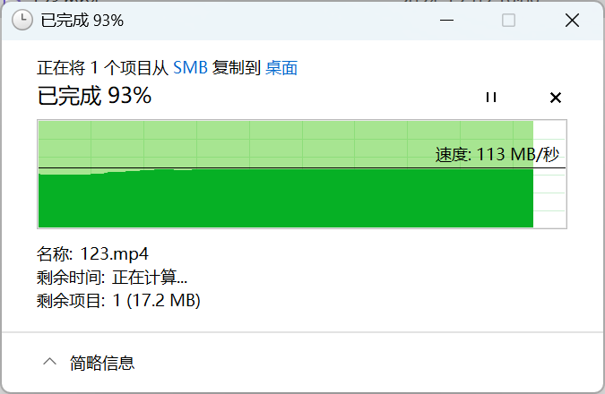 ▲使用1GbE网口向BeeStation中写入文件时,写入速率在108MB/s左右 ▲使用1GbE网口向BeeStation中取回文件时,写入速率在113MB/s左右总结