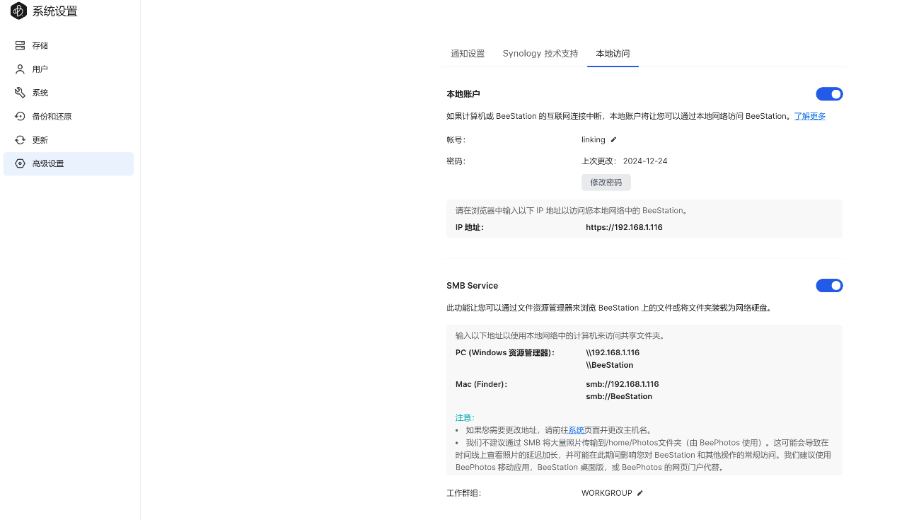 ▲进入BeeFiles页面,点击【我的文件】,这里会展示BeeStation上的所有文件 ▲对文件进行加星号,预览或者共享等 ▲如果USB接口上外接了移动硬盘,会在【外接硬盘】中显示 ▲查看、复制外接硬盘中的文件到BeeStation,也可以将BeeStation中的文件复制进移动硬盘 ▲BeeStation可以将电脑上的文件夹同步到BeeStation,需要下载BeeStation桌面版 ▲来到BeeStation桌面版 ▲BeeStation桌面版登录需要群晖账户,无法使用本地账户和密码登录 ▲登录后会在电脑上的C:\Users\linking\BeeStation位置创建文件夹 ▲在此文件夹中可以看到BeeStation上的所有文件,可以将PC中的文件复制进BeeStation,也可以将BeeStation上的文件复制到PC,实现双向同步 ▲创建USB备份,将外接硬盘中的资料全部备份至BeeStation ▲任务开始后会在【USB备份】中显示,只是不显示进度条有点不方便SMB性能