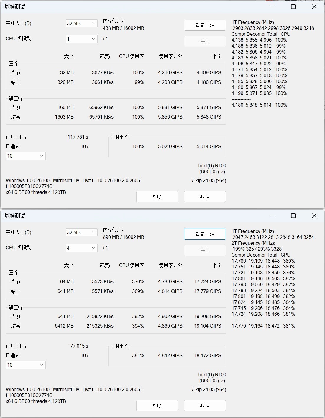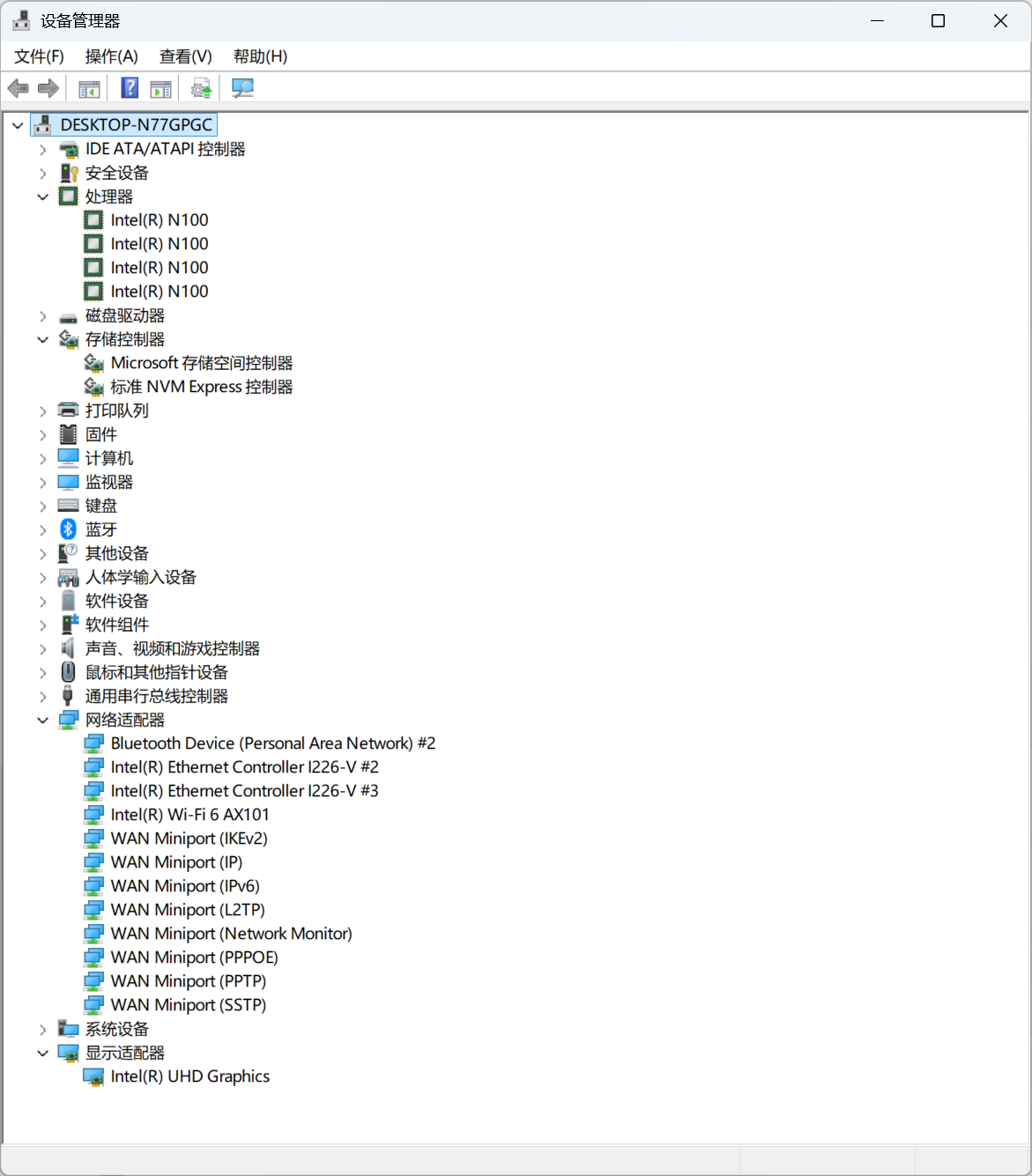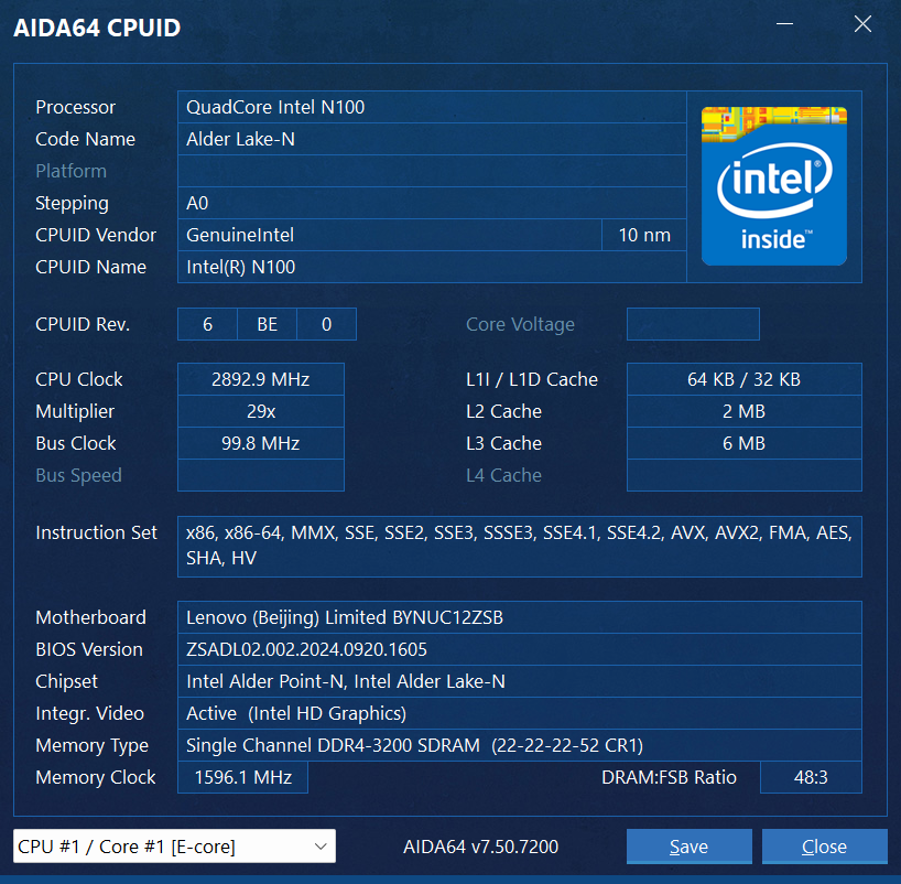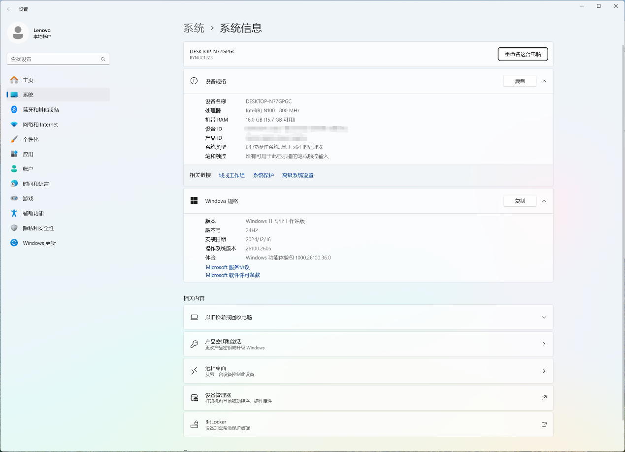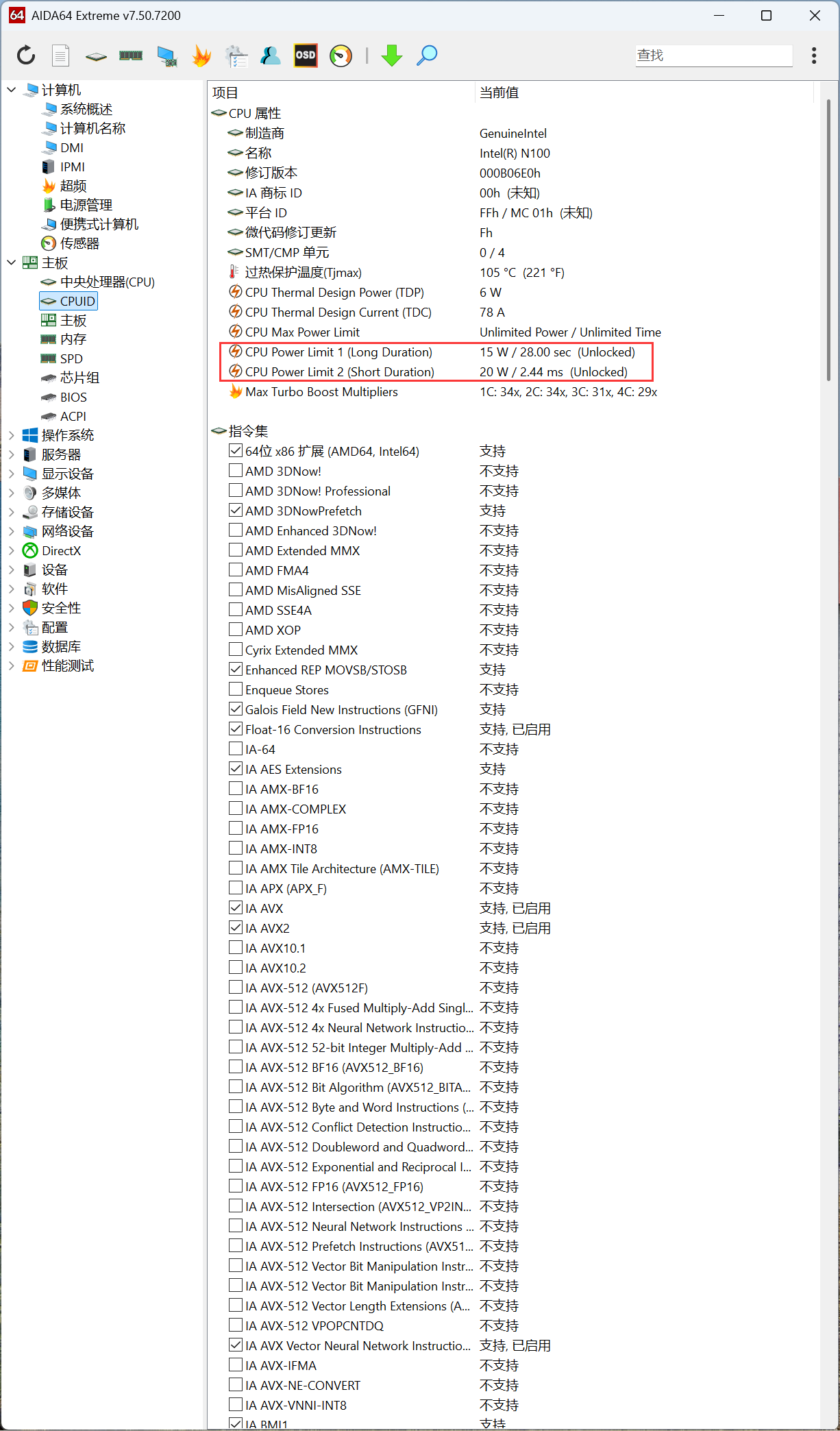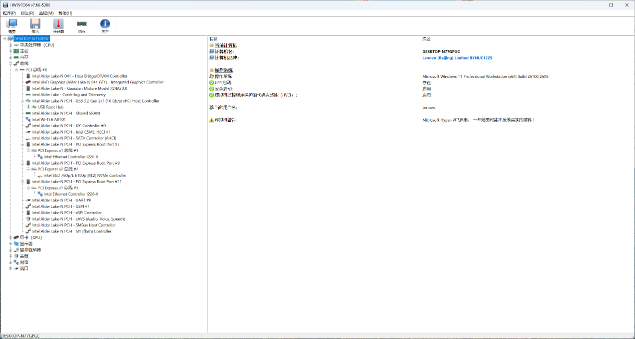▲联想百应Mini-PC搭载了Intel N100 CPU,为其准备的内存容量为16G(单通道)。预装系统是正版Windows 11 24H2专业工作站版 ▲设备管理器信息,CPU是Intel N100 四核心四线程,核显为Intel UHD,无线网卡为AX101 ▲AIDA64信息,CPU的PL1为15W,PL2为20W ▲CPU ID ▲PCIe通道分布信息性能测试