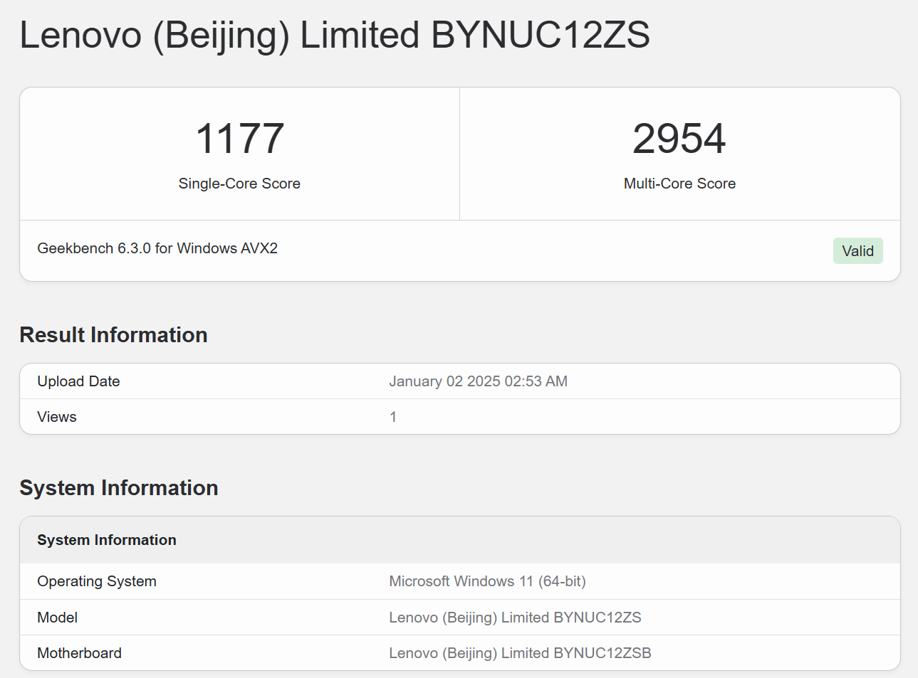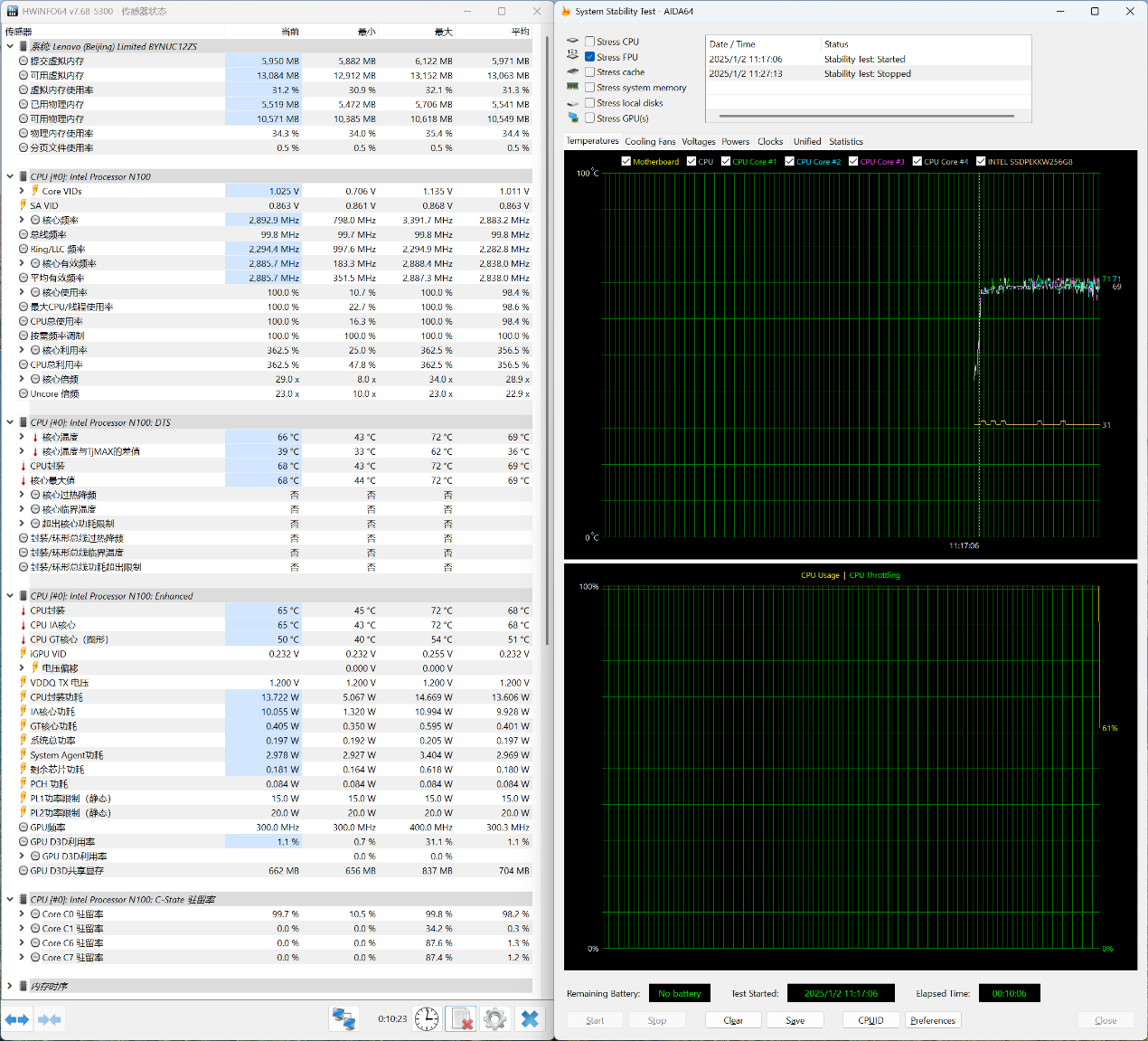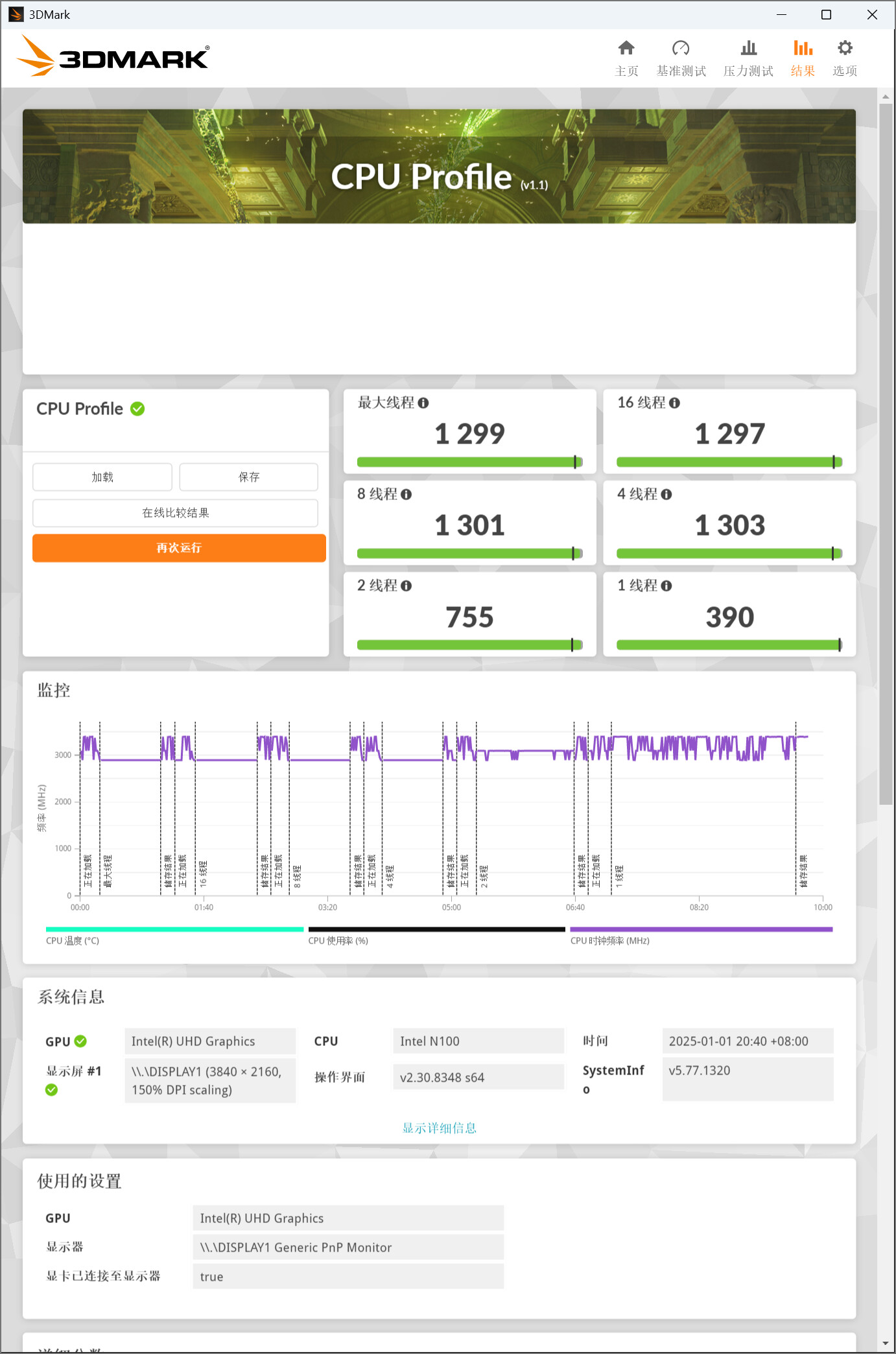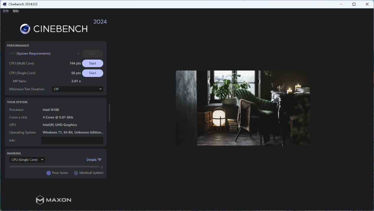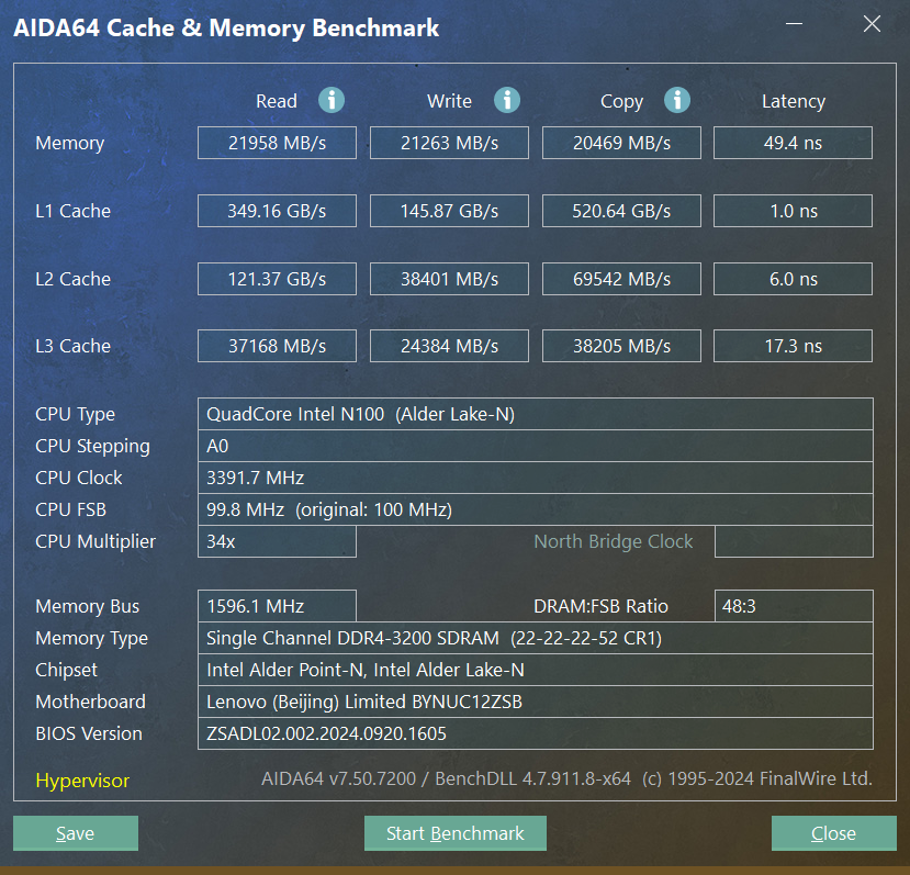 ▲联想百应Mini-PC搭载了Intel N100 CPU,为其准备的内存容量为16G(单通道)。预装系统是正版Windows 11 24H2专业工作站版 ▲设备管理器信息,CPU是Intel N100 四核心四线程,核显为Intel UHD,无线网卡为AX101 ▲AIDA64信息,CPU的PL1为15W,PL2为20W ▲CPU ID ▲PCIe通道分布信息性能测试