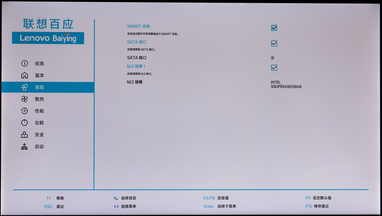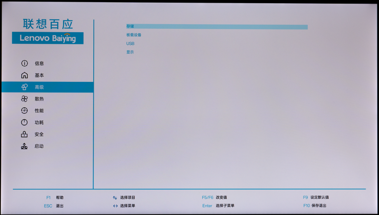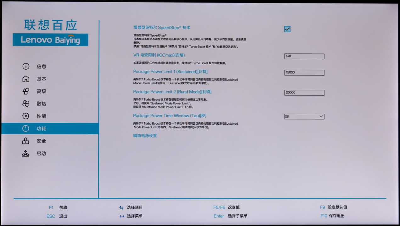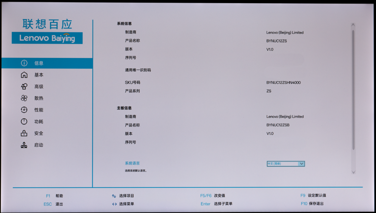 ▲联想百应BIOS产品信息页面,可以显示NUC名称,序列号等信息 ▲主页面可以查看当前CPU型号,内存容量、内存频率、BIOS版本等信息 ▲【高级设置】 ▲【高级设置】—【储存】中可以查看当前SATA和M.2插槽使用状况,这里可以看到安装的SSD是Intel 760p 256G ▲【高级设置】—【板载设备】中可以对蓝牙,音频、有线网卡、无线网卡进行关闭或者开启 ▲【高级设置】—【USB】中可以对NUC上所有USB端口进行打开或者关闭 ▲【高级设置】—【显示】中对GPU的显存容量进行设定 ▲散热中可以看到风扇当前模式,有用户自定义、智能模式、PWM固定模式三种模式可选 ▲性能选项中可以启用Turbo Boost技术,设置性能核活动数量 ▲功耗中可以查看当前CPU的PL1和PL2,图中可以看到PL1=15W,PL2=20W系统信息