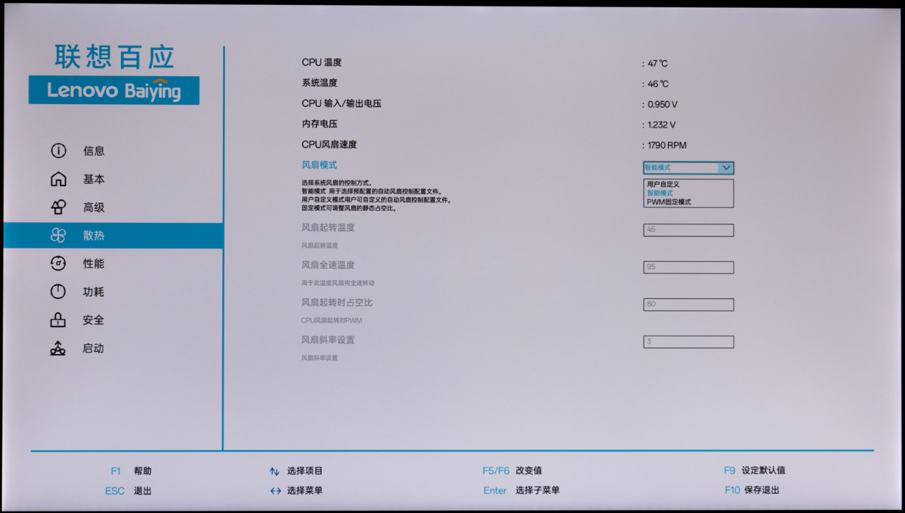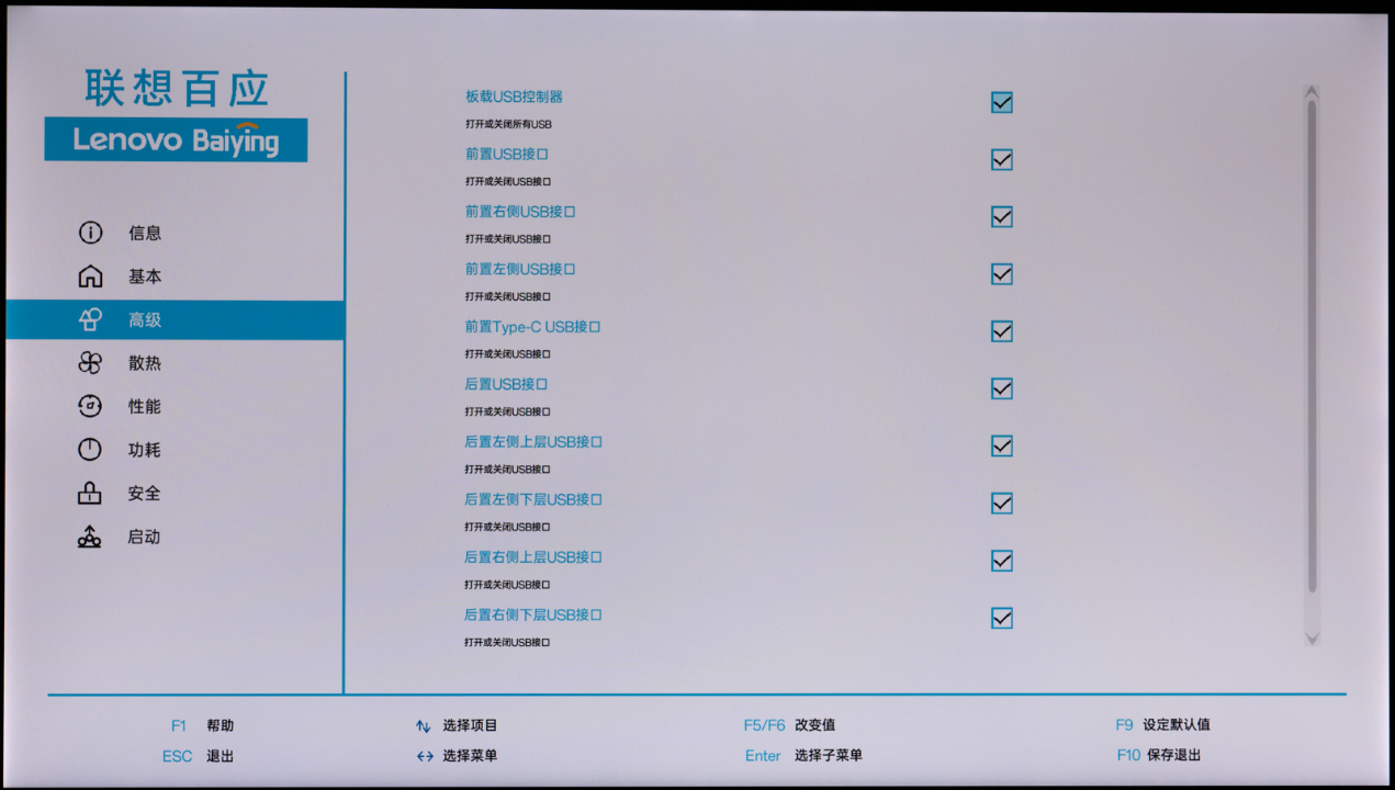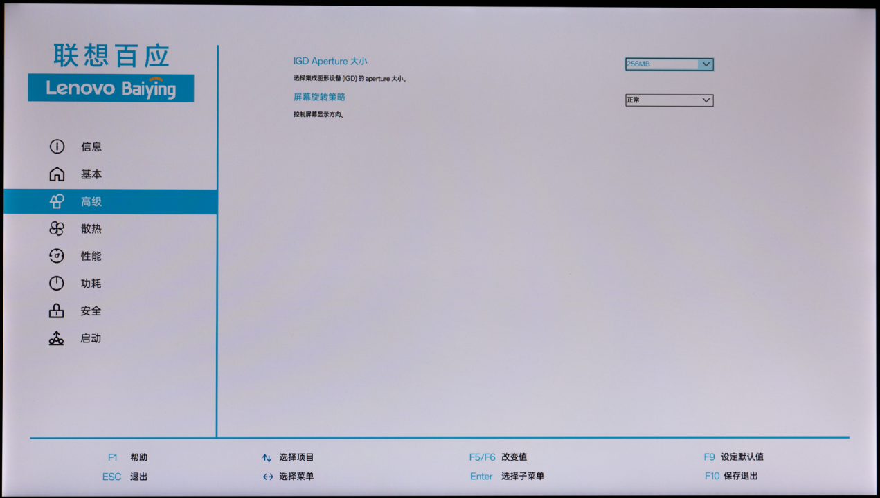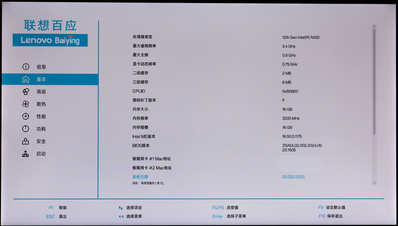 ▲联想百应BIOS产品信息页面,可以显示NUC名称,序列号等信息 ▲主页面可以查看当前CPU型号,内存容量、内存频率、BIOS版本等信息 ▲【高级设置】 ▲【高级设置】—【储存】中可以查看当前SATA和M.2插槽使用状况,这里可以看到安装的SSD是Intel 760p 256G ▲【高级设置】—【板载设备】中可以对蓝牙,音频、有线网卡、无线网卡进行关闭或者开启 ▲【高级设置】—【USB】中可以对NUC上所有USB端口进行打开或者关闭 ▲【高级设置】—【显示】中对GPU的显存容量进行设定 ▲散热中可以看到风扇当前模式,有用户自定义、智能模式、PWM固定模式三种模式可选 ▲性能选项中可以启用Turbo Boost技术,设置性能核活动数量 ▲功耗中可以查看当前CPU的PL1和PL2,图中可以看到PL1=15W,PL2=20W系统信息