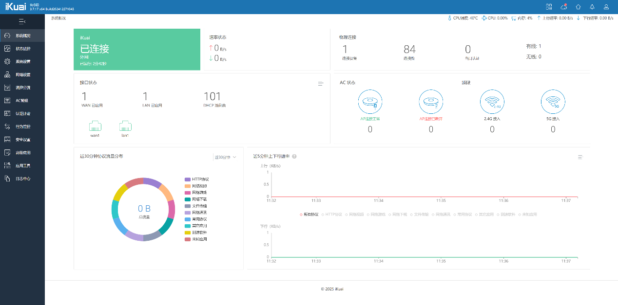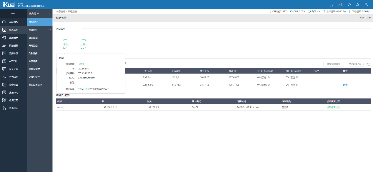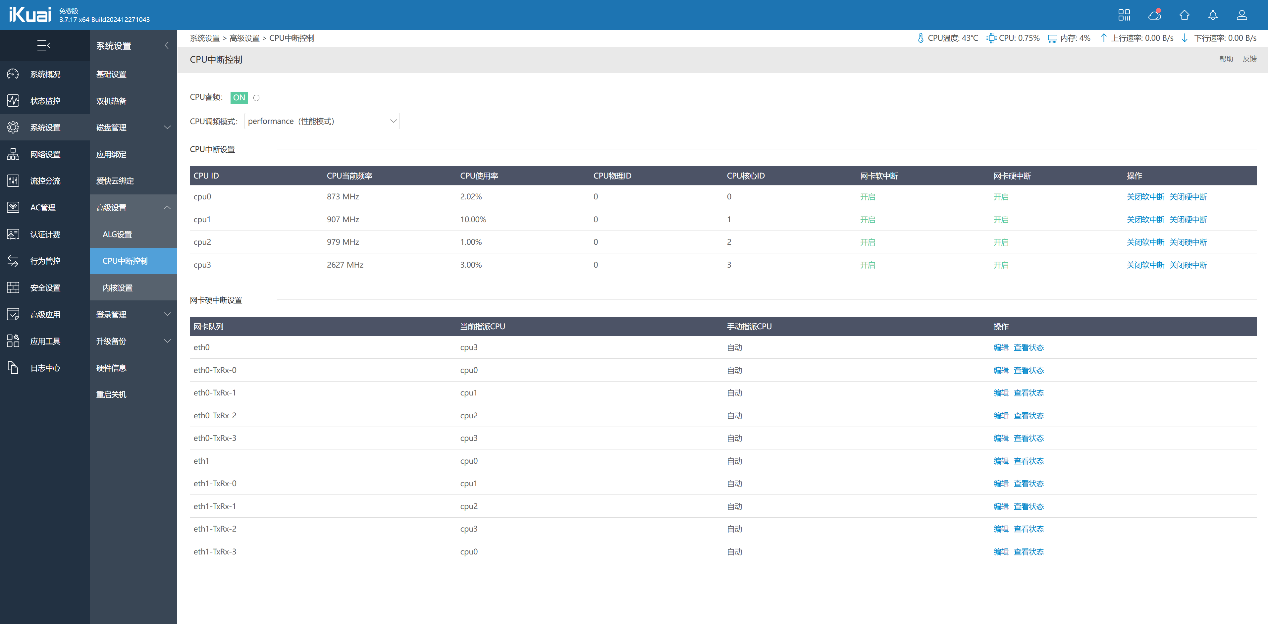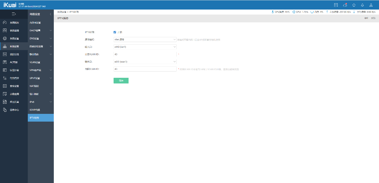 ▲使用U盘安装ikuai OS的时候需要将BIOS中的安全启动关闭,这样才能顺利安装,进入系统主页面,可以在右上角查看当前CPU温度和内存占用率 ▲当前CPU可以看到是N100,两个网卡都是Intel i226-V ▲在【CPU中断控制】中可以启用CPU睿频,将CPU调频模式设置为性能模式 ▲新版本的ikuai OS支持IPTV透传,即便只有两个网口,也可以使用vlan透传观看IPTV了 ▲网口工作在2.5Gbps速率,线路无丢包总结