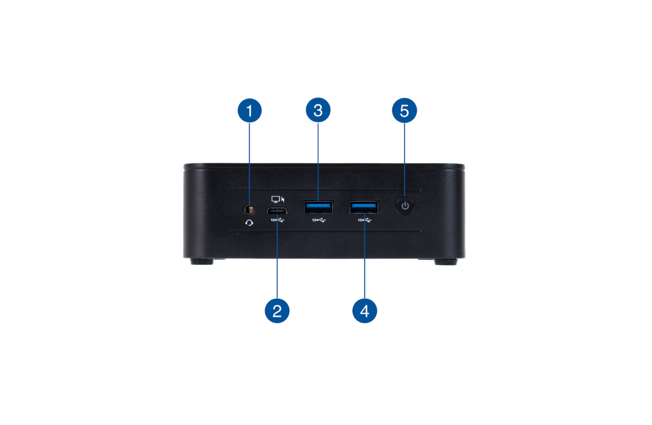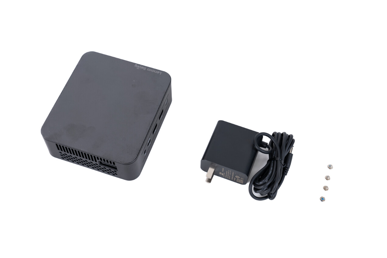 ▲联想百应Mini-PC采用牛纸皮盒子包装。正面是Mini-PC的图片 ▲所有附件一览;NUC本体、电源适配器、螺丝 ▲电源适配器最大输出规格为19V 3.42A,65W的输出功率;采用USB-C端口供电 ▲联想百应Mini-PC正面IO接口一览1.3.5mm音频接口