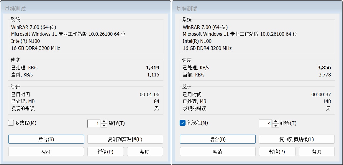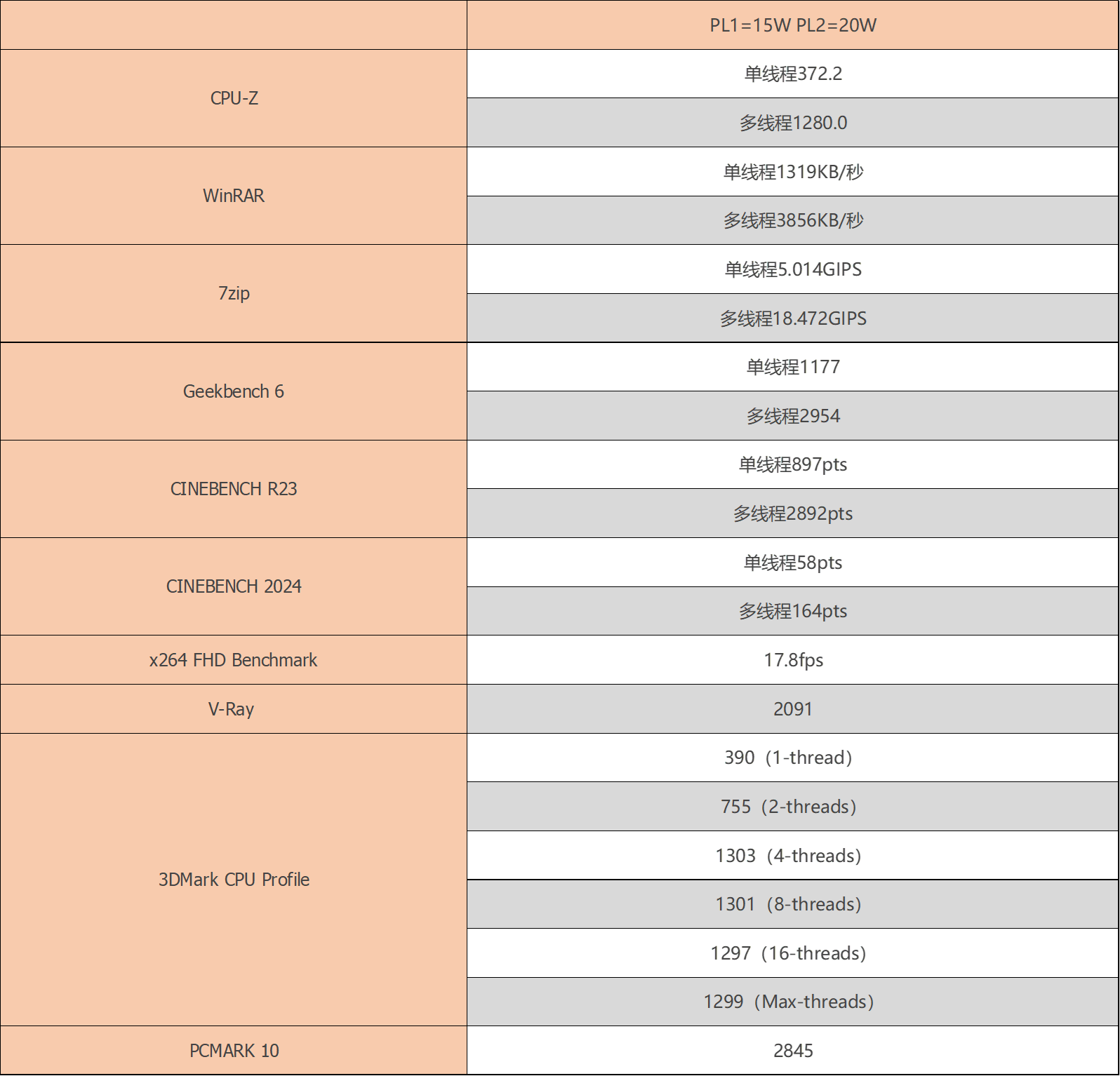 ▲CPU-Z测试分数;单线程372.2,多线程1280.0 ▲WINRAR 7.00单线程和多线程测试 ▲7-Zip 24.05单线程和多线程测试 ▲Geekbench 6测试,单核心分数为1177,多核心分数为2954 ▲CINEBENCH R23测试,单核心分数为897pts,多核心分数为2892pts ▲CINEBENCH 2024测试,单核心分数为58pts,多核心分数为164pts ▲V-Ray Benchmark得分2091 ▲x264 FHD Benchmark,x264视频编码测试程序。Intel N100每秒可渲染17.8帧 ▲3DMark CPU Profile测试,可以测试CPU在不同线程下的性能表现 ▲PCMARK 10分数2845;常用基本功能得分5872,生产力得分4473,数位内容创作得分2379 ▲数据汇总;从测试结果来看,联想百应Mini-PC N100不仅适合家庭办公、学生学习,也适用于小型企业的运作,特别是在文字编辑、表格处理及在线会议等日常办公场景温度和功耗