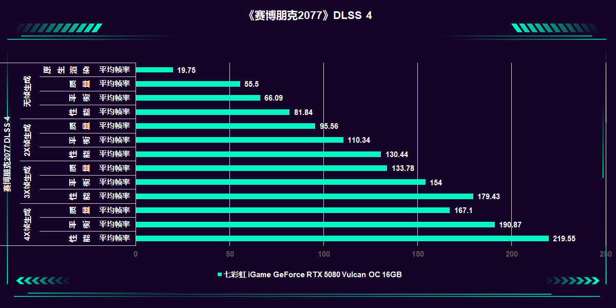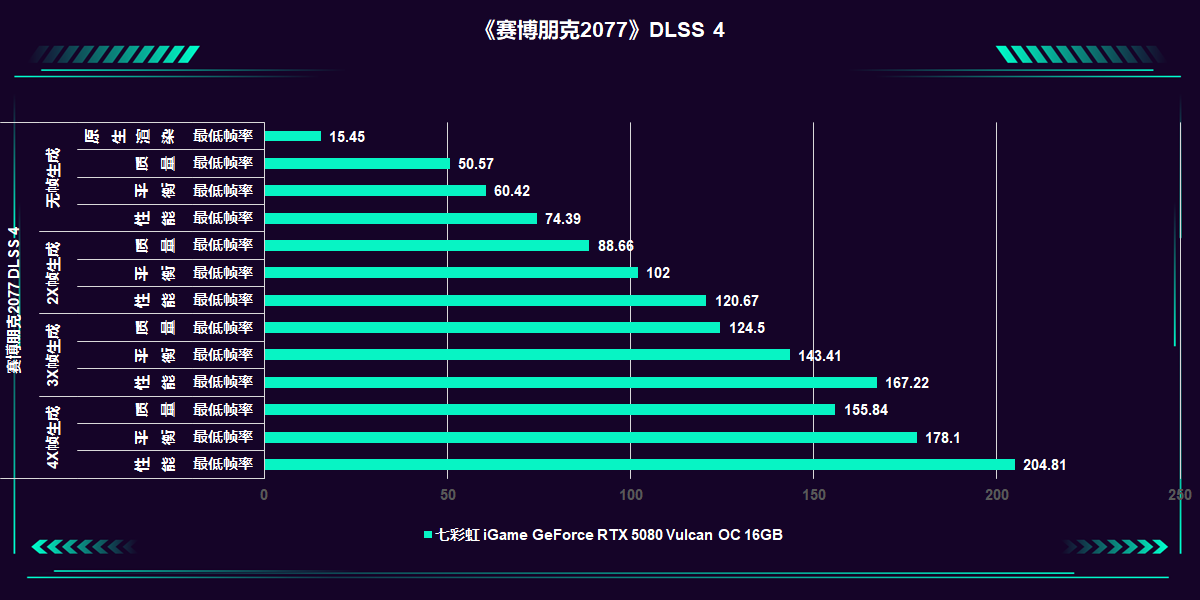 在《赛博朋克 2077》的测试中,多帧生成均展示了其强大效能,特别时最低帧率从原生渲染的15.45帧提高到了204.81,提升幅度超过10倍,可见DLSS 4对应这种原生帧率较低的极端情况也是游刃有余。