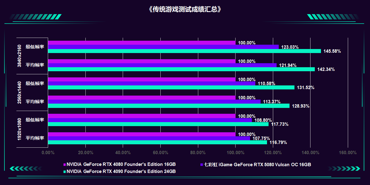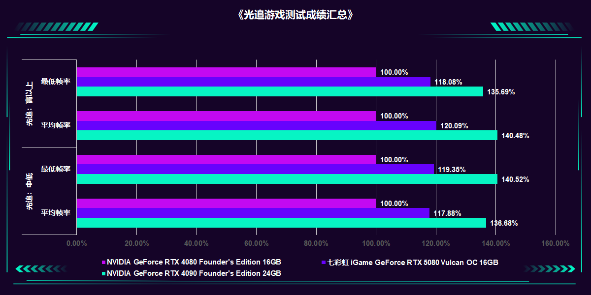 可以看到在较高负载的情况下,七彩虹iGame GeForce RTX 5080 Vulcan OC 16GB显卡的性能相比NVIDIA GeForce RTX 4080 Founder’s Edition 16GB要高20%左右,基本符合一代显卡的正常提升。