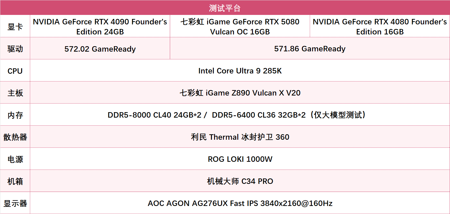 本次测试基本延续了之前RTX 5090 D的平台,只不过参测产品增加了NVIDIA GeForce RTX 4080 Founder’s Edition 16GB作为上一代产品的对照。