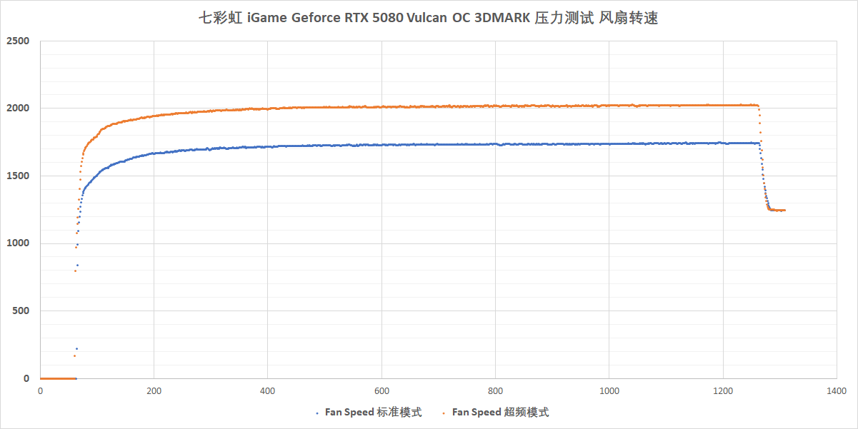 标准模式的风扇转速维持在1700RPM出头,而超频模式的风扇则达到了2000RPM,随之带来噪音相比标准模式也有一定的提高。