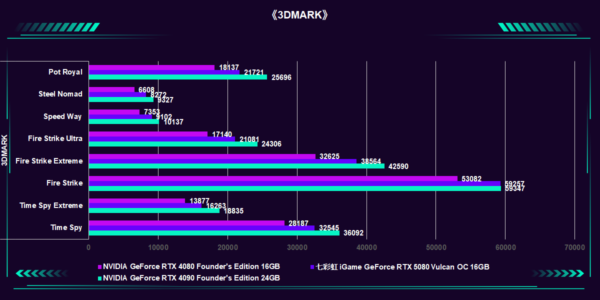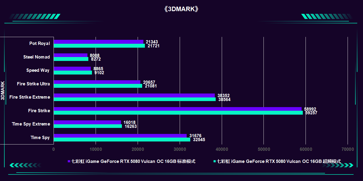在3DMARK基准测试中,除了1080P的Fire Strike测试,其余测试iGame GeForce RTX 5080 Vulcan OC 16GB均为位于GeForce RTX 4080和RTX 4090两张公版显卡中间的位置。