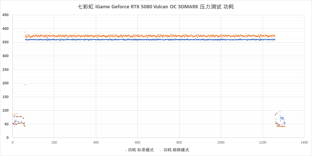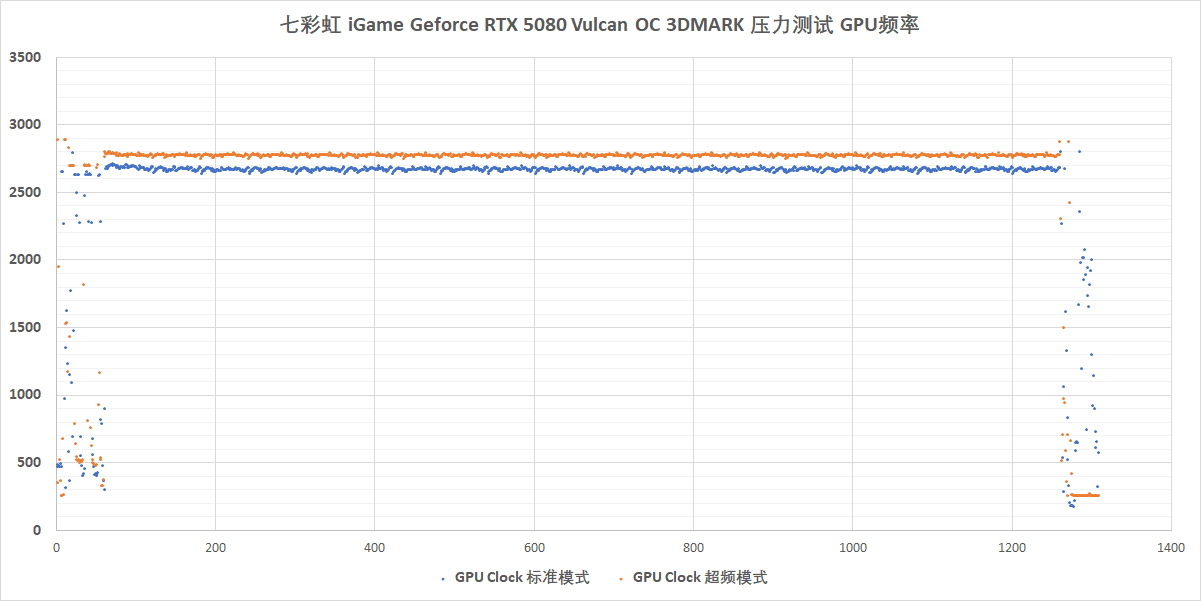 标准模式下(即标频模式)的GPU频率在2675MHz左右,而超频模式下的GPU频率可以维持在2775MHz左右,比标准模式高100Mhz。而功耗方面标准模式几乎维持在360W一条直线,而超频模式则在375W上下浮动。