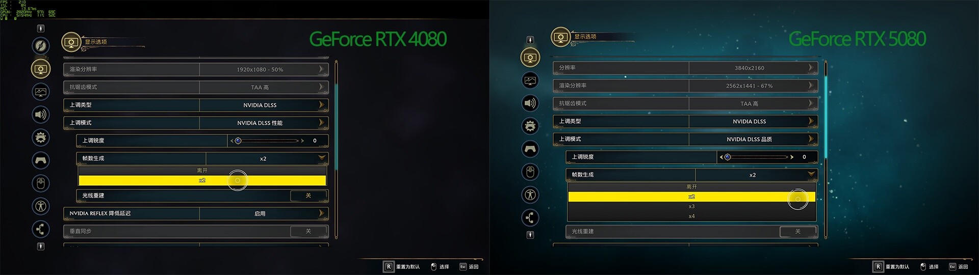 游戏可以识别当前显卡是否支持多帧生成,从而隐藏相关选项,比如我现在拿一张RTX 4080玩《霍格沃兹之遗》时,帧生成智能选择x2,而换成RTX 5080则可以看到x2-x4的多种选项。