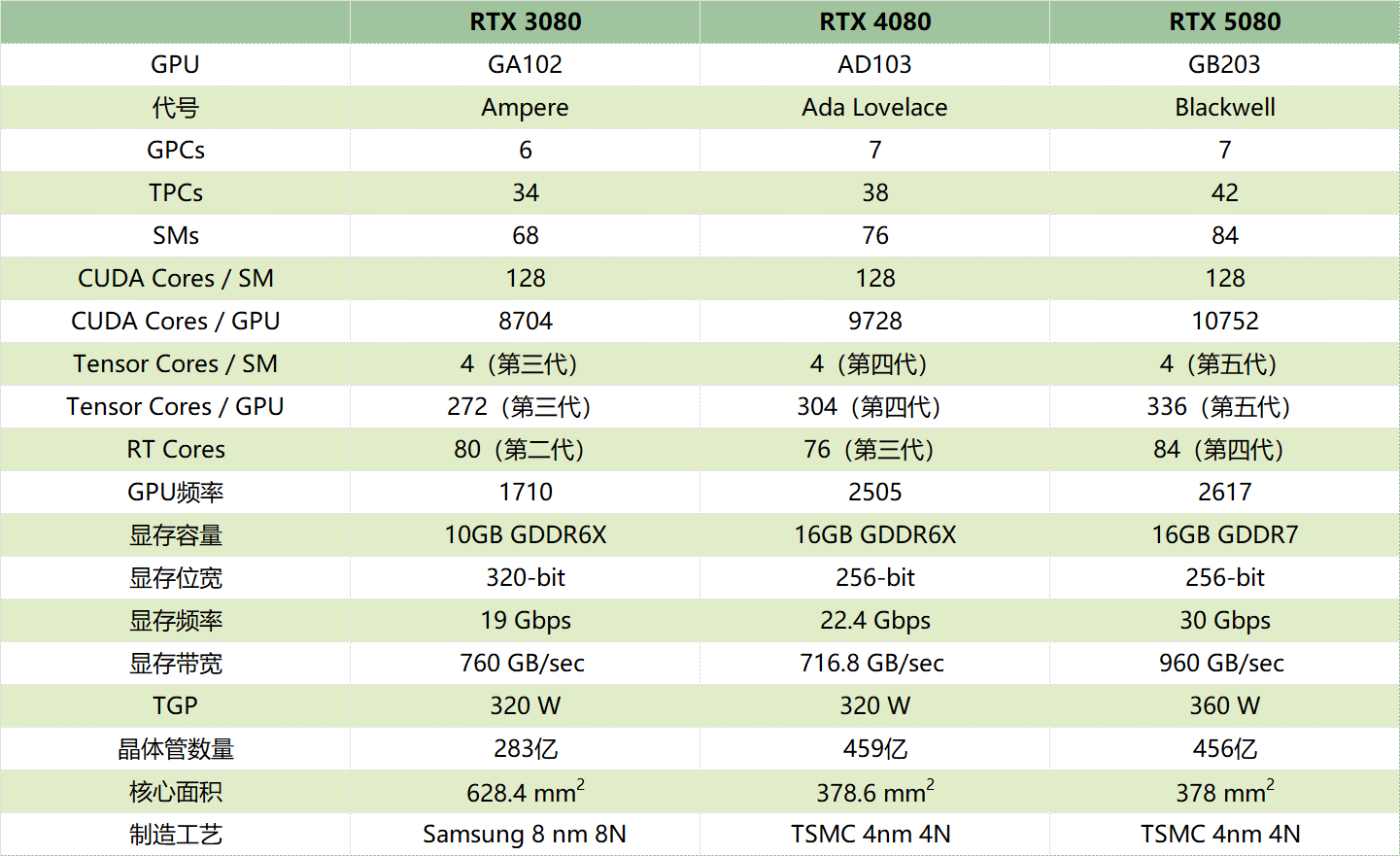 GeForce RTX 5080的GB203总共456亿晶体管,共包括7组GPC、42组TPCs、84组SMs、8组 32-bit 总共256bit显存控制器。