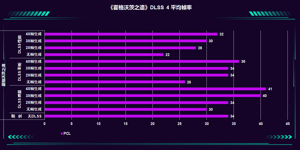 在PCL方面,随着帧生成倍率的增加,延迟有一定程度上的提高,但总体仍在正常范围之内,除了DLSS质量模式的3倍以上帧生成和DLSS平衡模式的4倍帧生成等情况以外,其余均不高于原生渲染的延迟,可见DLSS 4对延迟方面的帮助还是比较大的。
