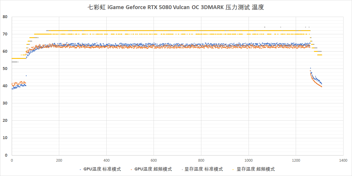 得益于风扇的高转速超频模式的GPU温度要比标准模式低2度左右,平均温度为62度,而标准模式为64度。于此同时,两者的显存温度相差无几,均在维持在72度左右。