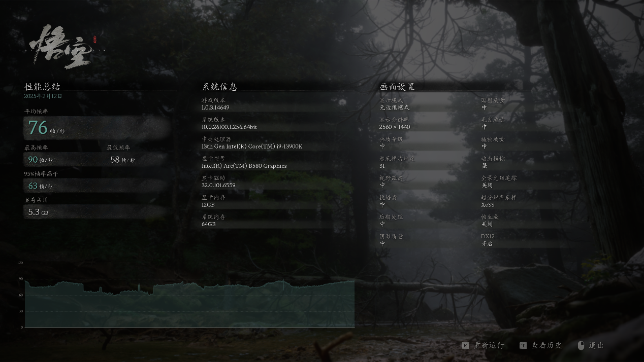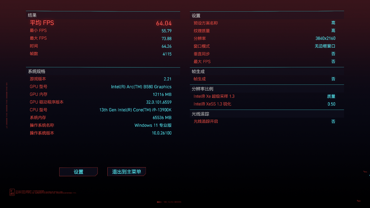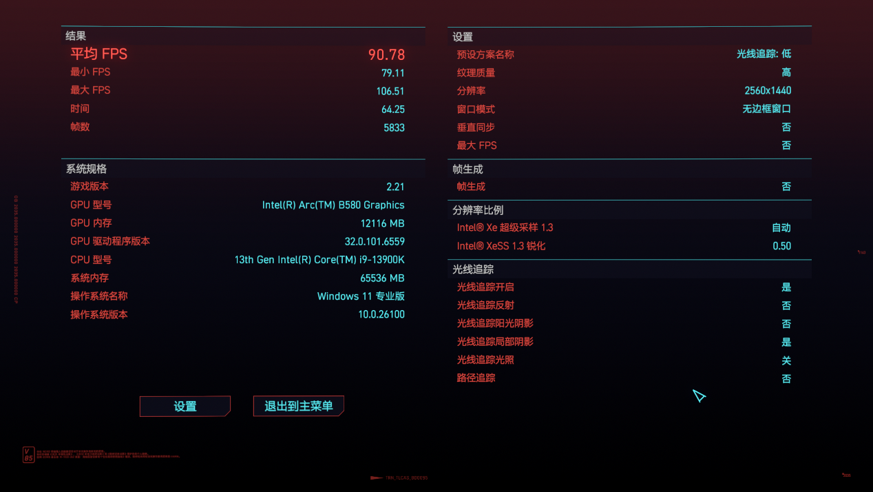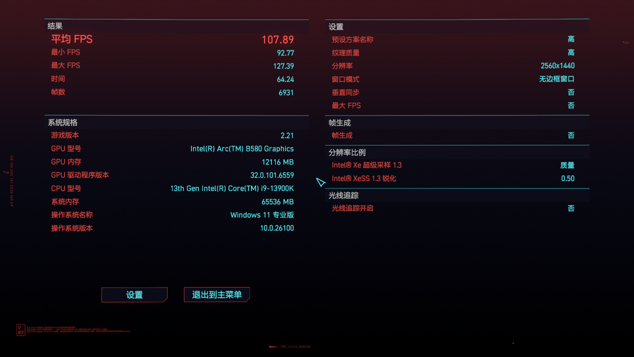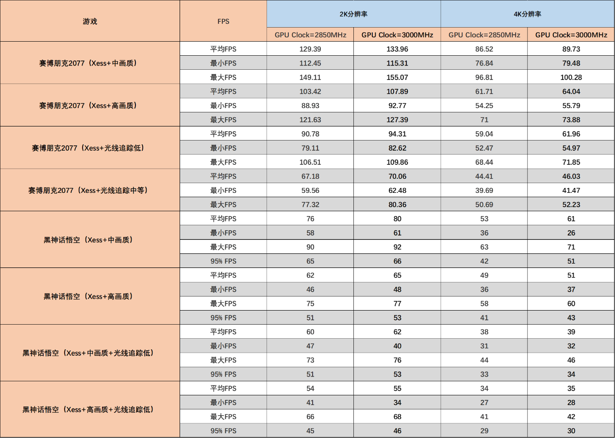 ▲2k中画质,开启Xess,超采样清晰度31;黑神话悟空平均帧率为76帧/秒,最高帧率为90帧/秒,最低帧率为58帧/秒,95%帧率高于65帧/秒 ▲2k高画质,开启Xess,超采样清晰度31;黑神话悟空平均帧率为62帧/秒,最高帧率为75帧/秒,最低帧率为46帧/秒,95%帧率高于51帧/秒 ▲4k中画质,开启Xess,超采样清晰度31;黑神话悟空平均帧率为53帧/秒,最高帧率为63帧/秒,最低帧率为36帧/秒,95%帧率高于42帧/秒 ▲4k高画质,开启Xess,超采样清晰度31;黑神话悟空平均帧率为49帧/秒,最高帧率为58帧/秒,最低帧率为36帧/秒,95%帧率高于41帧/秒 ▲2k中画质,开启Xess,超采样清晰度31,光线追踪低;黑神话悟空平均帧率为60帧/秒,最高帧率为73帧/秒,最低帧率为47帧/秒,95%帧率高于51帧/秒 ▲2k高画质,开启Xess,超采样清晰度31,光线追踪低;黑神话悟空平均帧率为54帧/秒,最高帧率为66帧/秒,最低帧率为41帧/秒,95%帧率高于45帧/秒 ▲4k中画质,开启Xess,超采样清晰度31,光线追踪低;黑神话悟空平均帧率为38帧/秒,最高帧率为44帧/秒,最低帧率为31帧/秒,95%帧率高于33帧/秒 ▲4k高画质,开启Xess,超采样清晰度31,光线追踪低;黑神话悟空平均帧率为34帧/秒,最高帧率为41帧/秒,最低帧率为27帧/秒,95%帧率高于29帧/秒 ▲2k中画质,开启Xess;赛博朋克2077平均帧率为129.39帧/秒,最高帧率为149.11帧/秒,最低帧率为112.45帧/秒 ▲2k高画质,开启Xess;赛博朋克2077平均帧率为103.42帧/秒,最高帧率为121.63帧/秒,最低帧率为88.93帧/秒 ▲4k中画质,开启Xess;赛博朋克2077平均帧率为86.52帧/秒,最高帧率为96.81帧/秒,最低帧率为76.84帧/秒 ▲4k高画质,开启Xess;赛博朋克2077平均帧率为61.71帧/秒,最高帧率为71.00帧/秒,最低帧率为54.25帧/秒 ▲2k光线追踪低,开启Xess;赛博朋克2077平均帧率为90.78帧/秒,最高帧率为106.51帧/秒,最低帧率为79.11帧/秒 ▲2k光线追踪中等,开启Xess;赛博朋克2077平均帧率为67.18帧/秒,最高帧率为77.32帧/秒,最低帧率为59.56帧/秒 ▲4k光线追踪低,开启Xess;赛博朋克2077平均帧率为59.04帧/秒,最高帧率为68.44帧/秒,最低帧率为52.47帧/秒 ▲4k光线追踪中等,开启Xess;赛博朋克2077平均帧率为44.41帧/秒,最高帧率为50.69帧/秒,最低帧率为39.69帧/秒超频模式