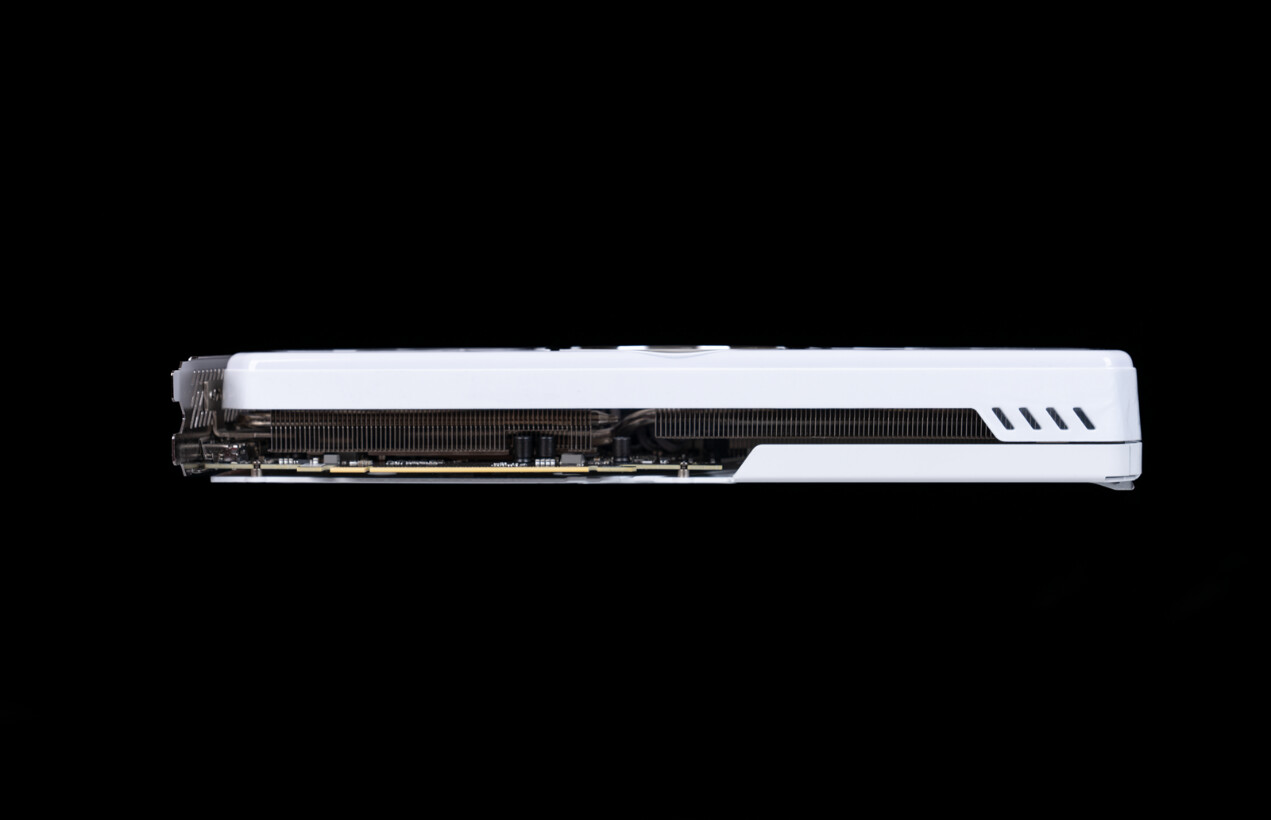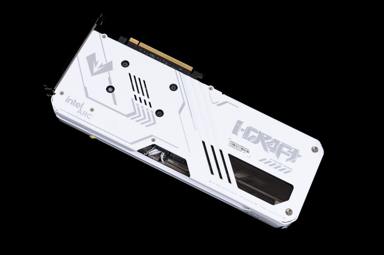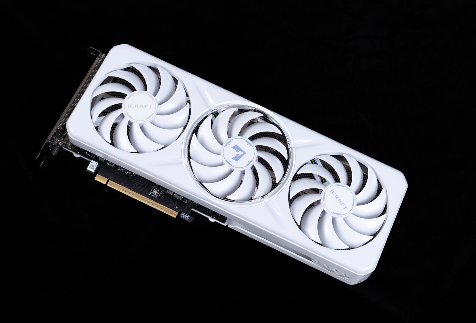 ▲显卡包装盒正面,Intel ARC B580,左上角是铭瑄的icraft Logo ▲铭瑄Intel Arc B580 iCraft 12G显卡采用三风扇设计,三颗9CM FROST风扇都采用11幅密集扇叶,中间风扇反转,两侧风扇正转,正逆转风扇减少绕流,增加进风量,显著提升散热效能,让显卡在高负载下也时刻冷静。此外,三颗风扇支持启停,能够兼顾散热效能和待机风噪 ▲显卡背面是一块高强度iCraft背板,可以有效加固PCB,不易变形,能更好地保护电子元器件。多处散热孔可以散发内部热量,有效辅助通风 ▲中间散热模块带有4根6mm镀镍复合热管,配合大面积高密度鳍片,有效压制芯片发热 ▲铭瑄Intel Arc B580 iCraft 12G显卡采用8+8 Pin ATX 12V供电接口 ▲显卡背部IO接口一览1.HDMI2.1a 48Gbps