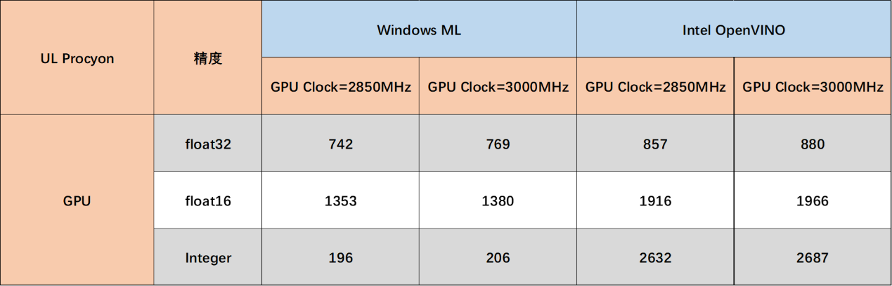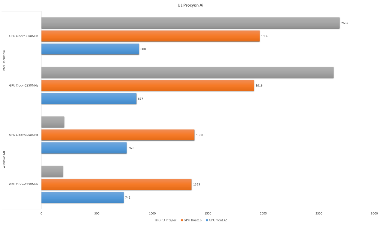 ▲Windows ML GPU Procyon测试,精度float32,得分769 ▲Windows ML GPU Procyon测试,精度float16,得分1380 ▲Windows ML GPU Procyon测试,精度Integer,得分206 ▲Intel OpenVINO GPU Procyon测试,精度float32,得分880 ▲Intel OpenVINO GPU Procyon测试,精度float16,得分1966 ▲Intel OpenVINO GPU Procyon测试,精度Integer,得分2687 ▲数据汇总• 提高GPU频率对性能的提升有限,但仍然有一定的正面影响,尤其是在Integer精度下的提升较为显著