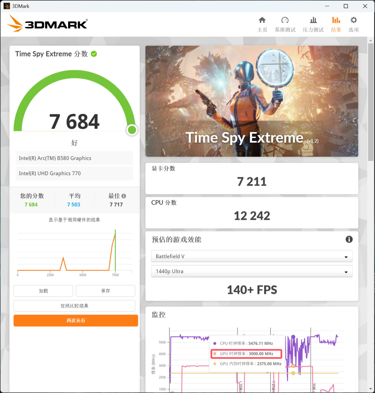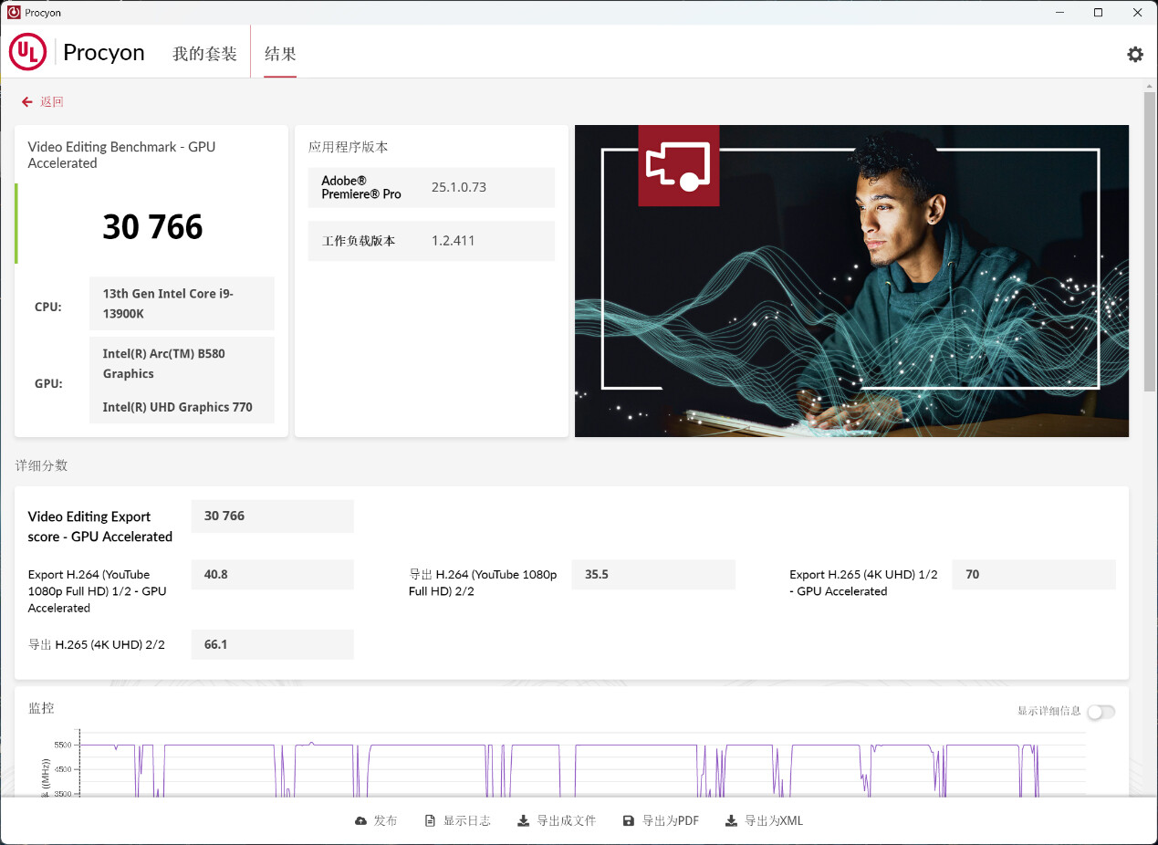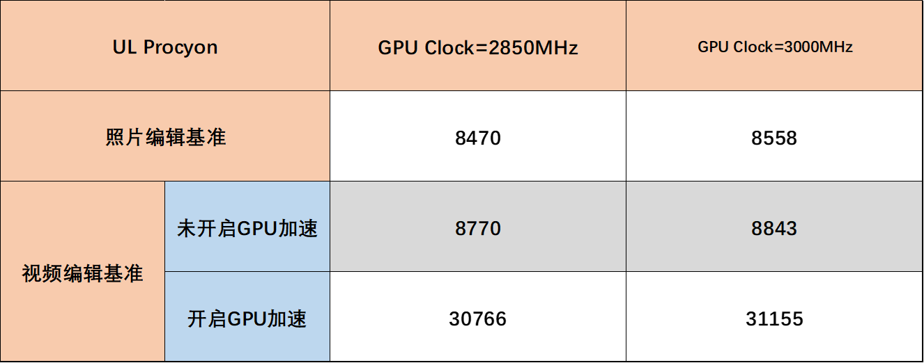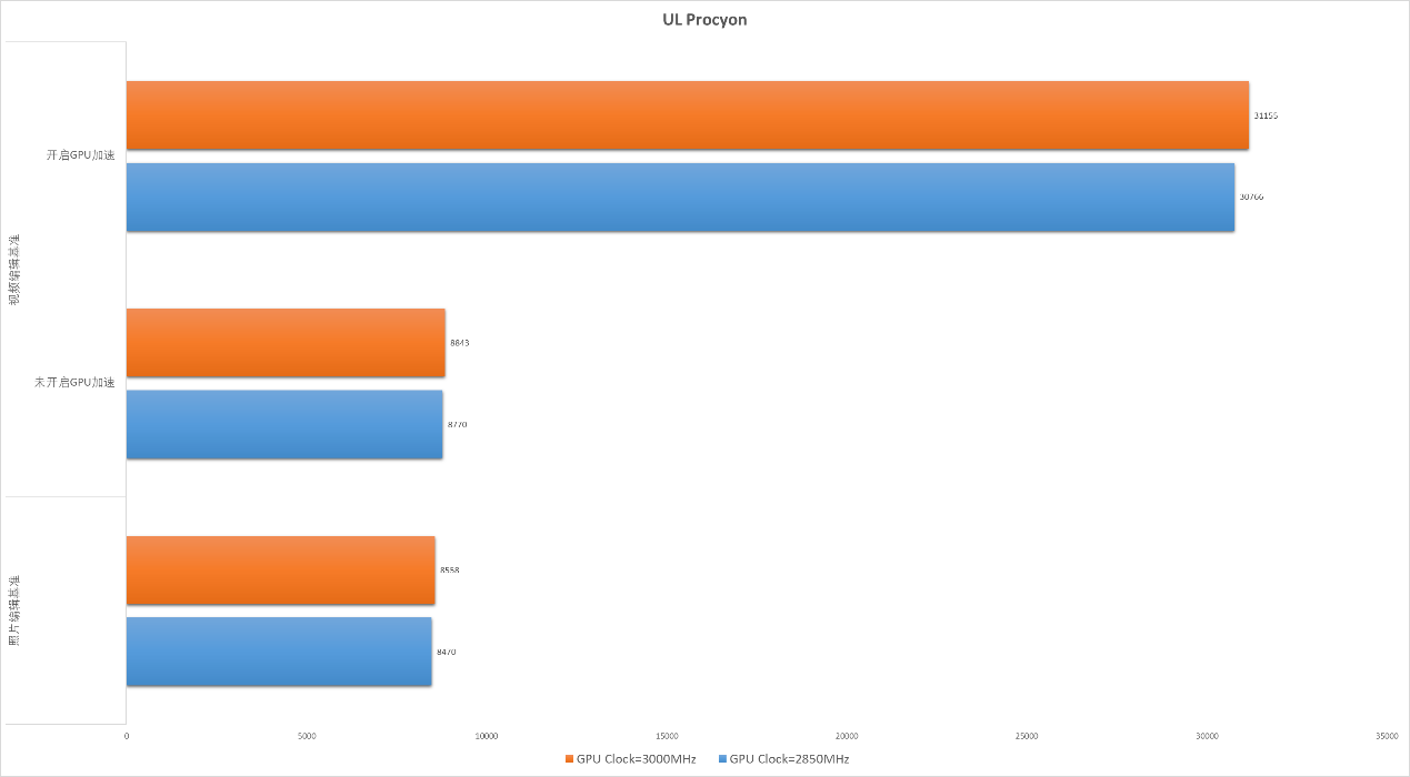 ▲使用UL Procyon 工具进行了简单测试,在照片编辑基准测试中,铭瑄 Intel Arc B580 iCraft 显卡的综合成绩为8470分 ▲在视频编辑基准测试中,未开启GPU加速时综合成绩为 8770 分 ▲在视频编辑基准测试中,开启GPU加速时综合成绩为30766 分,再PR中开启GPU加速提升巨大超频模式