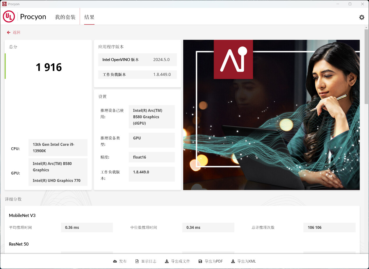 ▲Windows ML GPU Procyon测试,精度float32,得分742 ▲Windows ML GPU Procyon测试,精度float16,得分1353 ▲Windows ML GPU Procyon测试,精度Integer,得分196 ▲Intel OpenVINO GPU Procyon测试,精度float32,得分857 ▲Intel OpenVINO GPU Procyon测试,精度float16,得分1916 ▲Intel OpenVINO GPU Procyon测试,精度Integer,得分2632超频模式