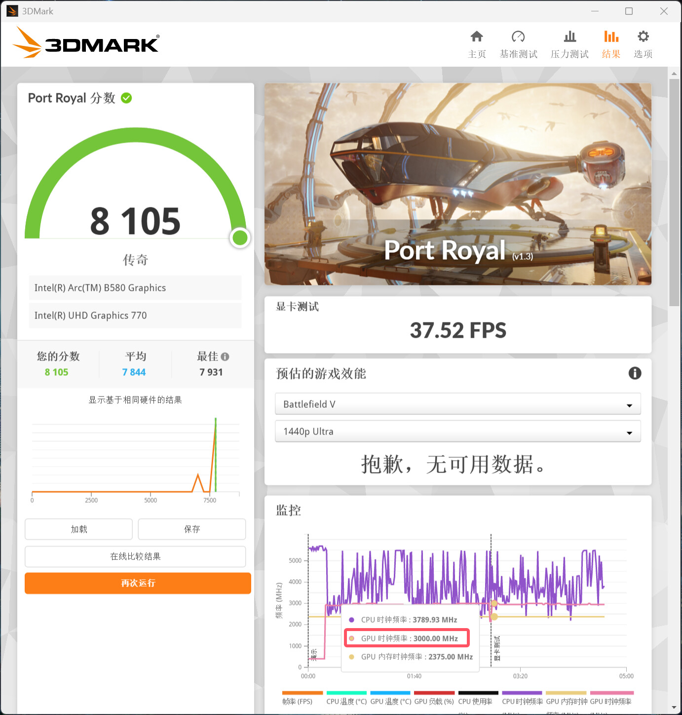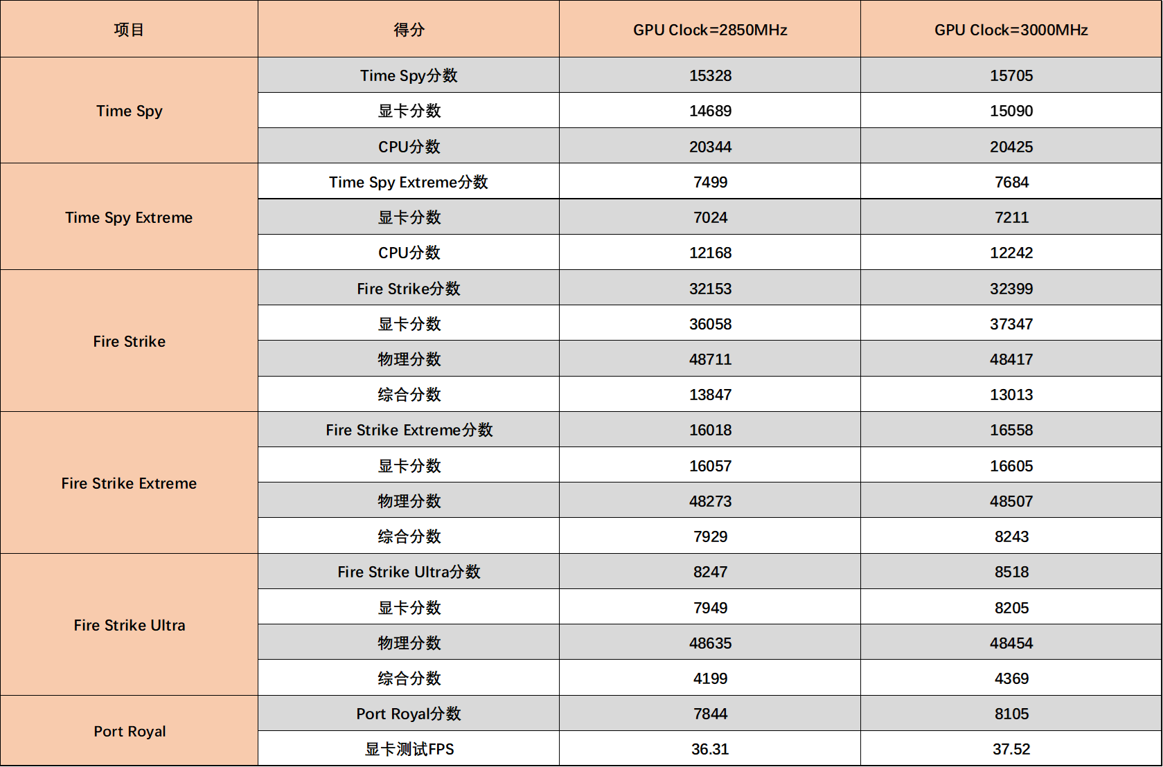 ▲给GPU的频率+150MHz ▲3DMark Port Royal分数8105,显卡测试为37.52FPS ▲3DMark Time Spy Extreme分数7684,显卡分数7211,CPU分数12242 ▲3DMark Time Spy分数15705,显卡分数15090,CPU分数20425 ▲3DMark Fire Strike Ultra分数8518,显卡分数8205,物理分数48454,综合分数4369 ▲3DMark Fire Strike Extreme分数16558,显卡分数16605,物理分数48507,综合分数8243 ▲3DMark Fire Strike分数32399,显卡分数37347,物理分数48417,综合分数13013 ▲数据汇总• 提高GPU频率(从2850MHz到3000MHz)对整体性能有显著的提升,特别是在显卡分数和整体得分方面,提升幅度在2%-3%左右