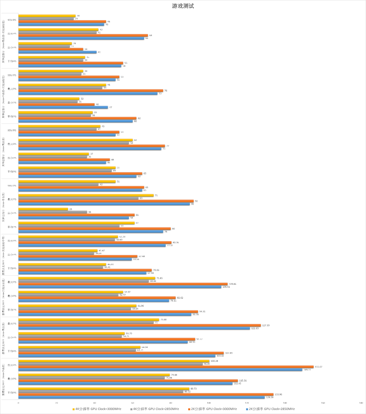 - GPU频率影响:在不同GPU频率(2850MHz和3000MHz)下,FPS表现略有差异,但总体趋势一致,提升GPU频率会提高游戏性能,但受益不高