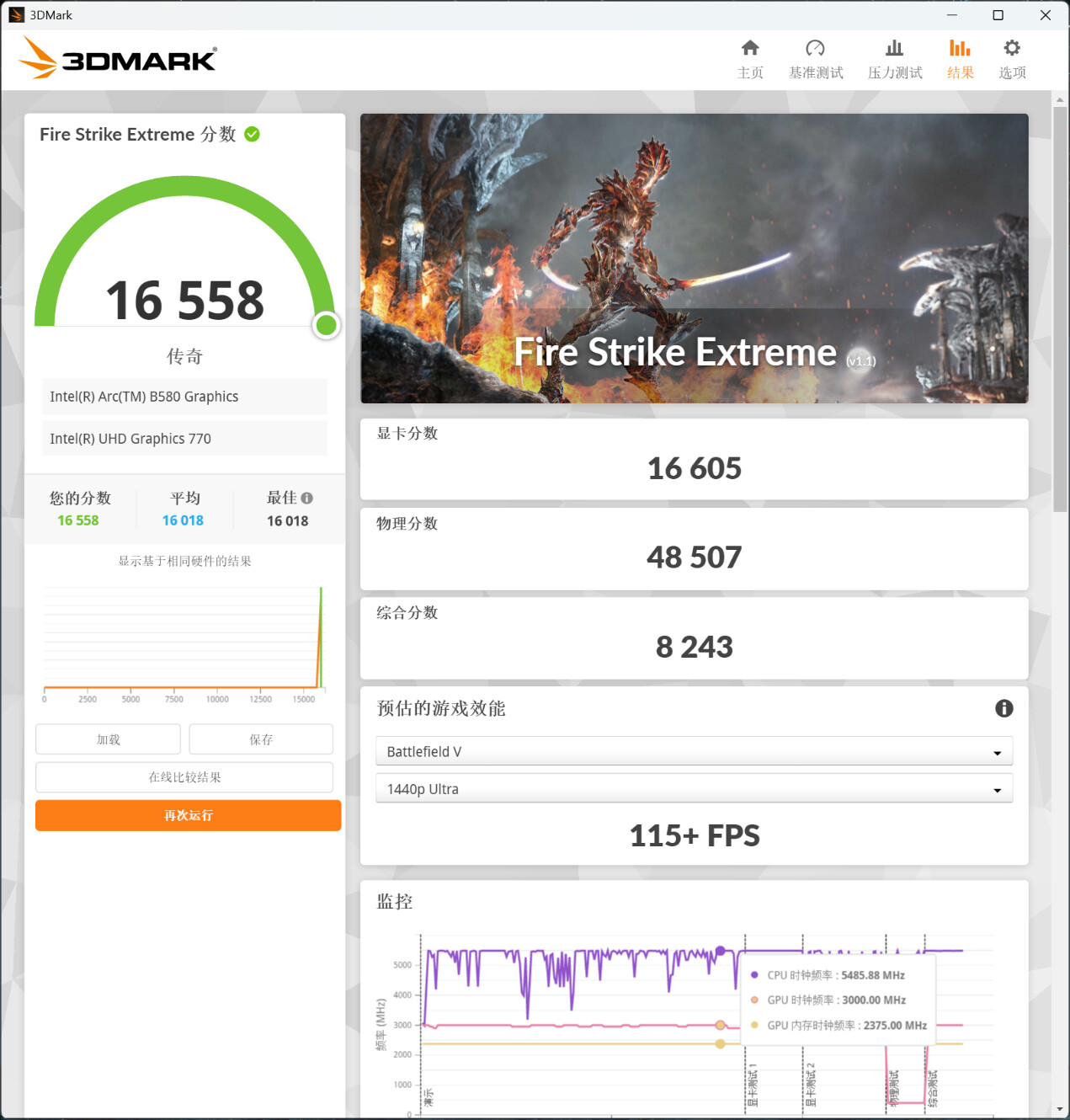 ▲3DMark Port Royal分数7844,显卡测试为36.31FPS ▲3DMark Time Spy Extreme分数7499,显卡分数7024,CPU分数12168 ▲3DMark Time Spy分数15328,显卡分数14689,CPU分数20344 ▲3DMark Fire Strike Ultra分数8247,显卡分数7949,物理分数48635,综合分数4199 ▲3DMark Fire Strike Extreme分数16018,显卡分数16057,物理分数48273,综合分数7929 ▲3DMark Fire Strike分数32153,显卡分数36058,物理分数48711,综合分数13847超频模式